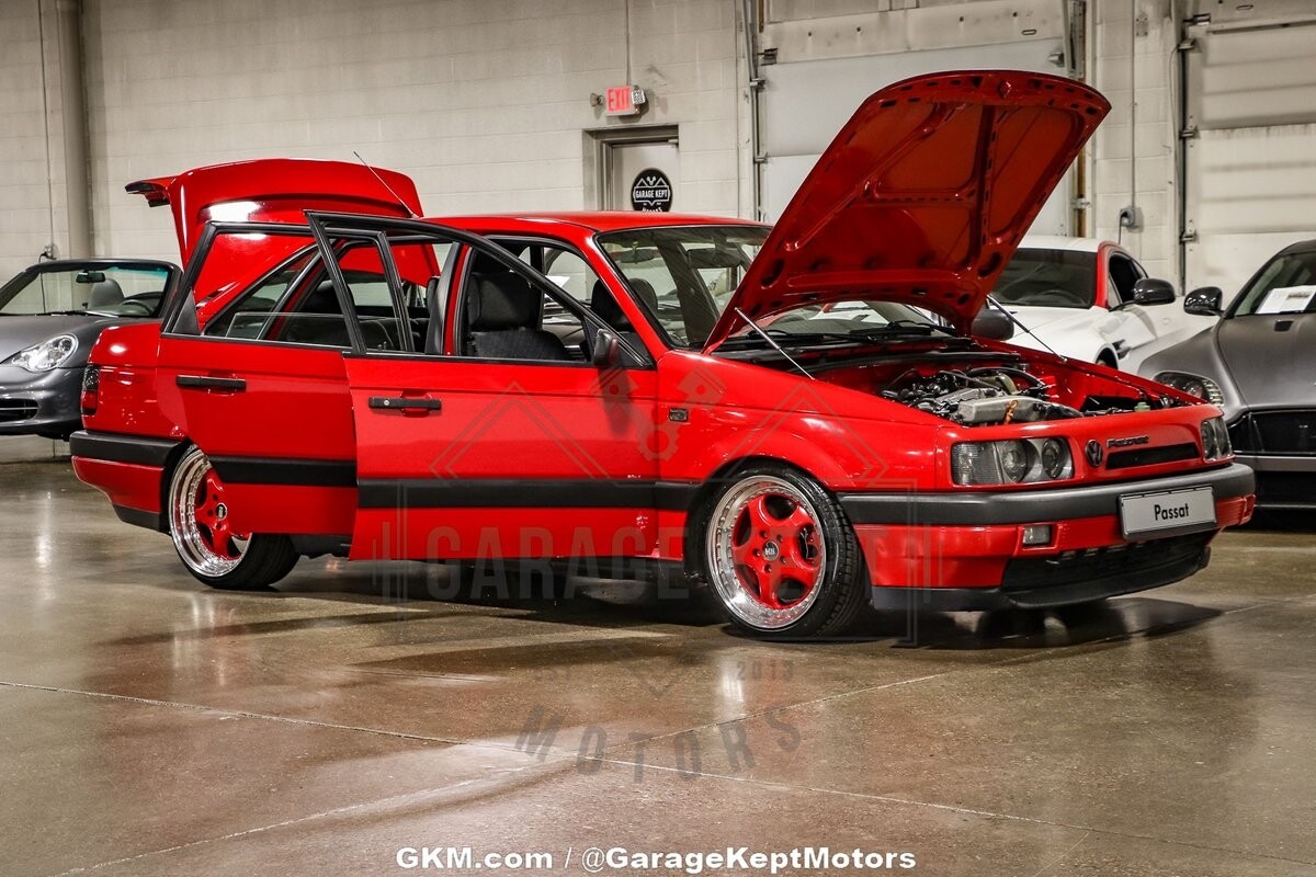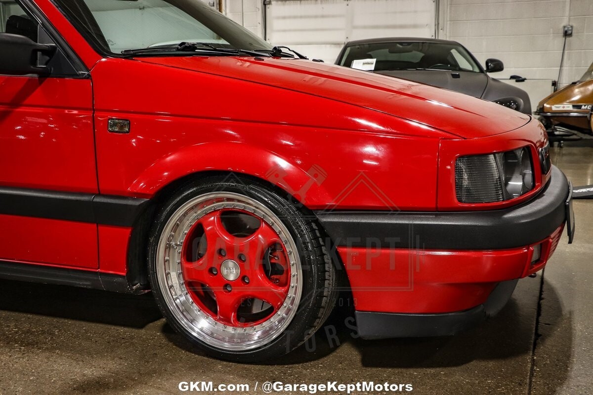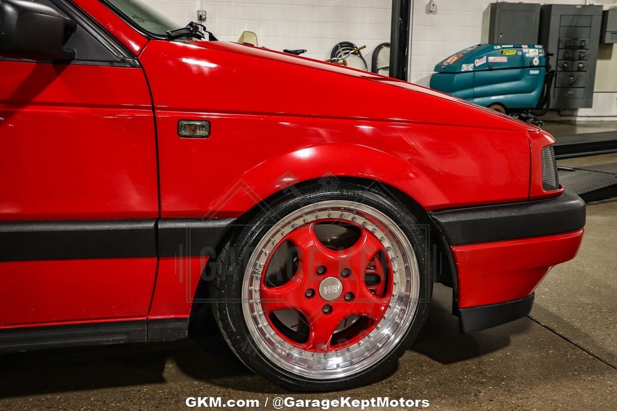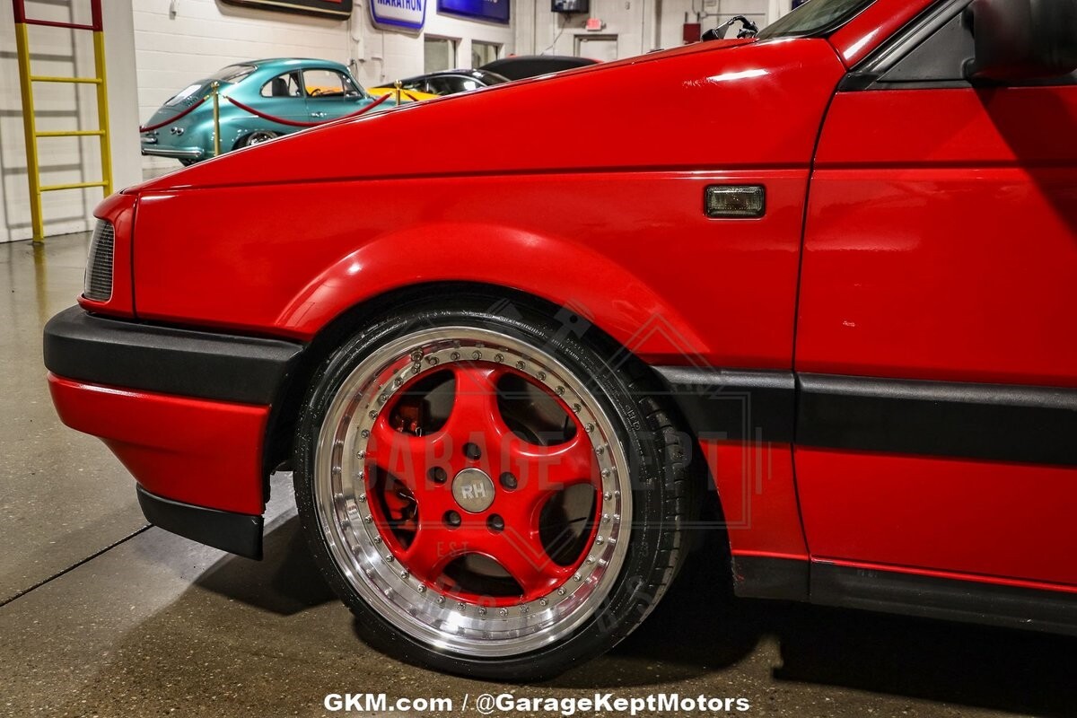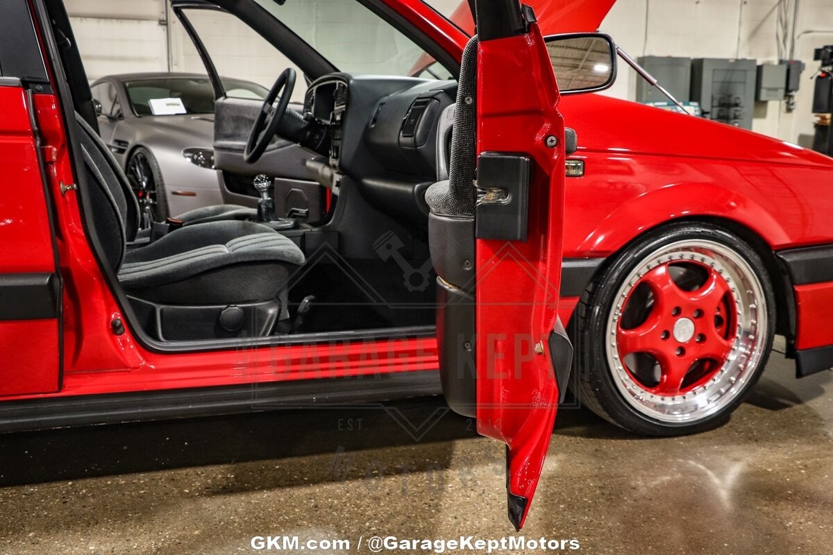 The suspension of this Passat has been meticulously addressed with BC Racing Coilovers and tubular front control arms, offering a dynamic and controlled ride. Upgraded brakes contribute to improved stopping power, ensuring a confident driving experience. The exterior of the car is adorned in a striking red hue, providing a vibrant and eye-catching presence on the road. The paint-matched RH wheels add a touch of cohesiveness to the overall design, completing the car's unique and attention-grabbing look.