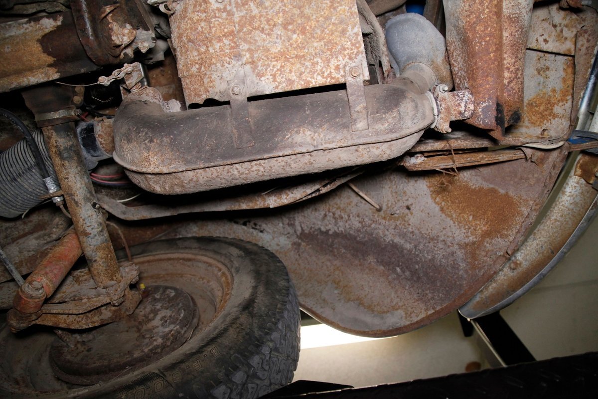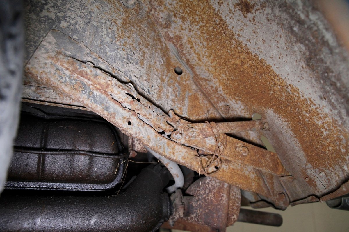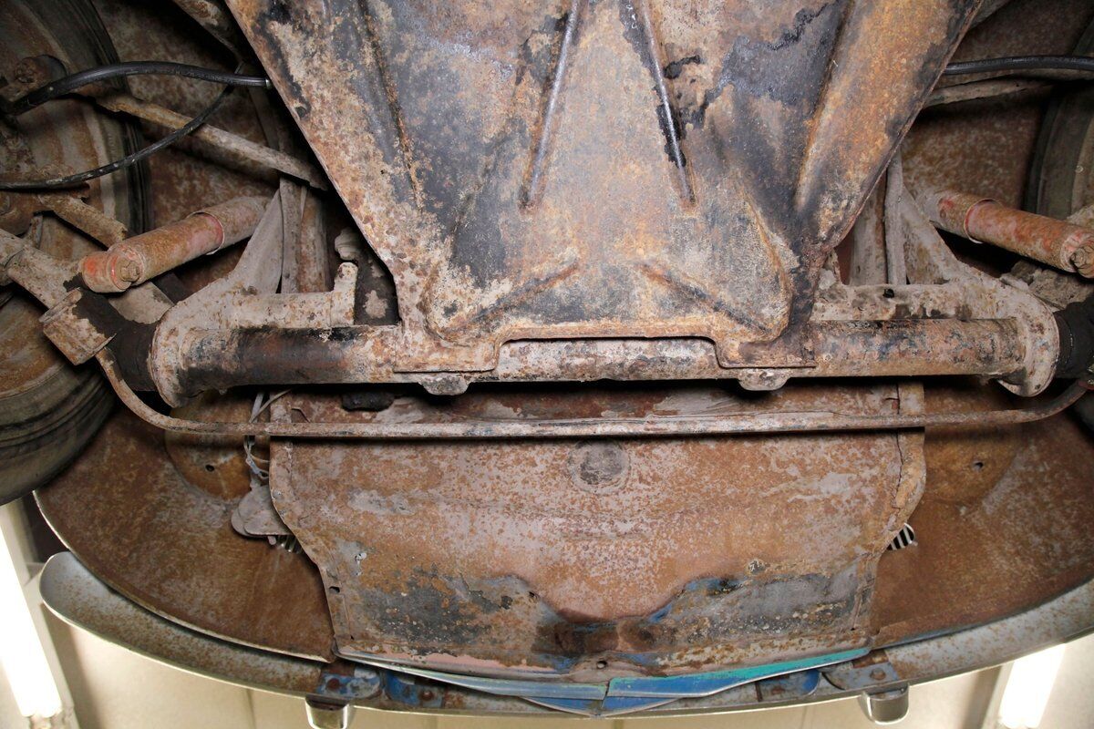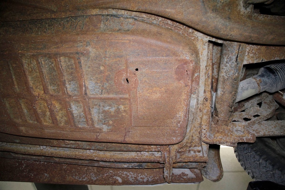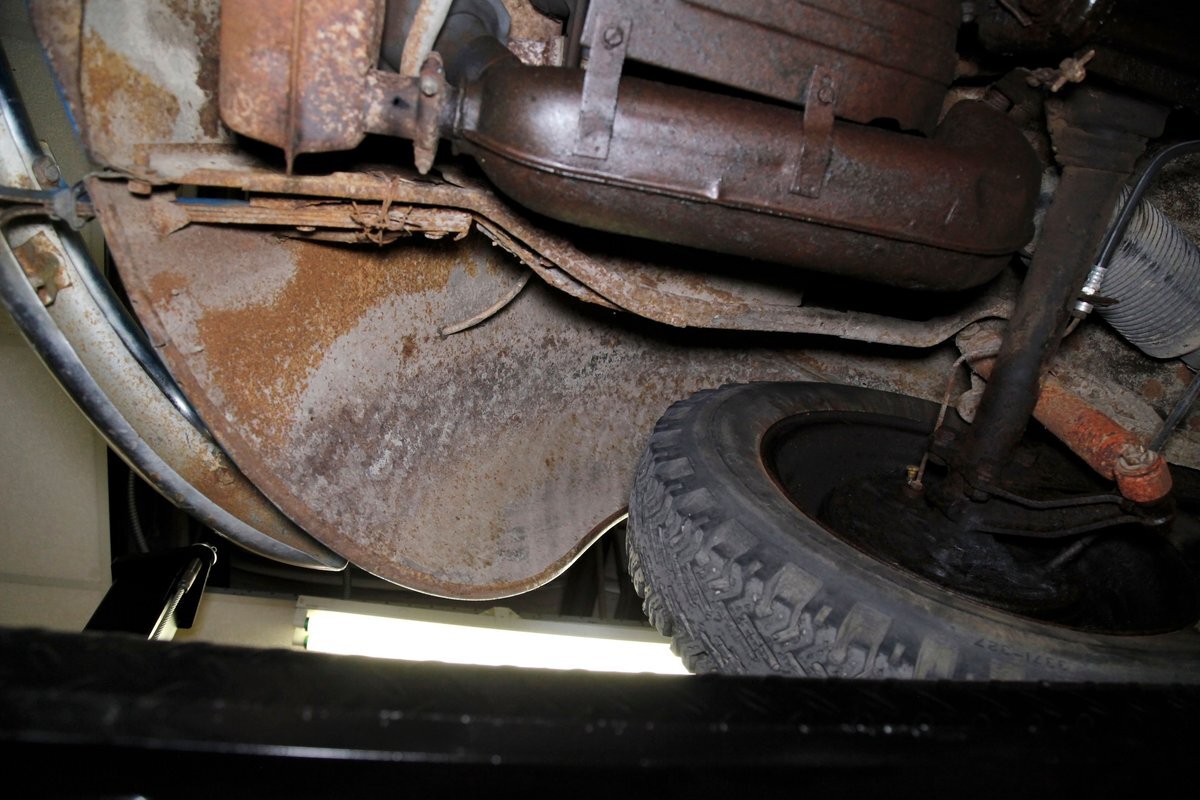 Moderate to heavy surface rust is attaching itself to all the various parts on the undercarriage. Steel stamped floor pans have just a few holes of invasive rust. For the suspension, it shows as independent transverse torsion bars upfront, and independent swing axle trailing arm with torsion bars on the rear. Drum brakes are on all 4 corners to bring this bug to a safe and stable halt. All are surface rusted.