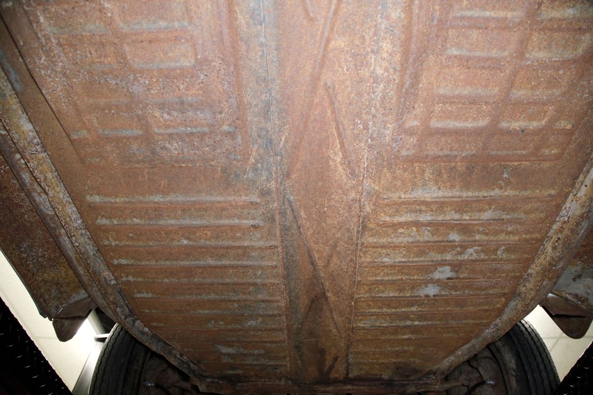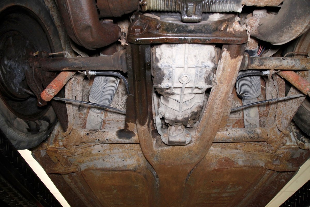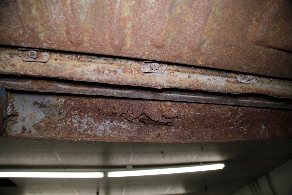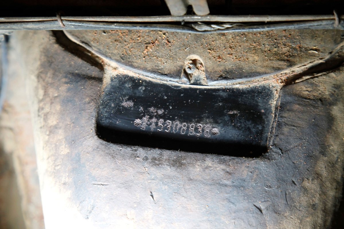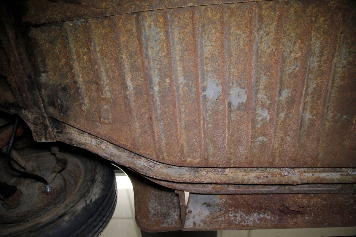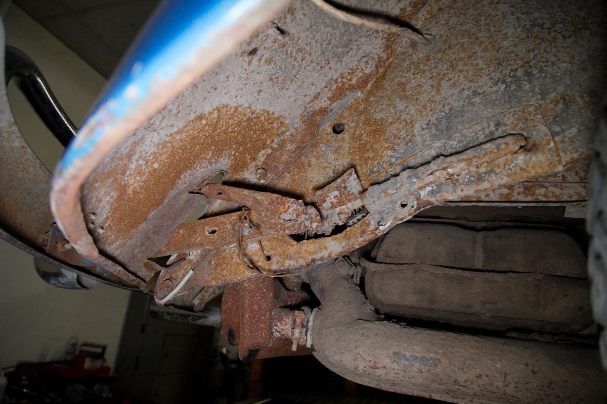 Moderate to heavy surface rust is attaching itself to all the various parts on the undercarriage. Steel stamped floor pans have just a few holes of invasive rust. For the suspension, it shows as independent transverse torsion bars upfront, and independent swing axle trailing arm with torsion bars on the rear. Drum brakes are on all 4 corners to bring this bug to a safe and stable halt. All are surface rusted.