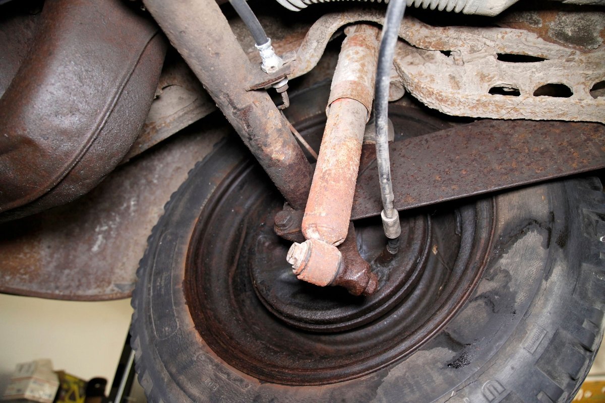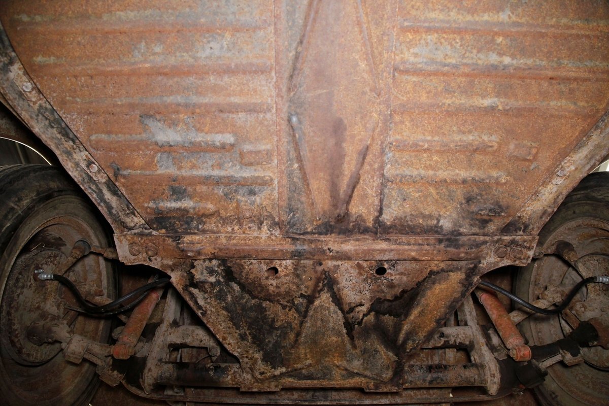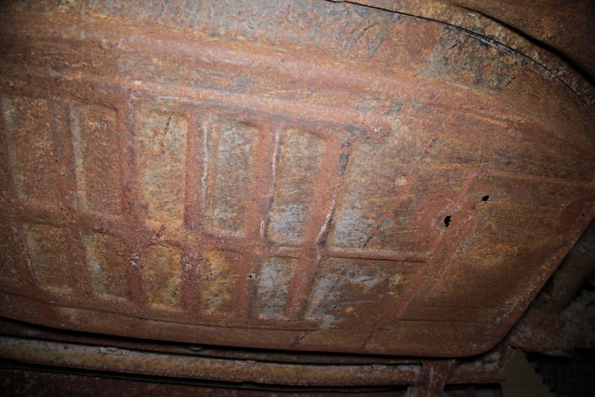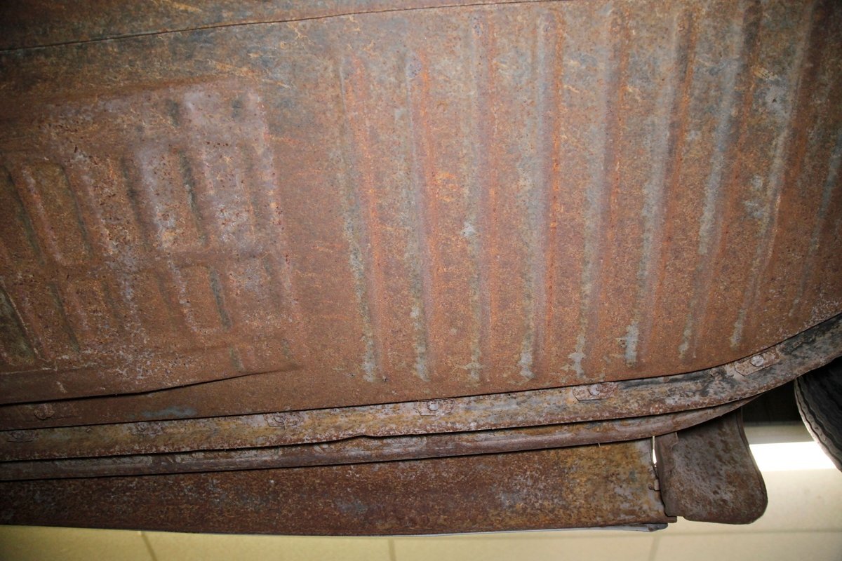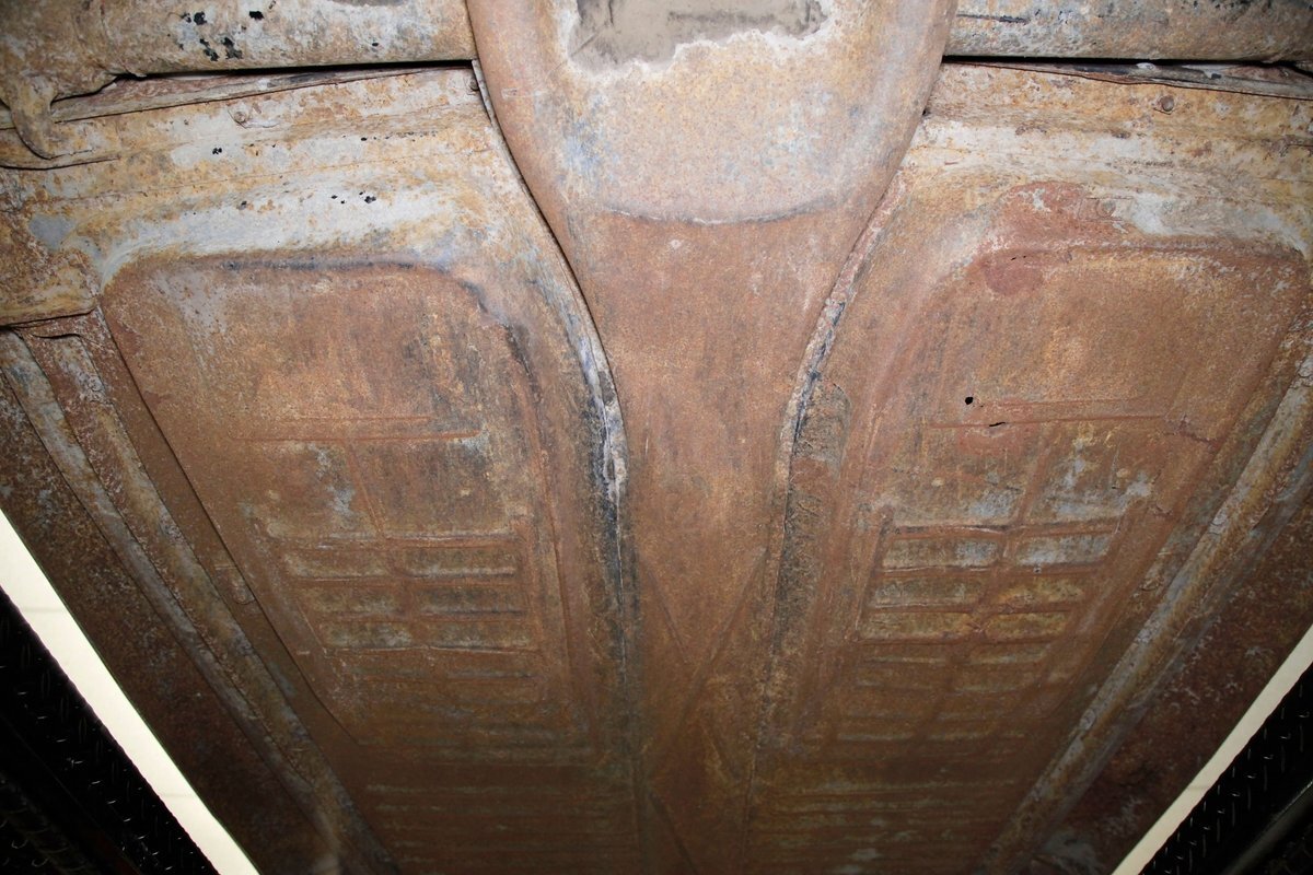 Moderate to heavy surface rust is attaching itself to all the various parts on the undercarriage. Steel stamped floor pans have just a few holes of invasive rust. For the suspension, it shows as independent transverse torsion bars upfront, and independent swing axle trailing arm with torsion bars on the rear. Drum brakes are on all 4 corners to bring this bug to a safe and stable halt. All are surface rusted.