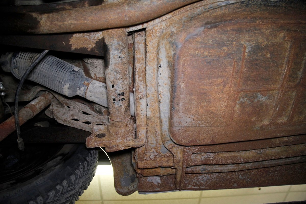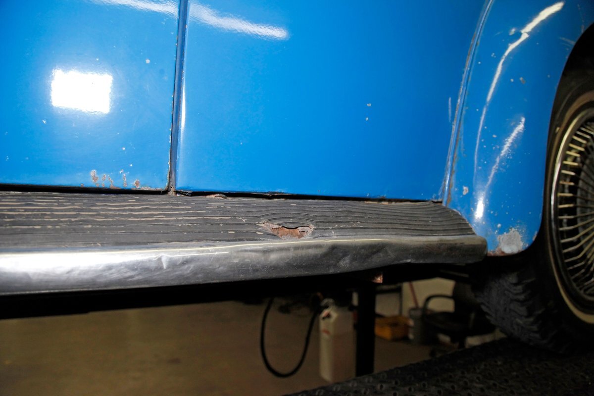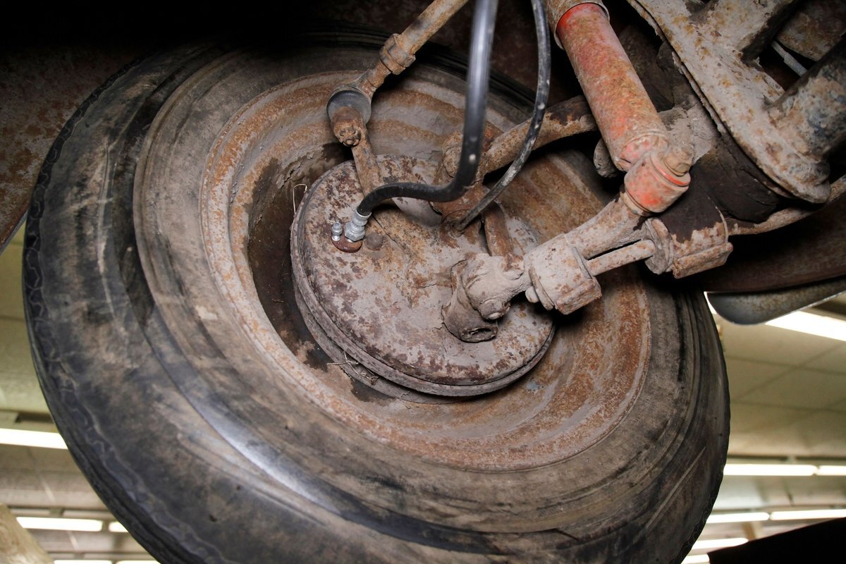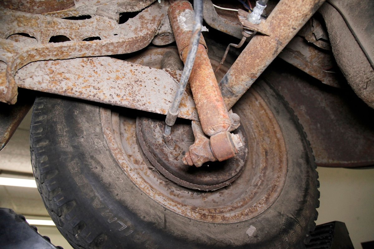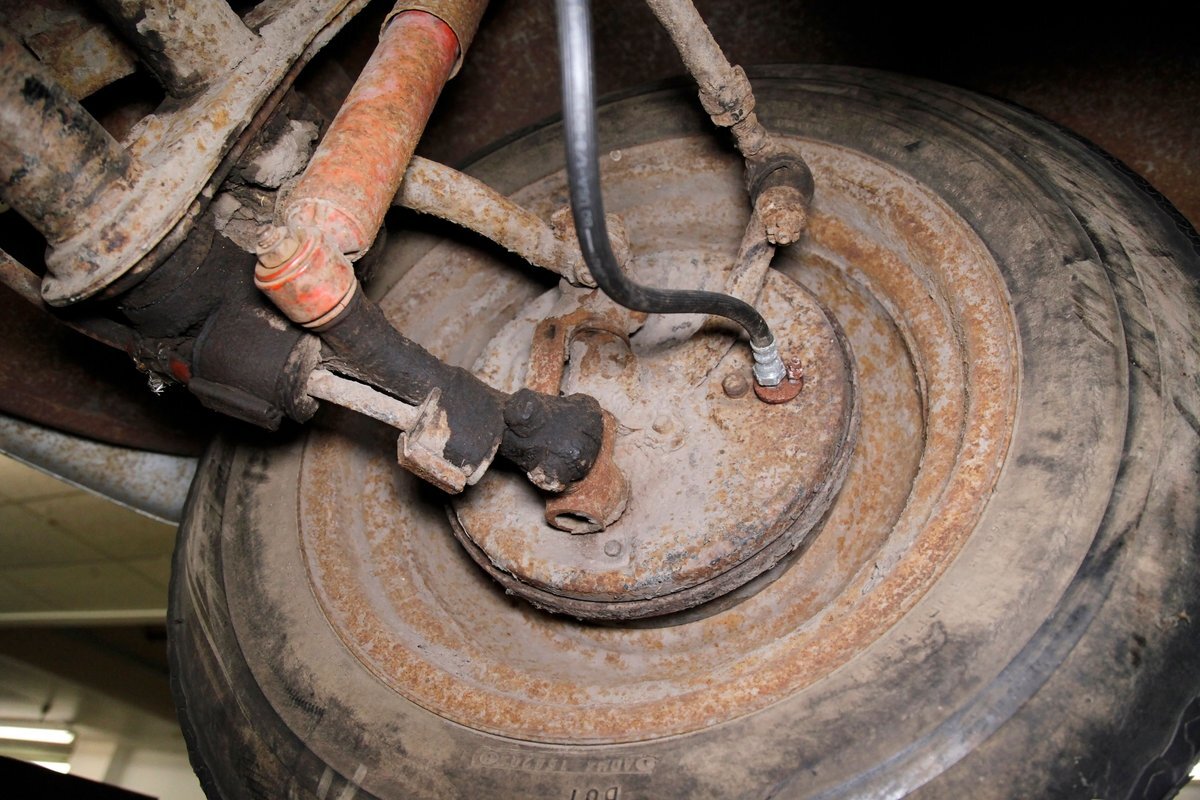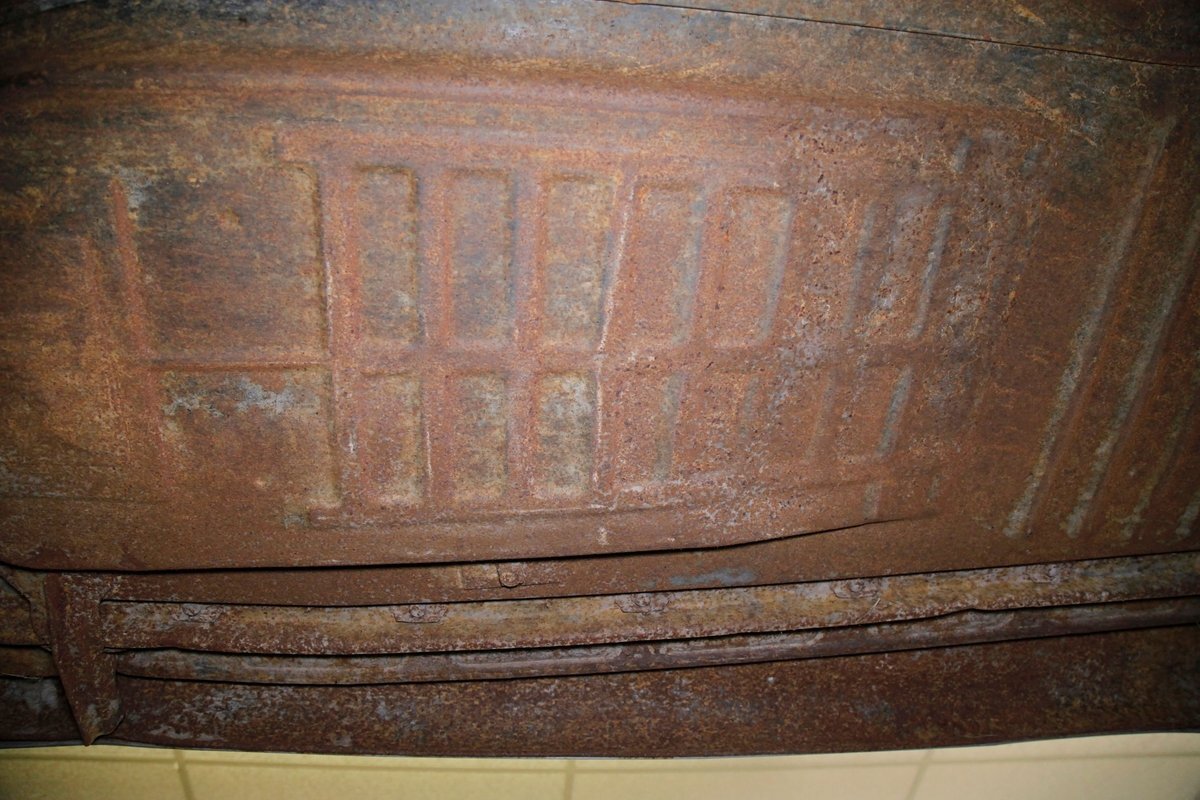 Moderate to heavy surface rust is attaching itself to all the various parts on the undercarriage. Steel stamped floor pans have just a few holes of invasive rust. For the suspension, it shows as independent transverse torsion bars upfront, and independent swing axle trailing arm with torsion bars on the rear. Drum brakes are on all 4 corners to bring this bug to a safe and stable halt. All are surface rusted.