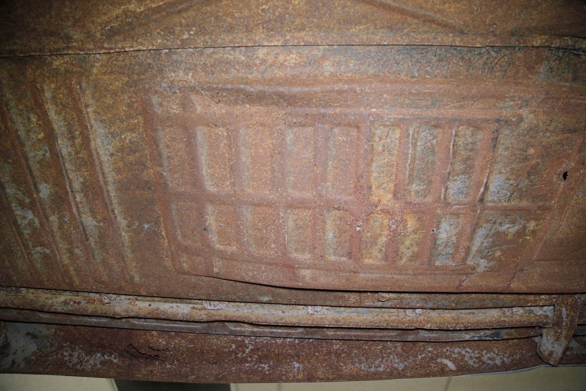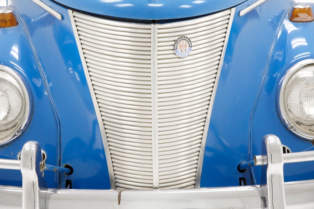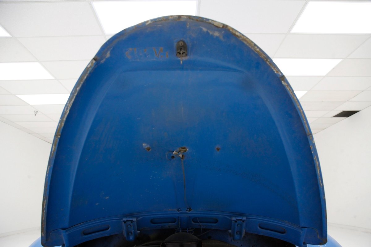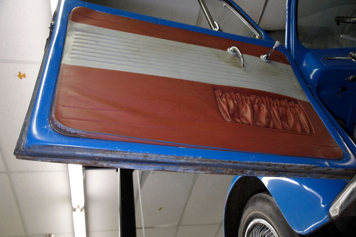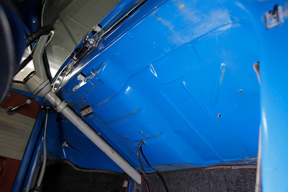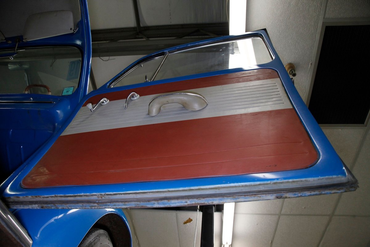 A swing of the door and we see blue metal painted surrounding a gray and red horizontally ribbed alternating color vinyl panel complete with the door handle, window crank, and a vinyl armrest. Black vinyl VW high back bucket seats are in front and the drivers seat has lots of tears and shows the padding beneath the vinyl. A simple rear seat is a long bench and stretches from C pillar to C pillar. This also has some damage in its top ledge. Black stippled rubber is on the floors, and some rubber protective mats are above. A simple blue full metal jacket painted dash with circular speedometer and square gas gauge sit within the vertical ribbed speaker area which is fronted by an original steering wheel in good condition with the Castle Wolfsburg logo in the center of the half round chrome horn ring. An AM radio is also mounted in the dash and fits nicely although may not be original to this car. The headliner is white, is nice and tight and shows some smudging and dirt areas as well as a tear.