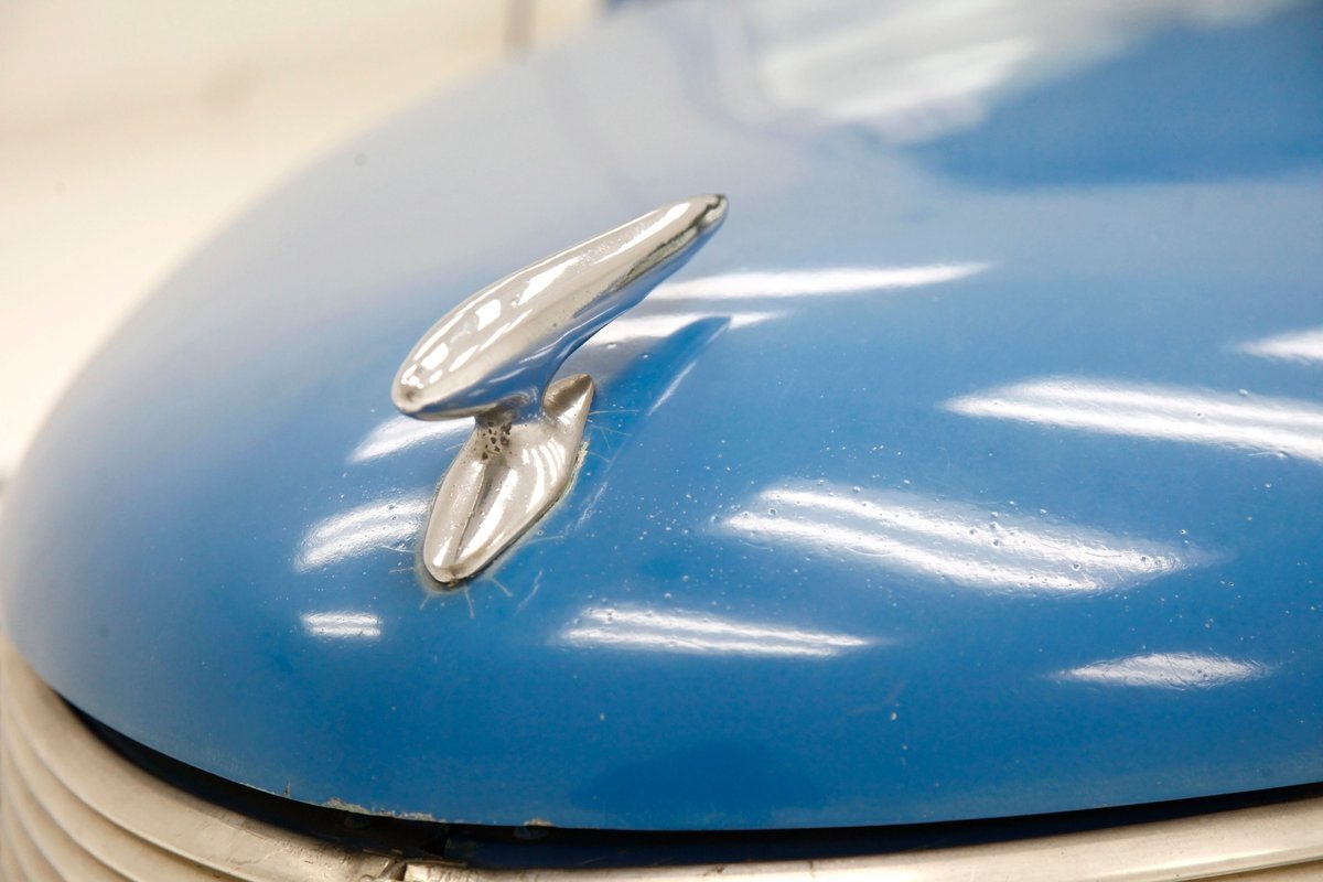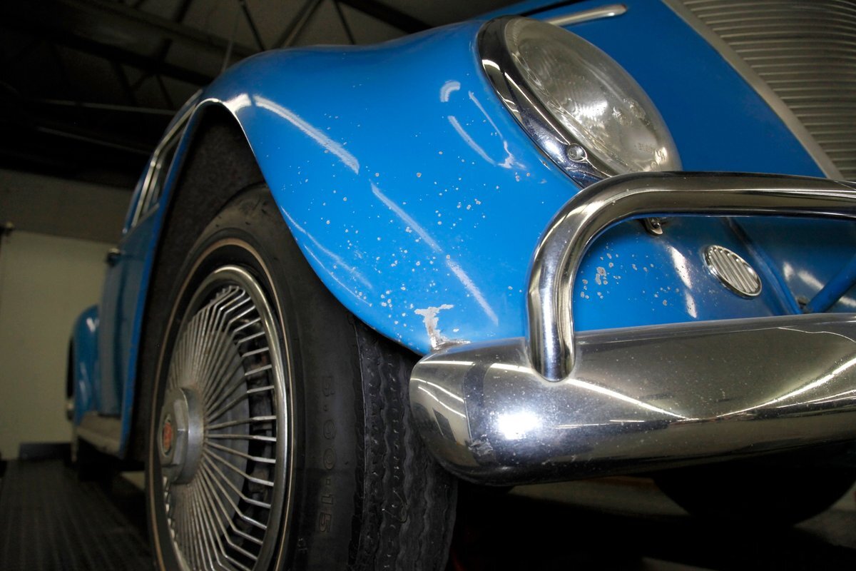 I'm blue blue blue says this touch of class with this Beetle and that paint that adorns the curved steel paneled Beetle shaped V-dub. Only minor inclusions are apparent in the finish, but one really has to look to find them. The chrome is nicely preserved in the bumpers, trim, and any badging which shines wonderfully in the strong Pennsylvania summer sun. The gaps are very nice, and the cute little running board is all solid. Highlights would be for this writer the swooping beltline molding on either side of the car which has a great line, the addition of chrome bumper overriders or bed rails if you will, and the twin chromed mini exhaust tips that peek out from under the curved bumper... but the highlighter is of course the vintage vertical grille and modded hood. Gone is the rounded look now replaced by a ling 1930's-esque hood college with an "aero" Art Deco hood ornament. Fancy schmancy to say the least. Looking good for this buggy come Art Deco inspired roadster.