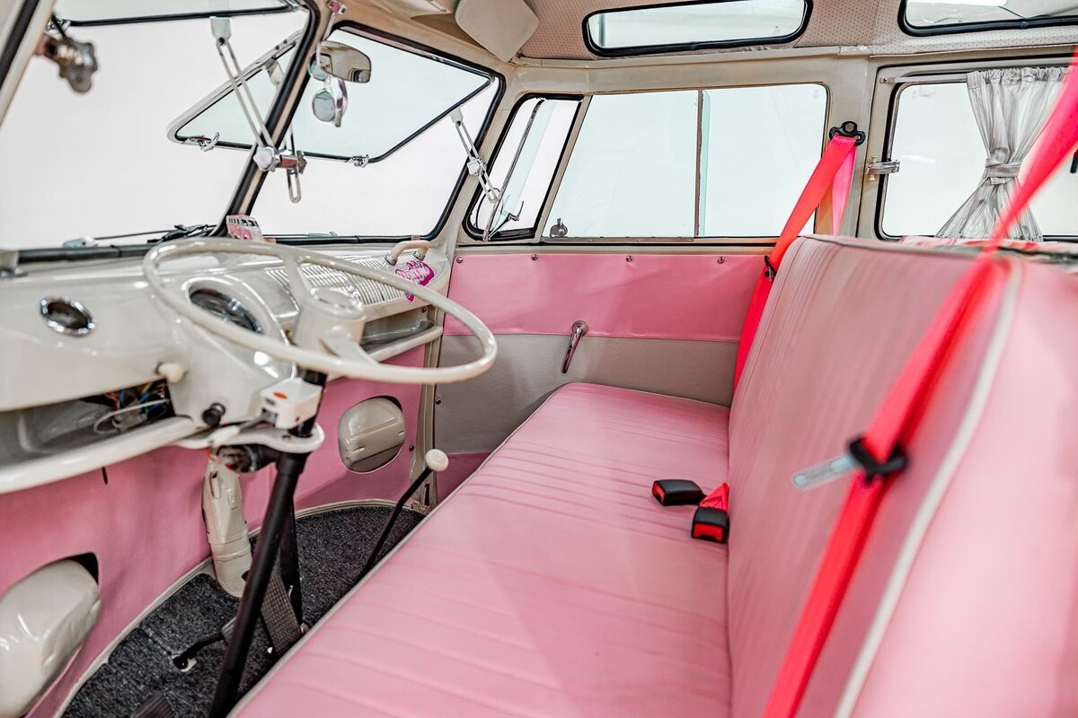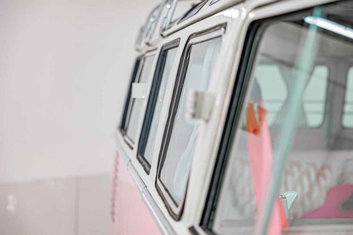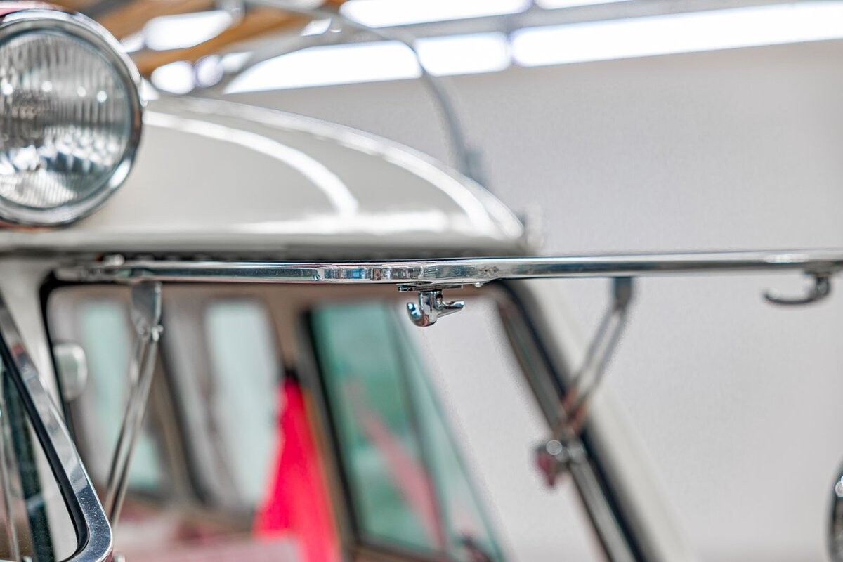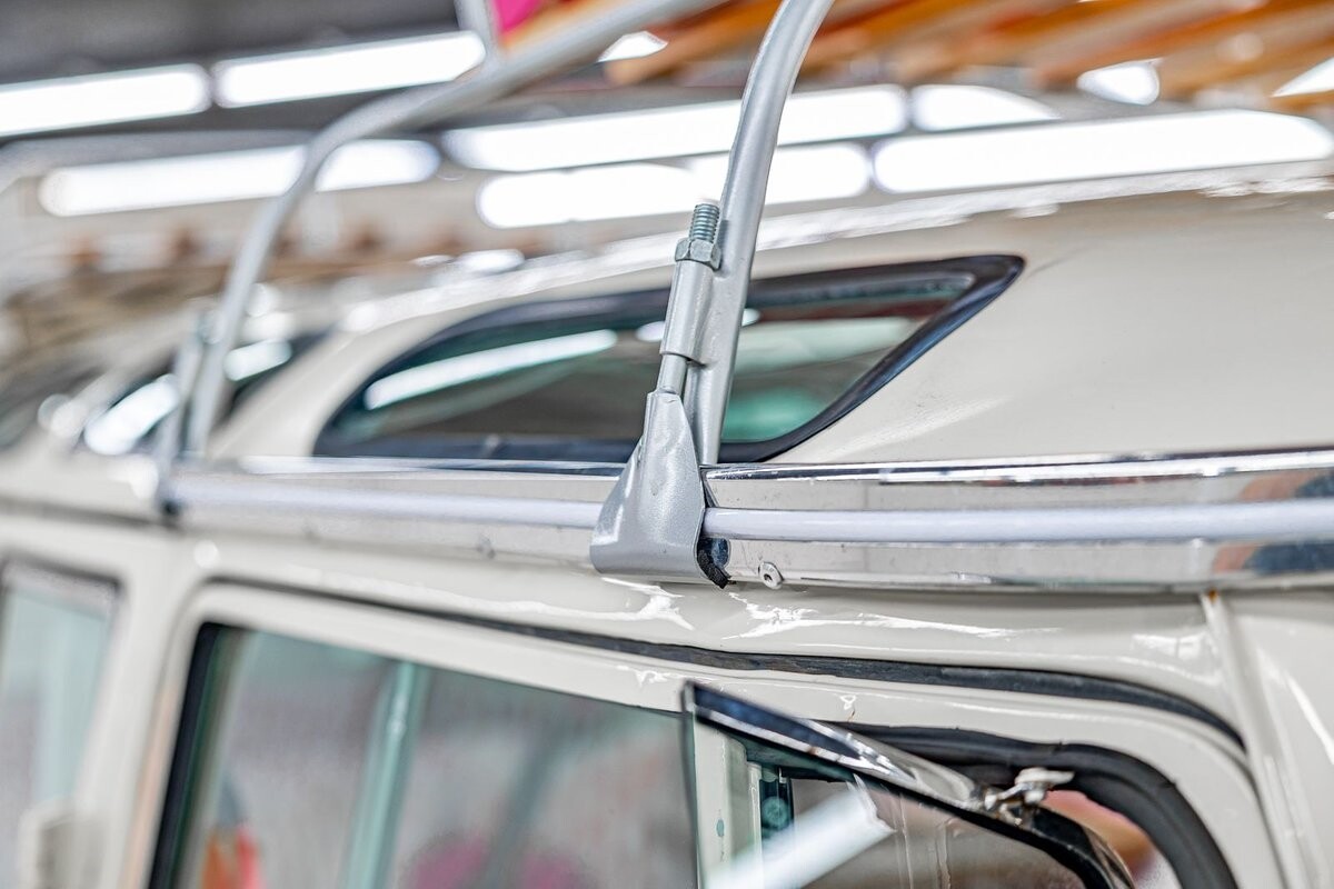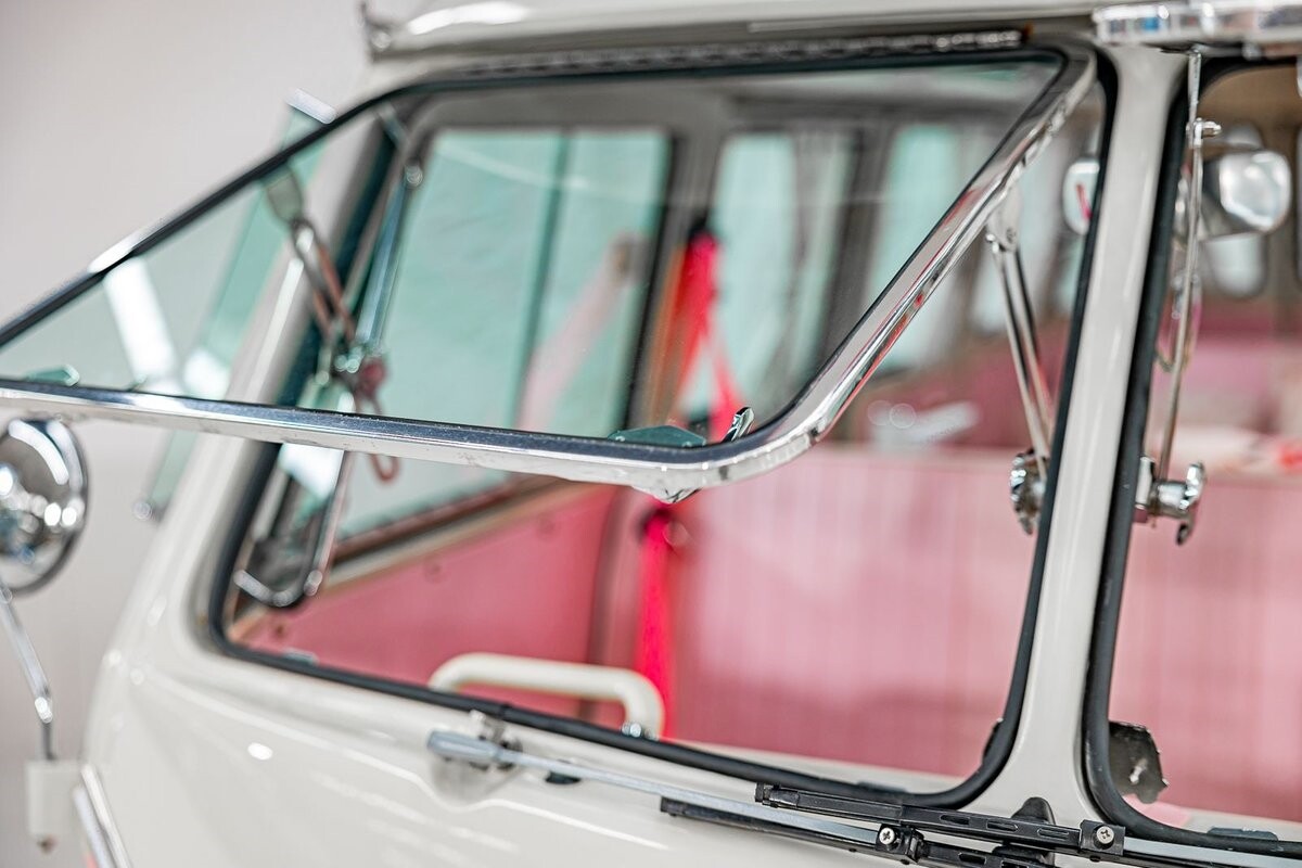 EXTERIOR: This Samba is decked out. It has the famous 23 windows, two luggage racks with a ladder, a sliding convertible roof with a wind deflector and cyclops light. Many of the windows pop open including the two front safari windshields. It has been completely restored. The body was restored and painted. The paint is smooth and glossy. The two tones are broken up with a polished aluminum band which also enhances the V design in front. The glass and gaskets look new. The convertible roof is new and functions easily. Mirrors, handles, taillights and the chrome VW in front all look new. It rides on new radial tires with white walls. The rims are painted and have new trim.