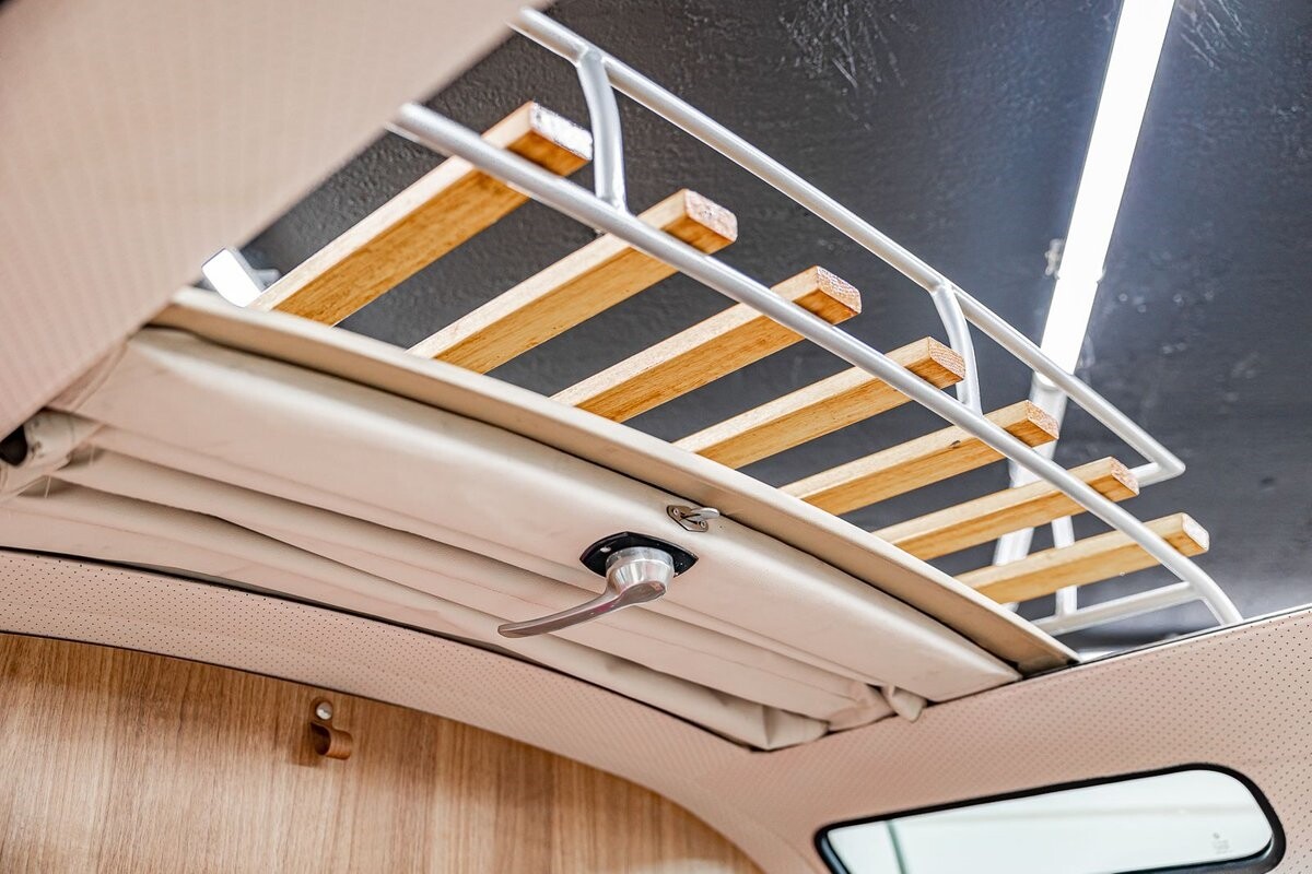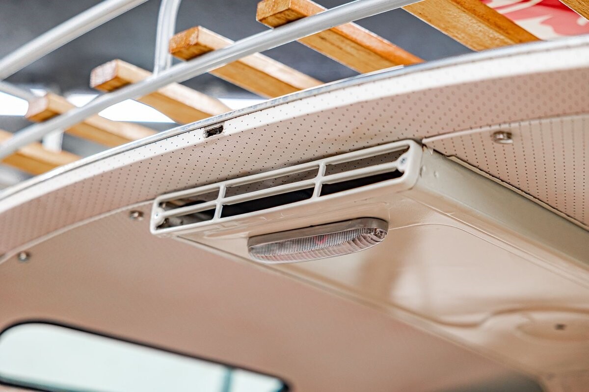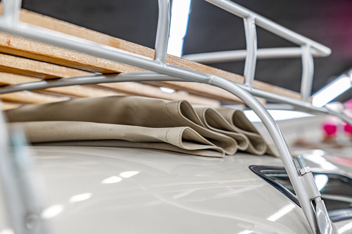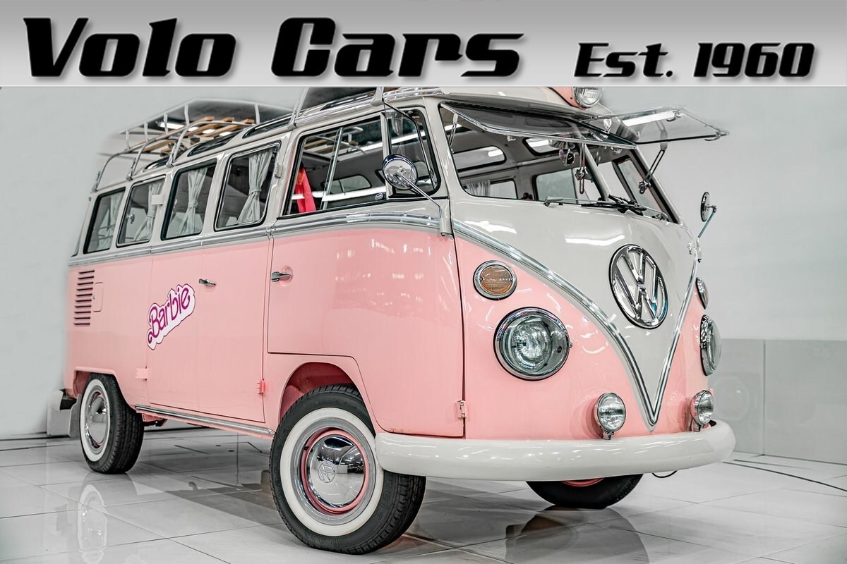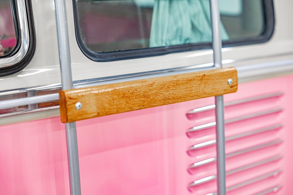 EXTERIOR: This Samba is decked out. It has the famous 23 windows, two luggage racks with a ladder, a sliding convertible roof with a wind deflector and cyclops light. Many of the windows pop open including the two front safari windshields. It has been completely restored. The body was restored and painted. The paint is smooth and glossy. The two tones are broken up with a polished aluminum band which also enhances the V design in front. The glass and gaskets look new. The convertible roof is new and functions easily. Mirrors, handles, taillights and the chrome VW in front all look new. It rides on new radial tires with white walls. The rims are painted and have new trim.