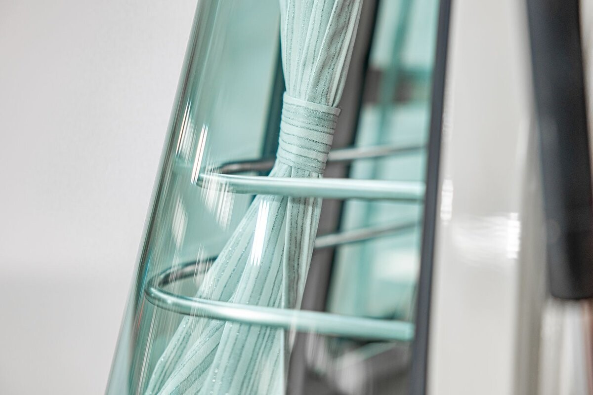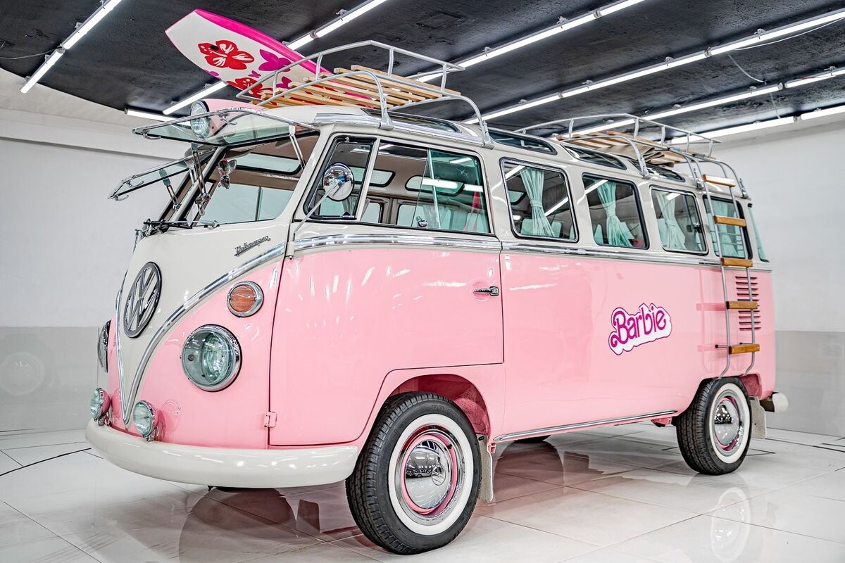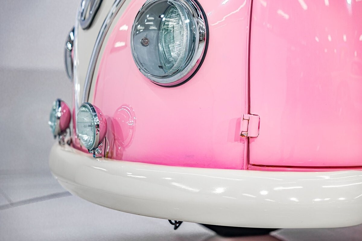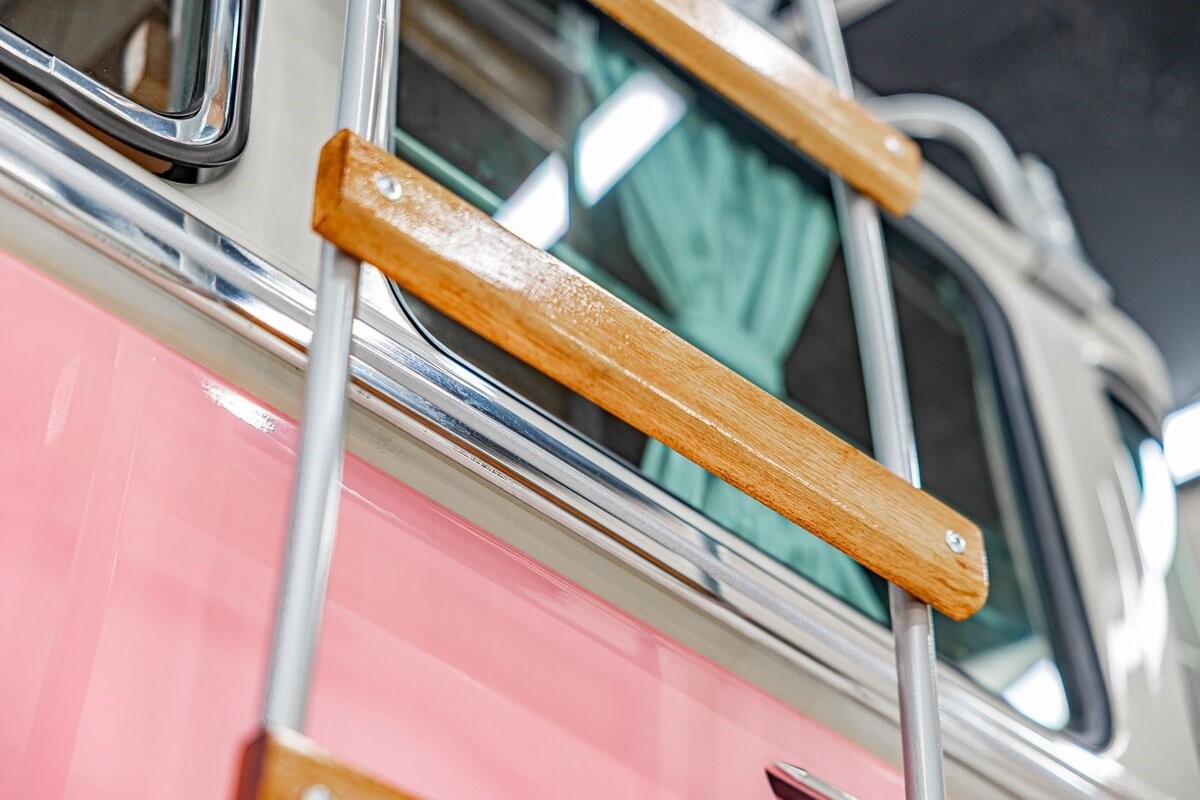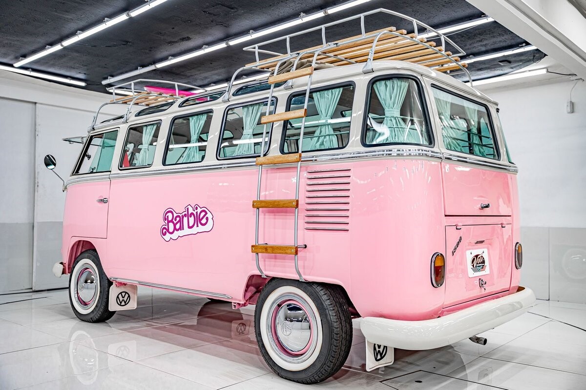 EXTERIOR: This Samba is decked out. It has the famous 23 windows, two luggage racks with a ladder, a sliding convertible roof with a wind deflector and cyclops light. Many of the windows pop open including the two front safari windshields. It has been completely restored. The body was restored and painted. The paint is smooth and glossy. The two tones are broken up with a polished aluminum band which also enhances the V design in front. The glass and gaskets look new. The convertible roof is new and functions easily. Mirrors, handles, taillights and the chrome VW in front all look new. It rides on new radial tires with white walls. The rims are painted and have new trim.