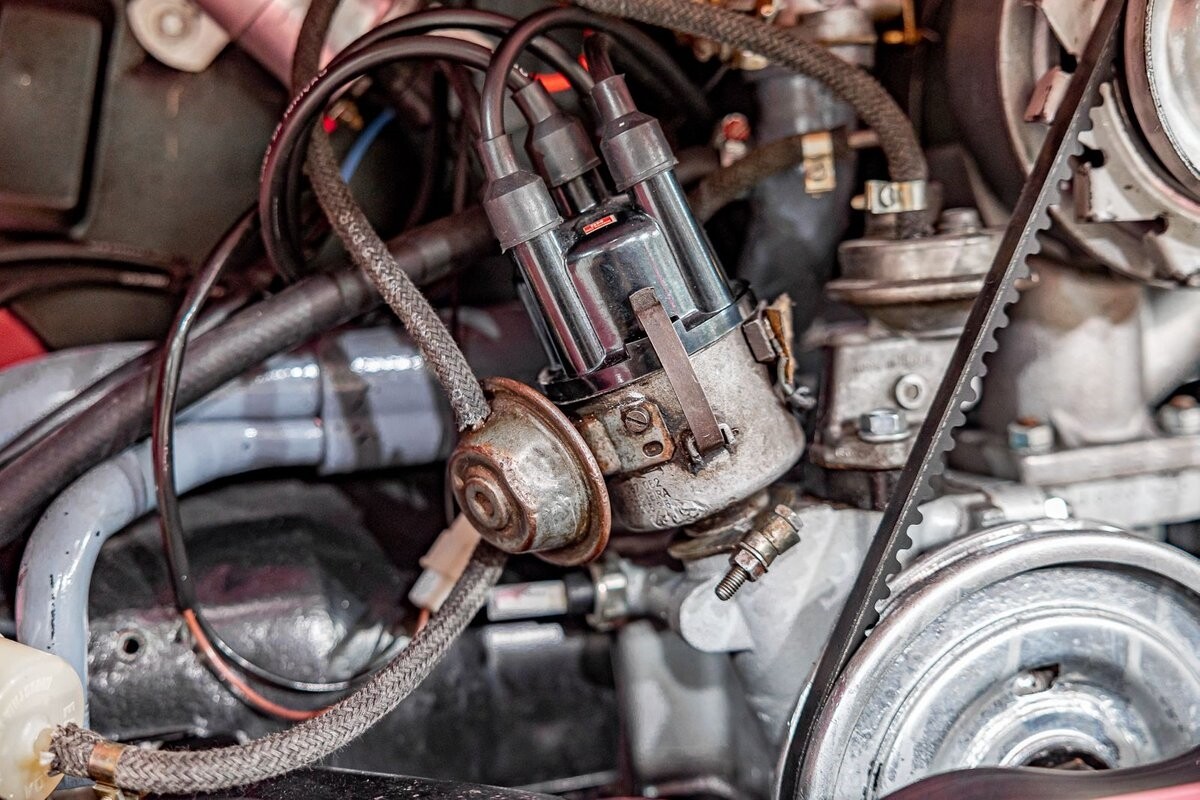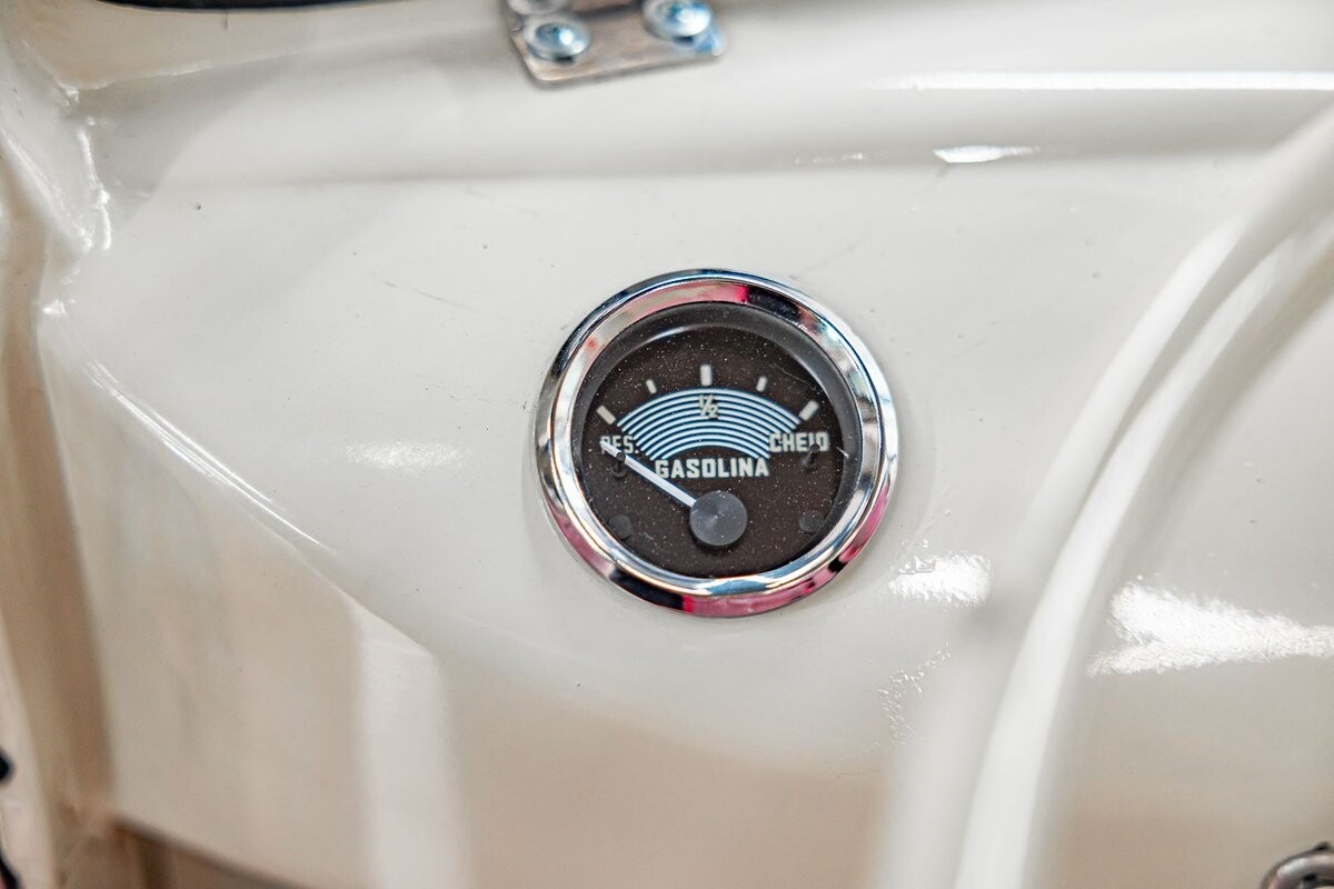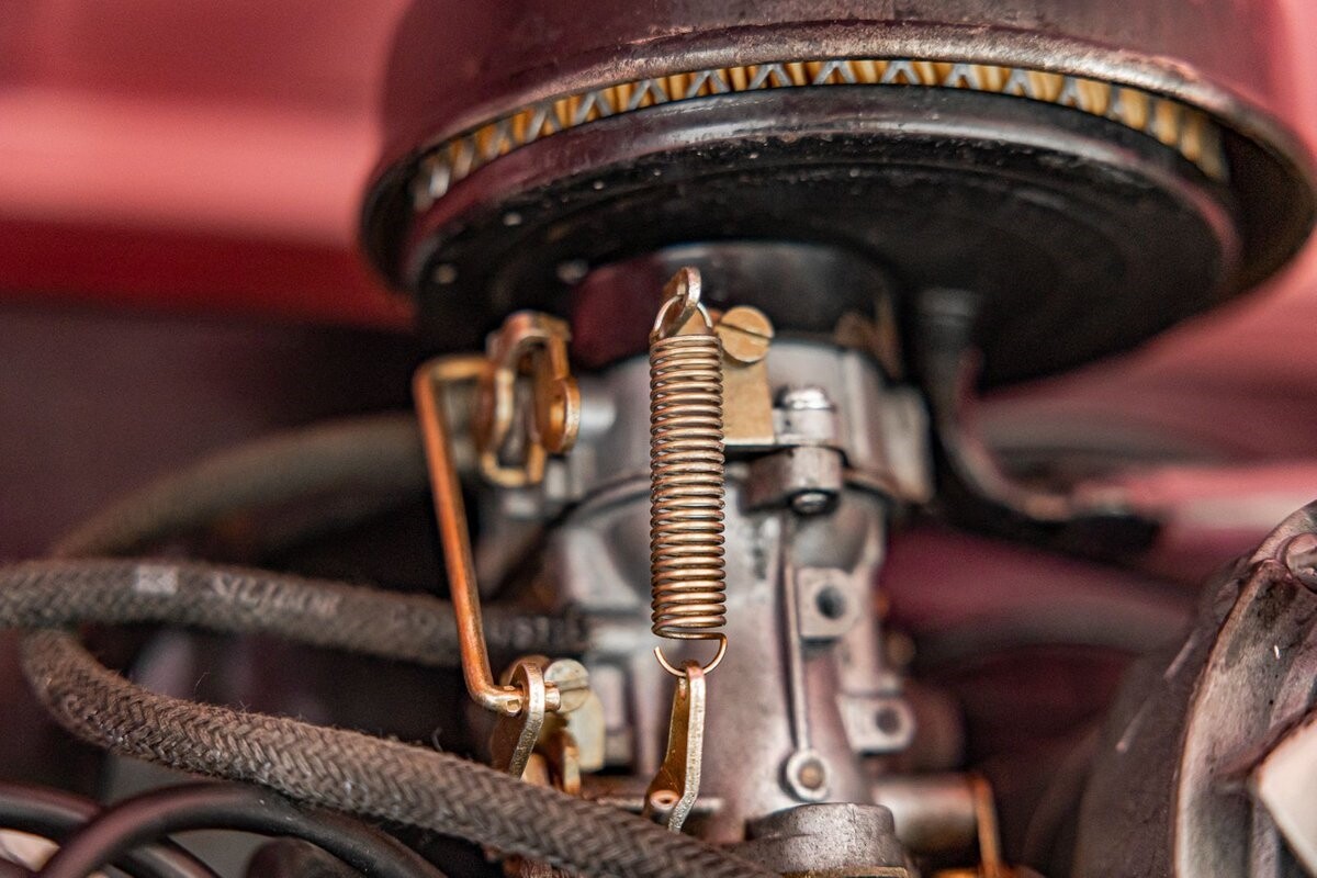 ENGINE COMPARTMENT: The 4 cylinder motor was rebuilt. It fires right up and runs great. The components were restored. The alternator, carburetor, distributor look new. I can see a painted gas tank. The engine bay is all solid metal and is painted glossy. There is a new battery and cables.