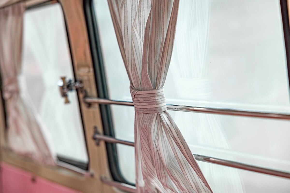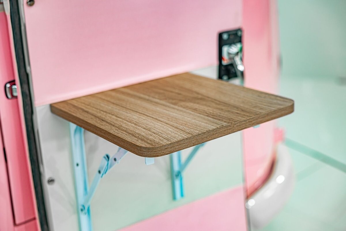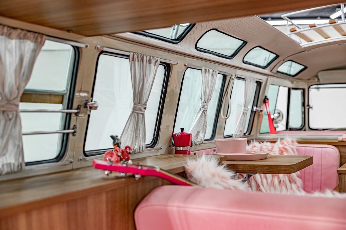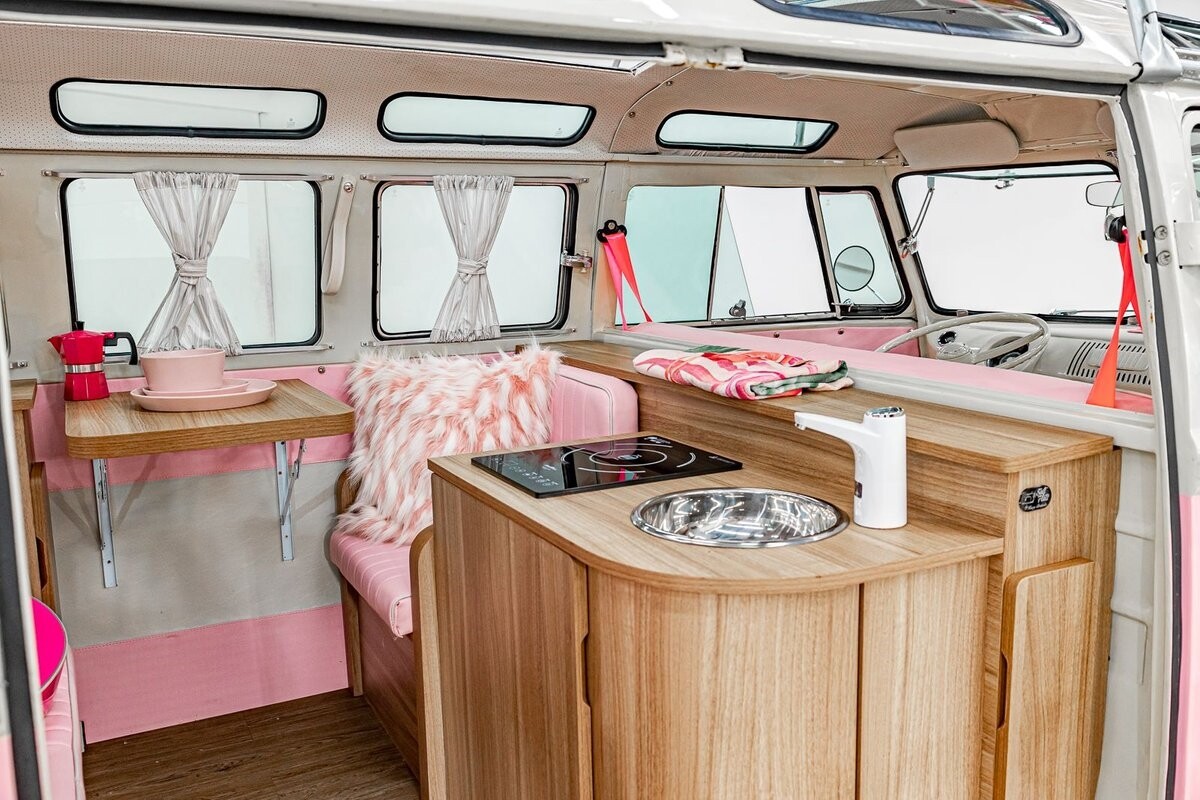 INTERIOR: It is brand new inside this camper bus. The entire inside was gutted, prepped, and painted. Up front the seats have new cushions and are reupholstered. The door panels are done to match. Overhead has the fresh air ventilation system and new visors. Down on the floor it has new carpet with bound edges. In the camper section it has professionally built custom laminate cabinets. The panels are finished on all sides and have premium hinges. There is lots of storage. There's a table that folds out. The kitchen area has a new never used sink, electric stove top and a refrigerator. The bench seat folds flat and makes a bed. It has new laminate flooring. Overhead is a new white perforated headliner that stretches front to back. It also has nice looking curtains at each window. The upholstery and cushions are all new.