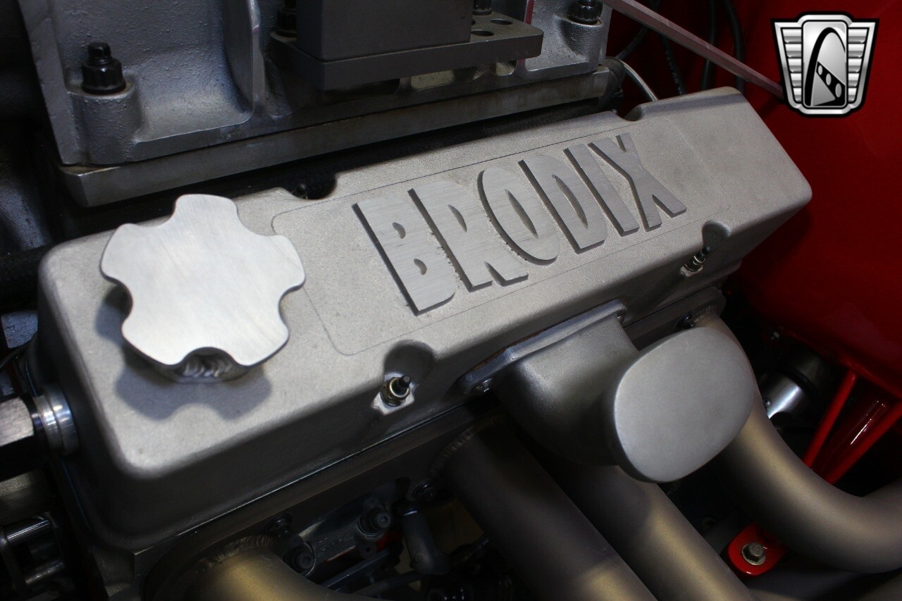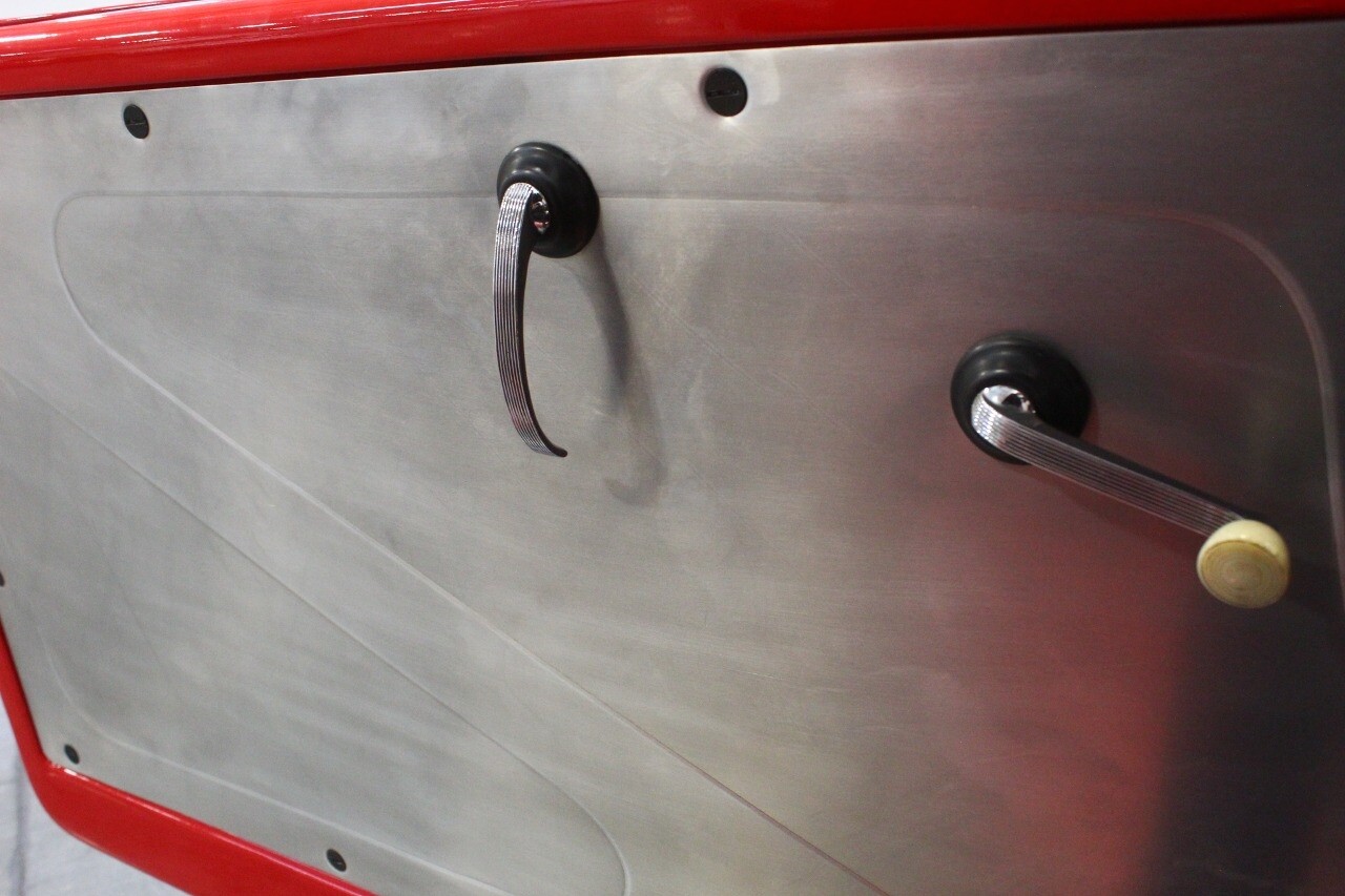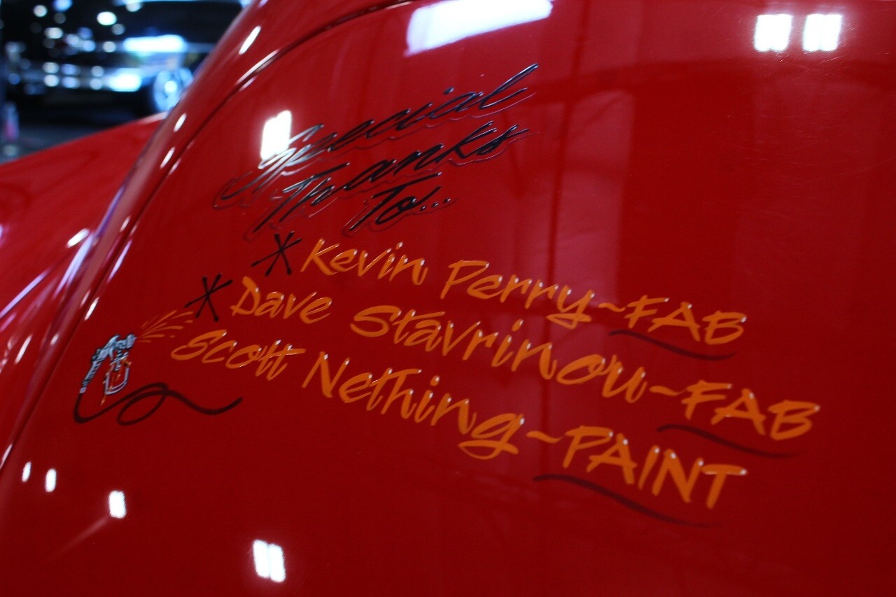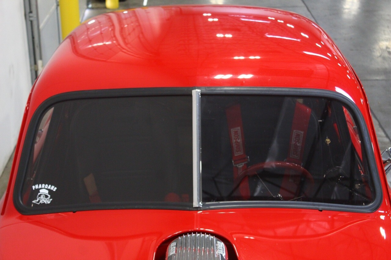 A custom tilt nose with a custom fabricated blower injector opening on the hood was a small focus of the body work that you see and executed by Kevin Perry. Ferrari Rosso Red was laid down just before the hand laid lettering and hand turned variegated copper leaf accents. Bronze safety glass for the winshield and Bronze Lexan on the doors, quarter glass and rear were installed to save weight. Details like the shaved lettering on the front tires that wrap around the 15"x4" Vintage Wheel Works wheels. Out back a set of 15"x10" American Magnesium wheels are wrapped in Hoosier 31x13.5 tires.