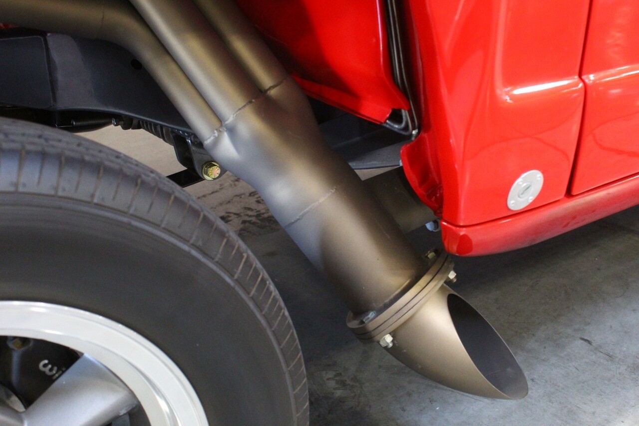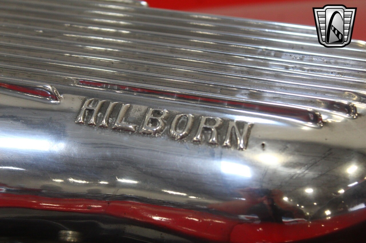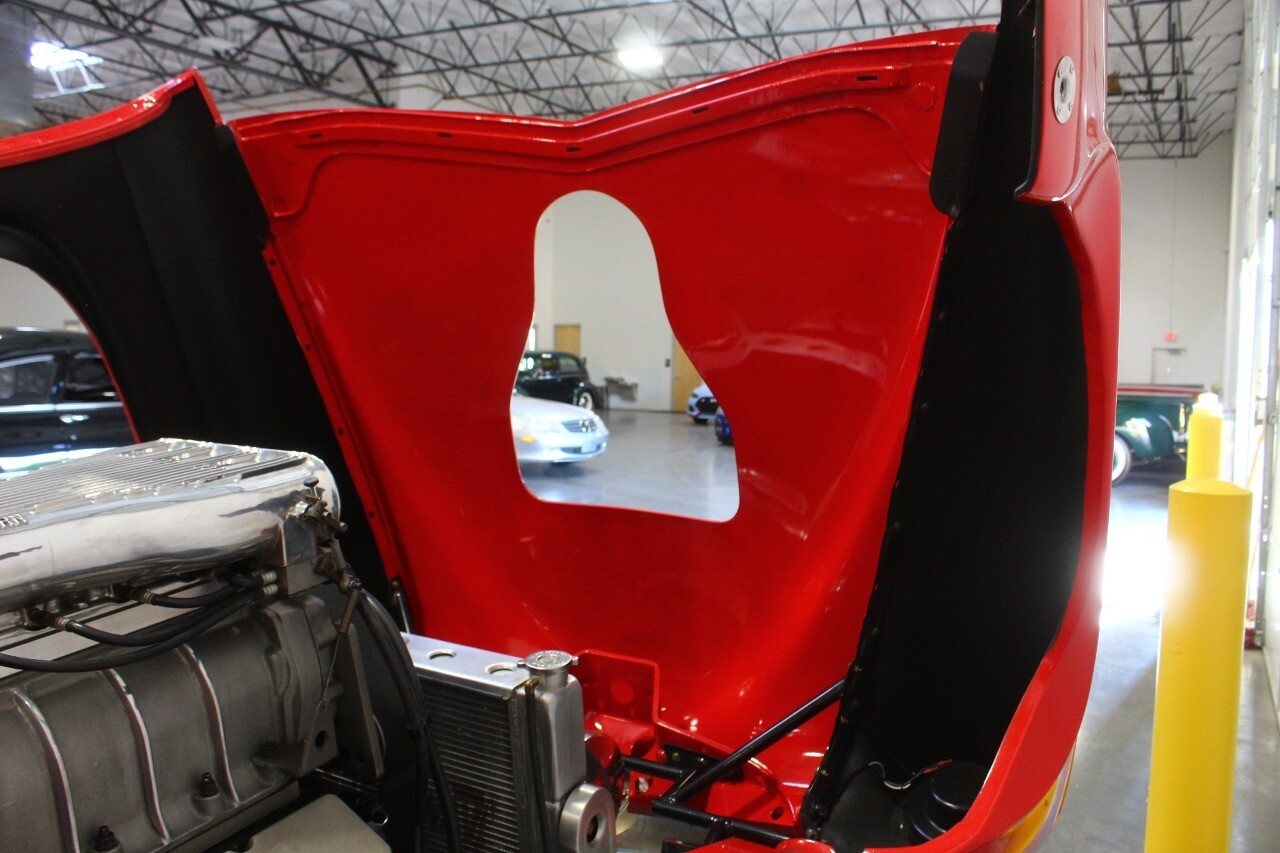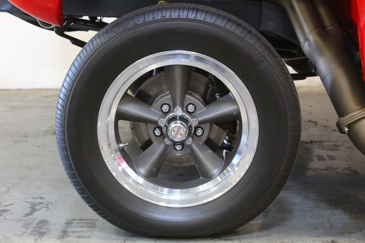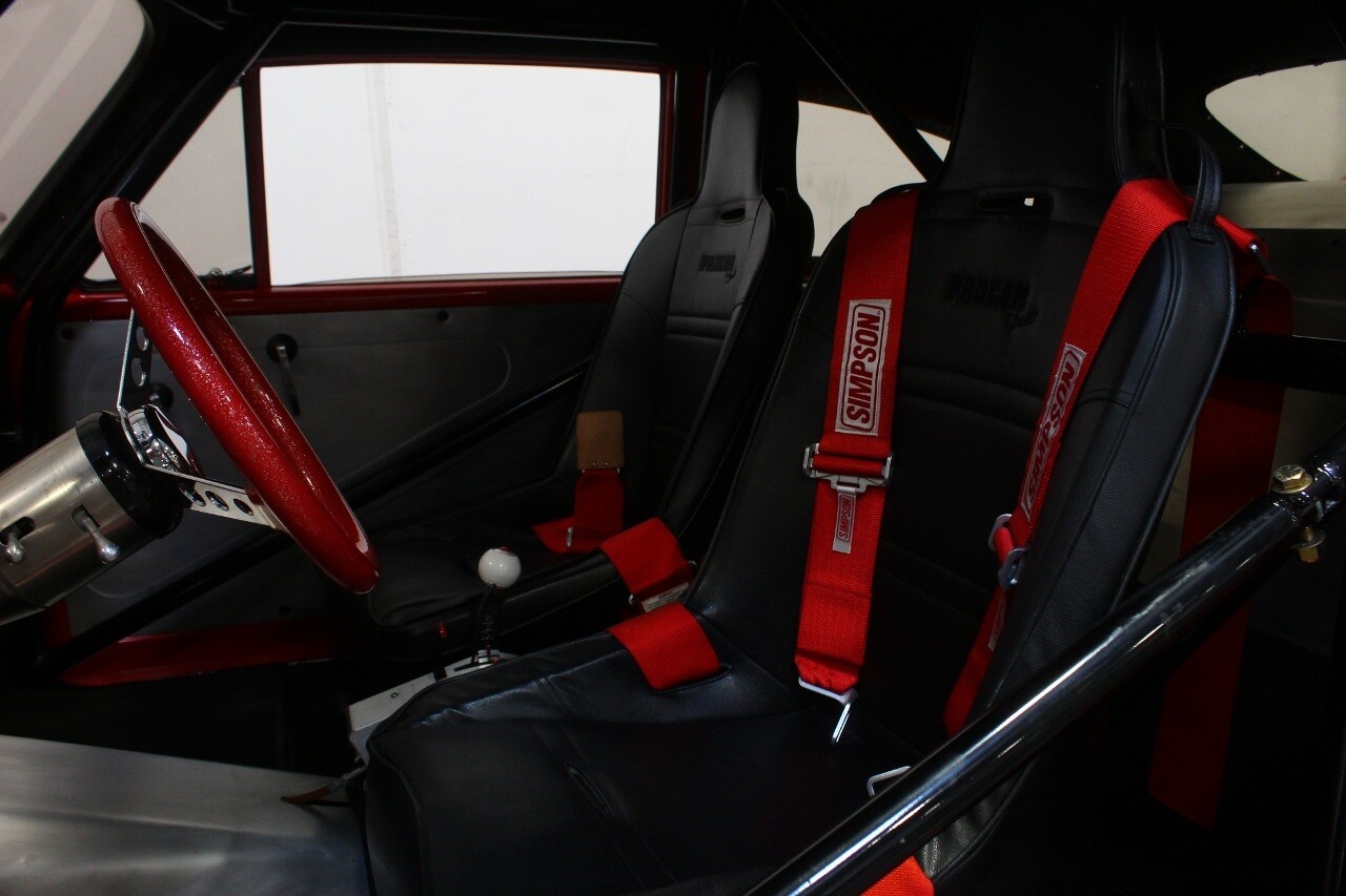 A custom tilt nose with a custom fabricated blower injector opening on the hood was a small focus of the body work that you see and executed by Kevin Perry. Ferrari Rosso Red was laid down just before the hand laid lettering and hand turned variegated copper leaf accents. Bronze safety glass for the winshield and Bronze Lexan on the doors, quarter glass and rear were installed to save weight. Details like the shaved lettering on the front tires that wrap around the 15"x4" Vintage Wheel Works wheels. Out back a set of 15"x10" American Magnesium wheels are wrapped in Hoosier 31x13.5 tires.
