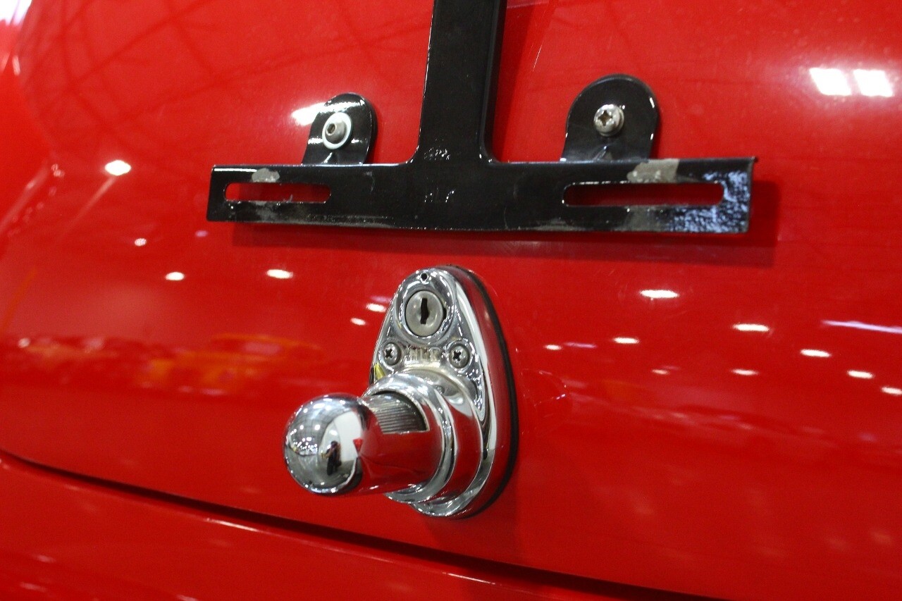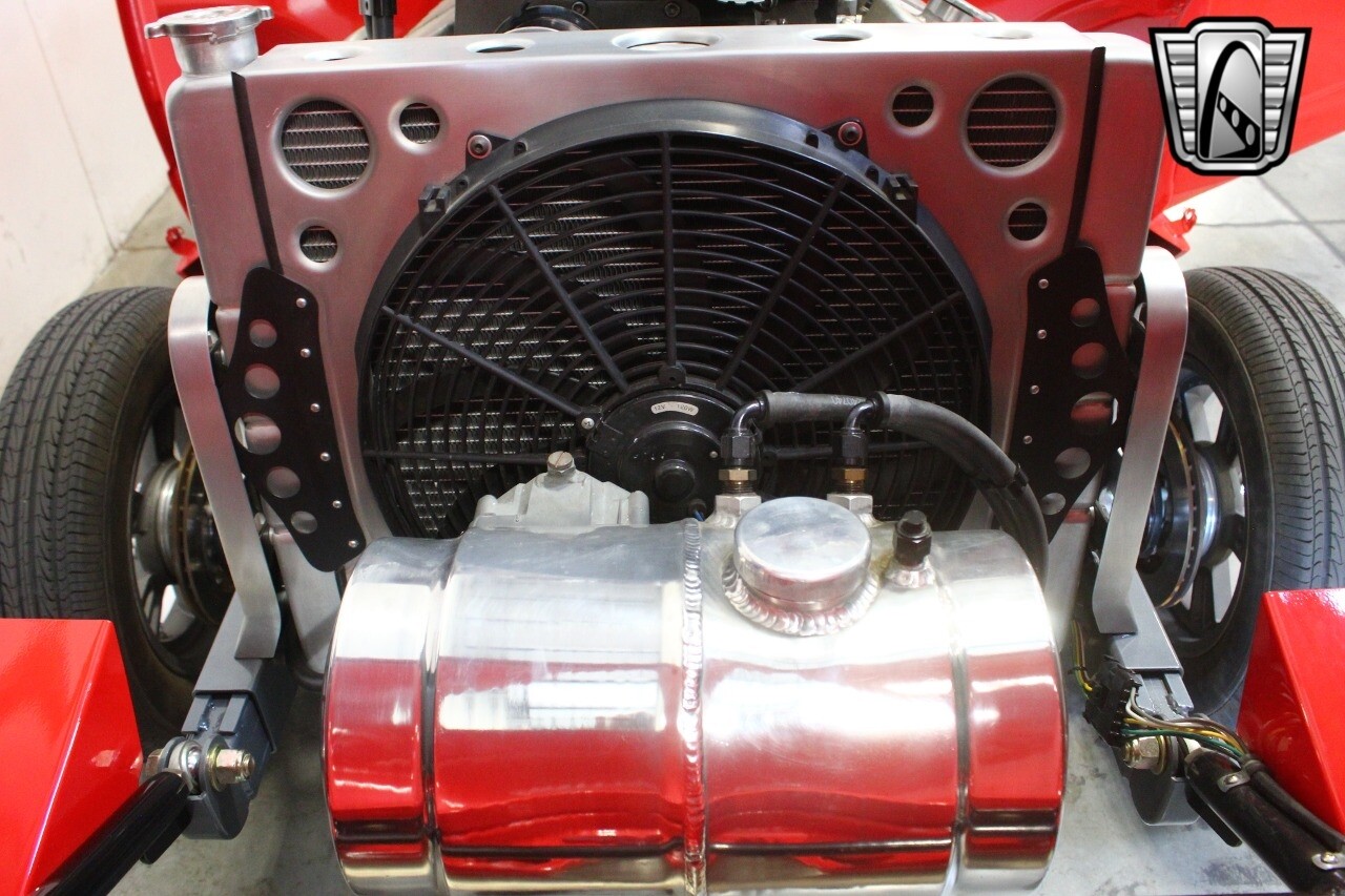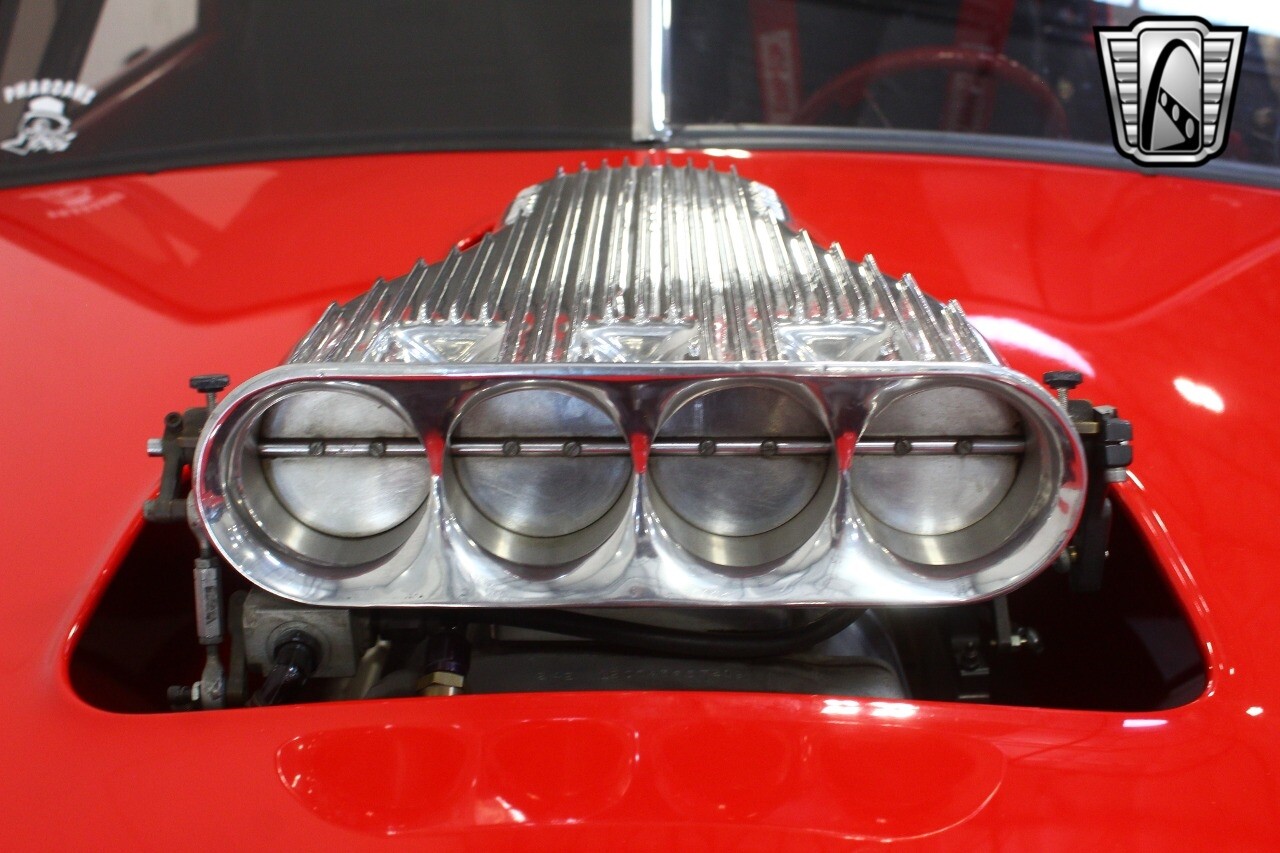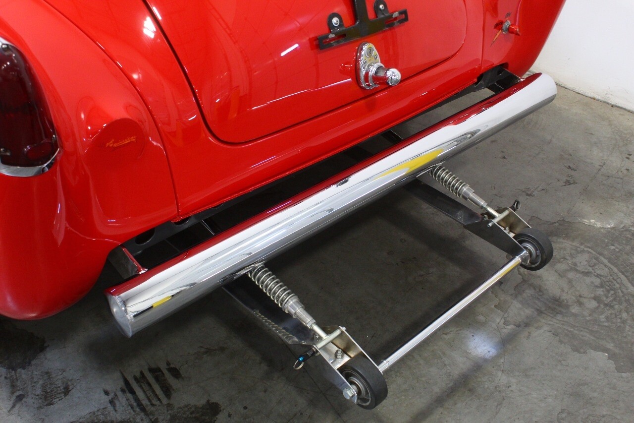 A custom tilt nose with a custom fabricated blower injector opening on the hood was a small focus of the body work that you see and executed by Kevin Perry. Ferrari Rosso Red was laid down just before the hand laid lettering and hand turned variegated copper leaf accents. Bronze safety glass for the winshield and Bronze Lexan on the doors, quarter glass and rear were installed to save weight. Details like the shaved lettering on the front tires that wrap around the 15"x4" Vintage Wheel Works wheels. Out back a set of 15"x10" American Magnesium wheels are wrapped in Hoosier 31x13.5 tires.