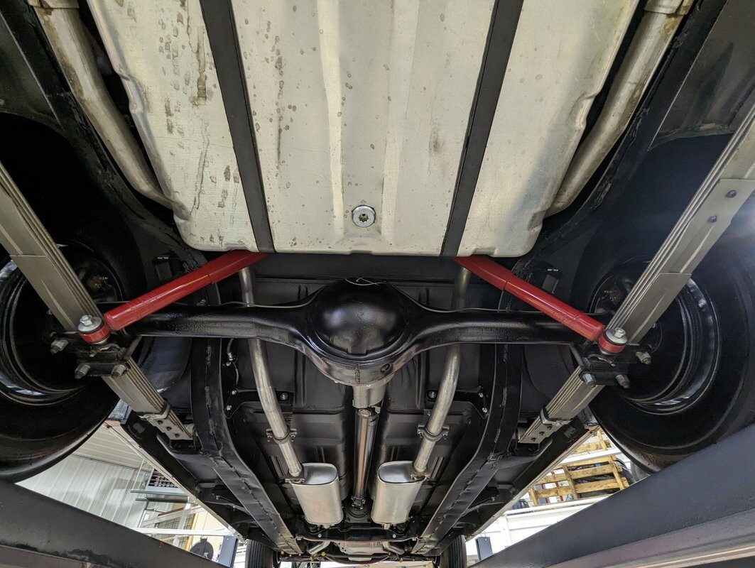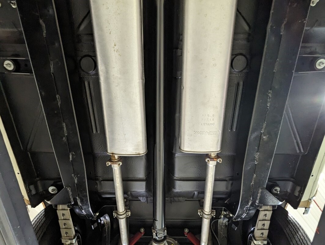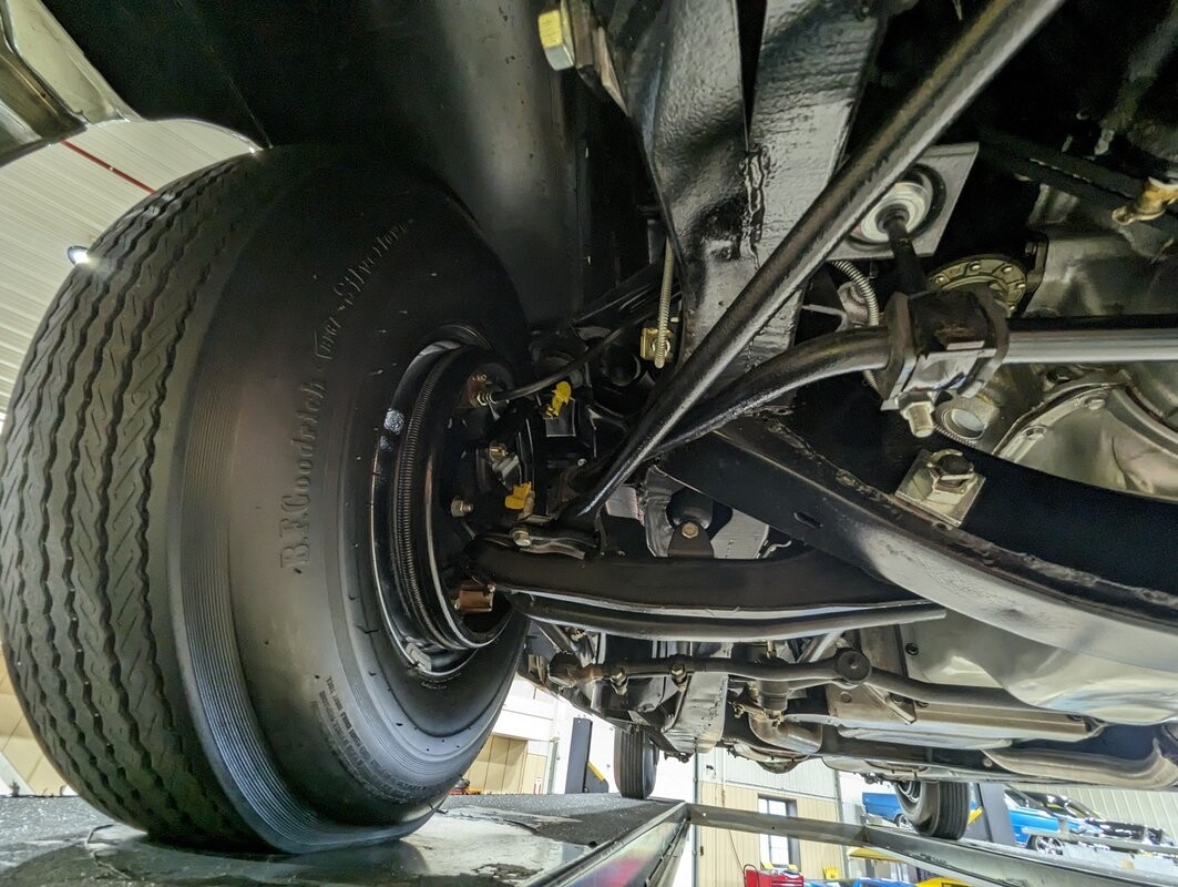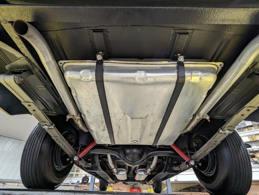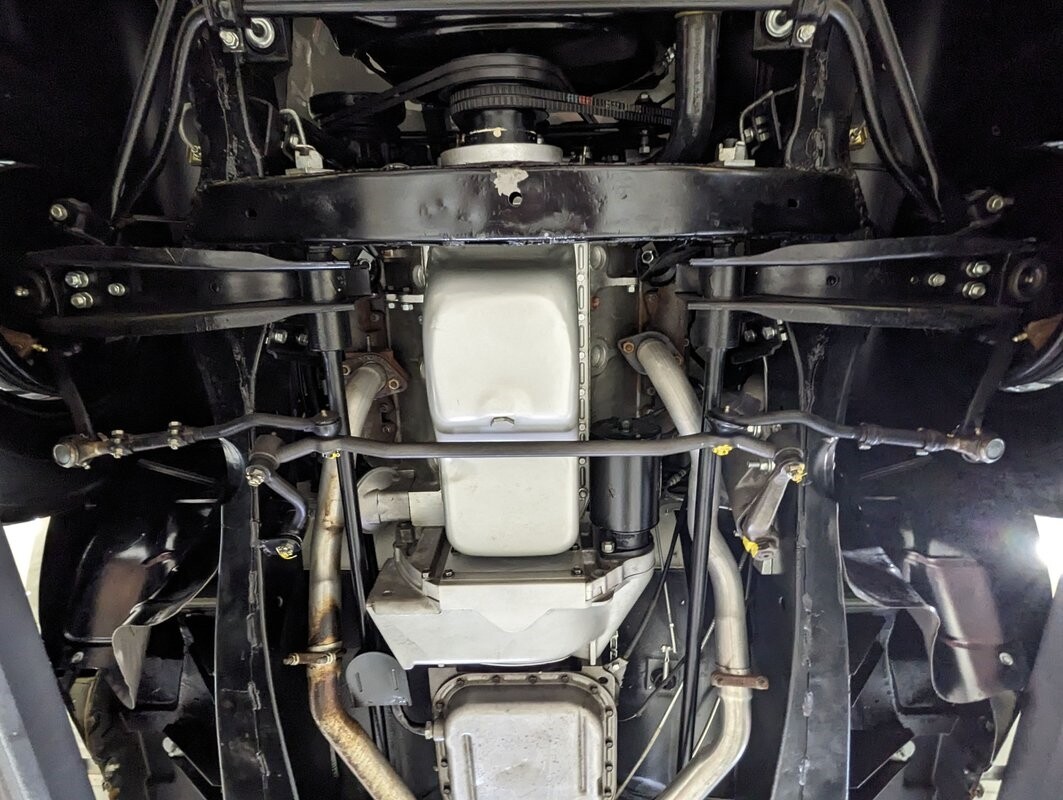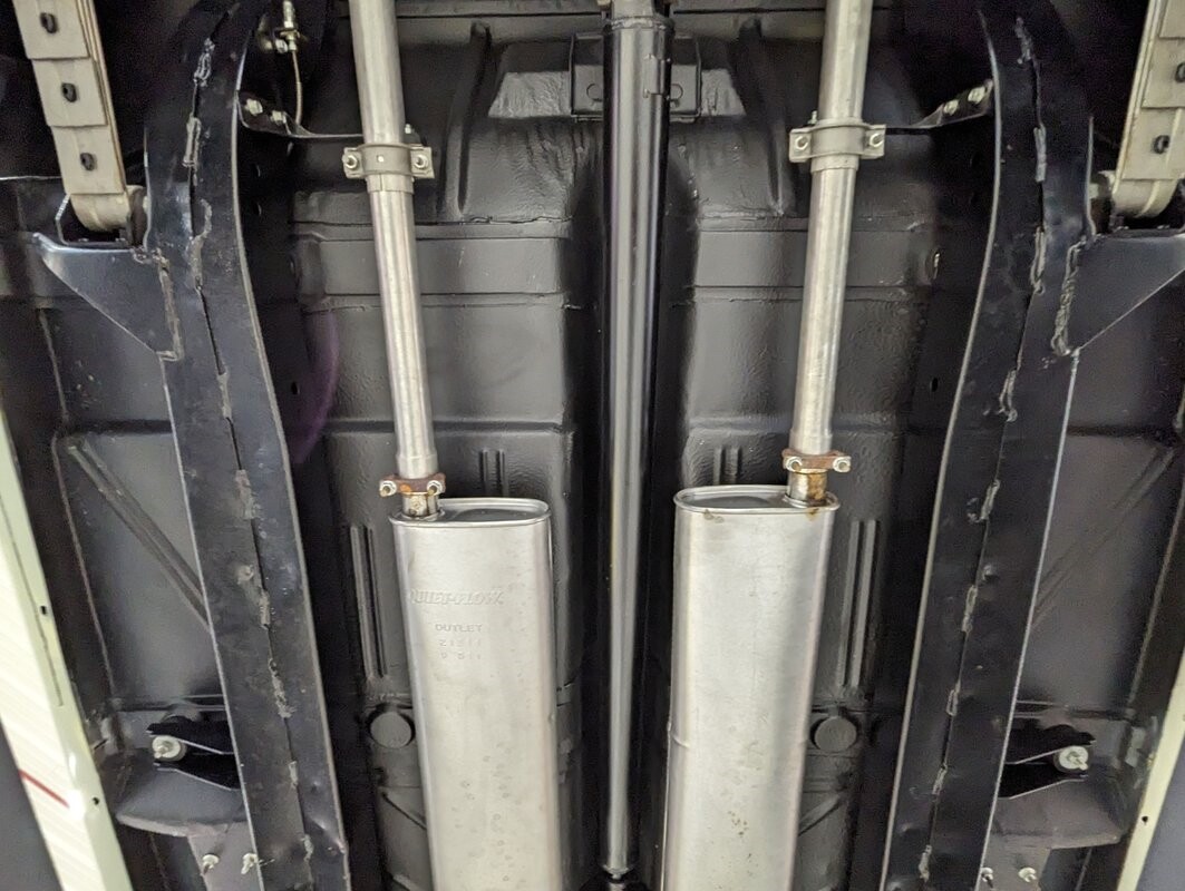 UNDERSIDE: It was frame off restored. The suspension was completely rebuilt and detailed. Chrysler promoted the new torsion bar system was like riding on air. The steering was rebuilt along with the brake system. New fuel system including tank and lines. Factory correct exhaust system other than the tailpipes have been rerouted to not mess up the chrome. Looking up at the motor and transmission they look fresh. The floors are all clean metal with a thin undercoat.