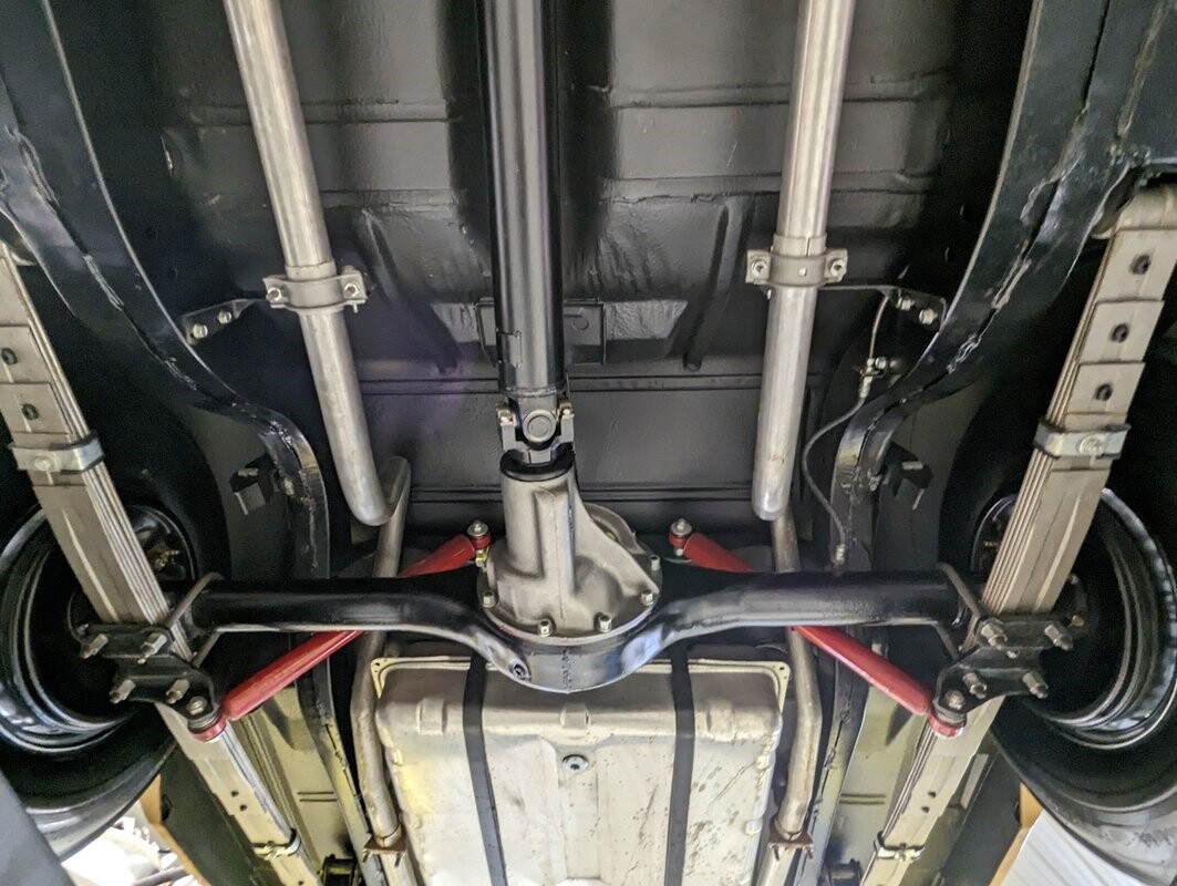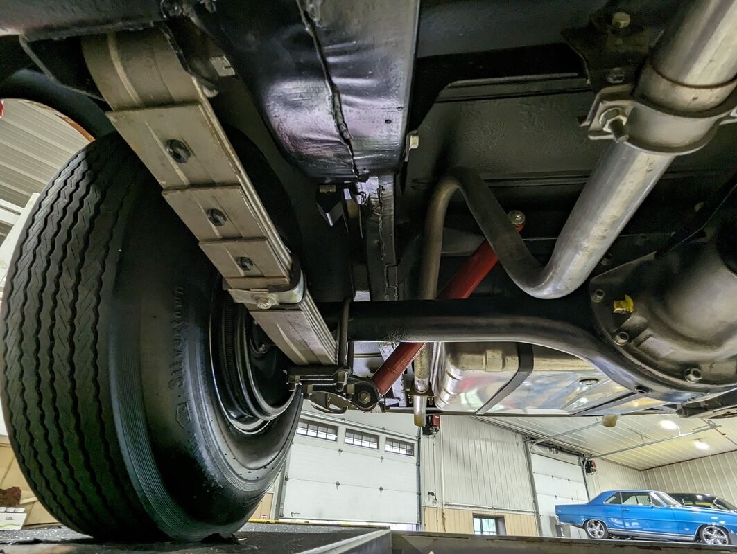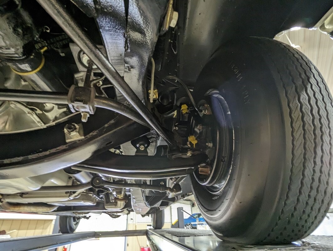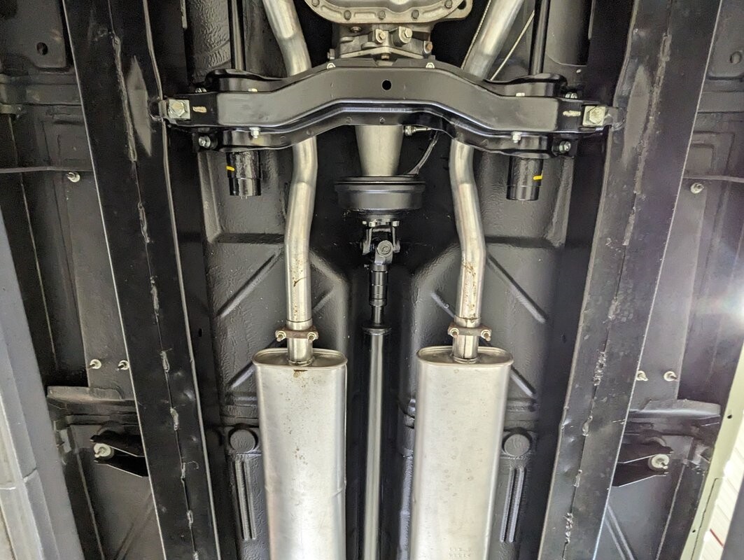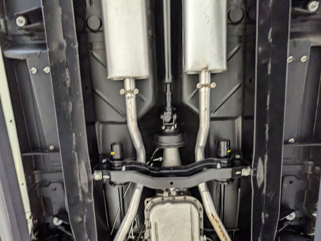 UNDERSIDE: It was frame off restored. The suspension was completely rebuilt and detailed. Chrysler promoted the new torsion bar system was like riding on air. The steering was rebuilt along with the brake system. New fuel system including tank and lines. Factory correct exhaust system other than the tailpipes have been rerouted to not mess up the chrome. Looking up at the motor and transmission they look fresh. The floors are all clean metal with a thin undercoat.
