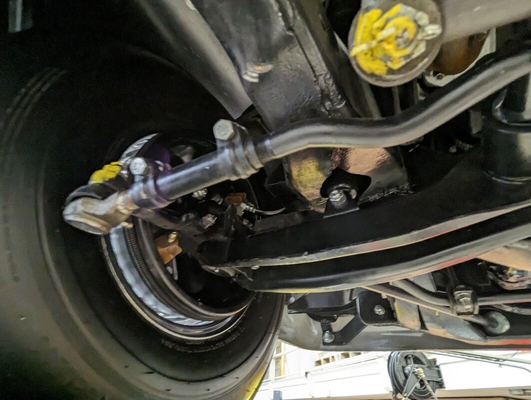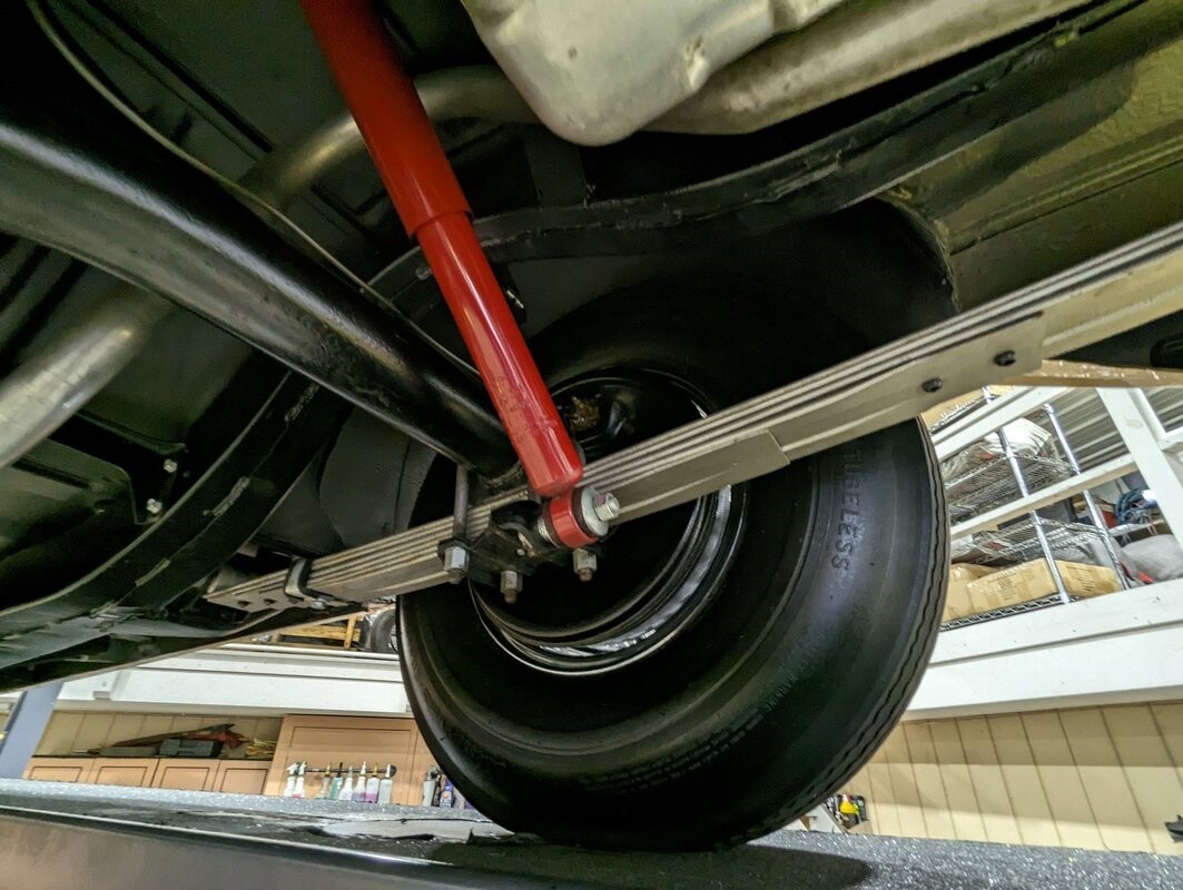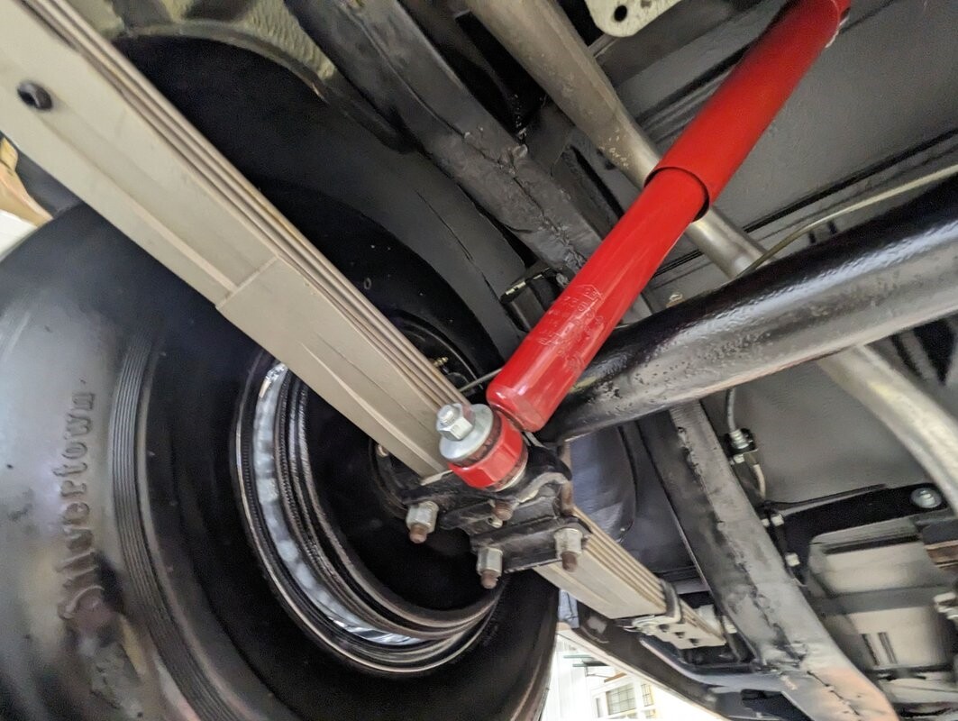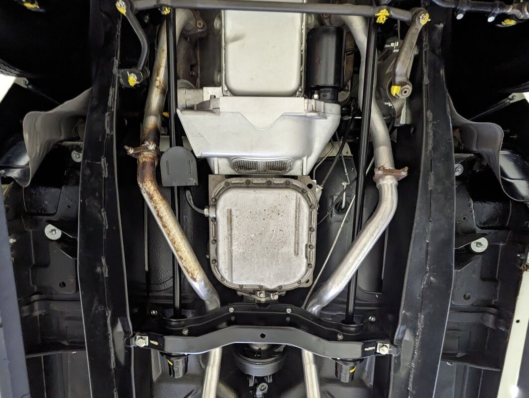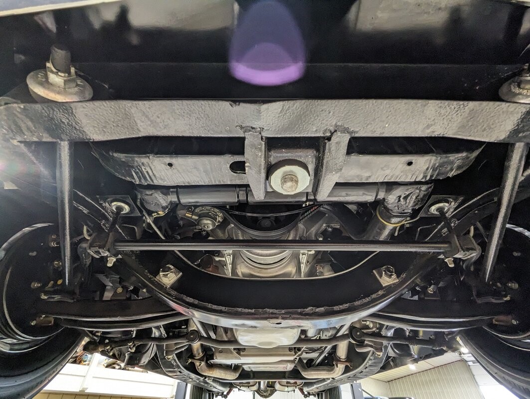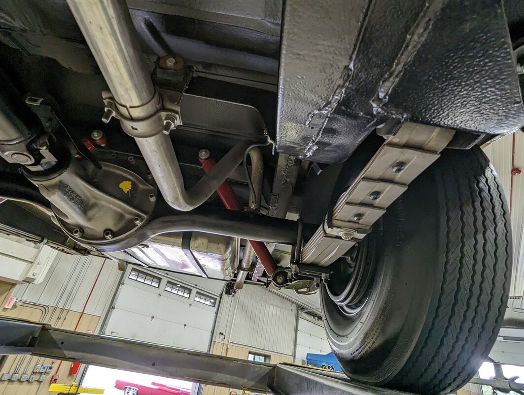 UNDERSIDE: It was frame off restored. The suspension was completely rebuilt and detailed. Chrysler promoted the new torsion bar system was like riding on air. The steering was rebuilt along with the brake system. New fuel system including tank and lines. Factory correct exhaust system other than the tailpipes have been rerouted to not mess up the chrome. Looking up at the motor and transmission they look fresh. The floors are all clean metal with a thin undercoat.