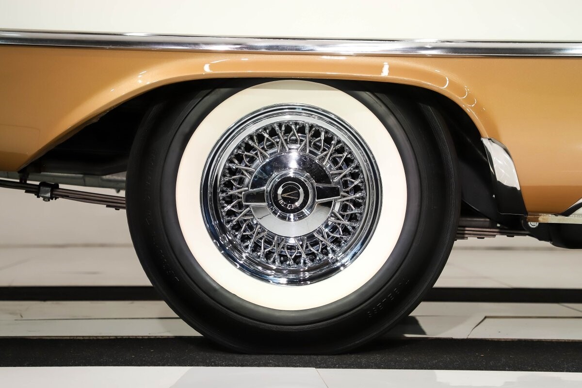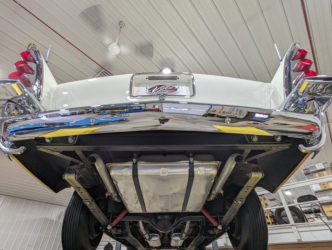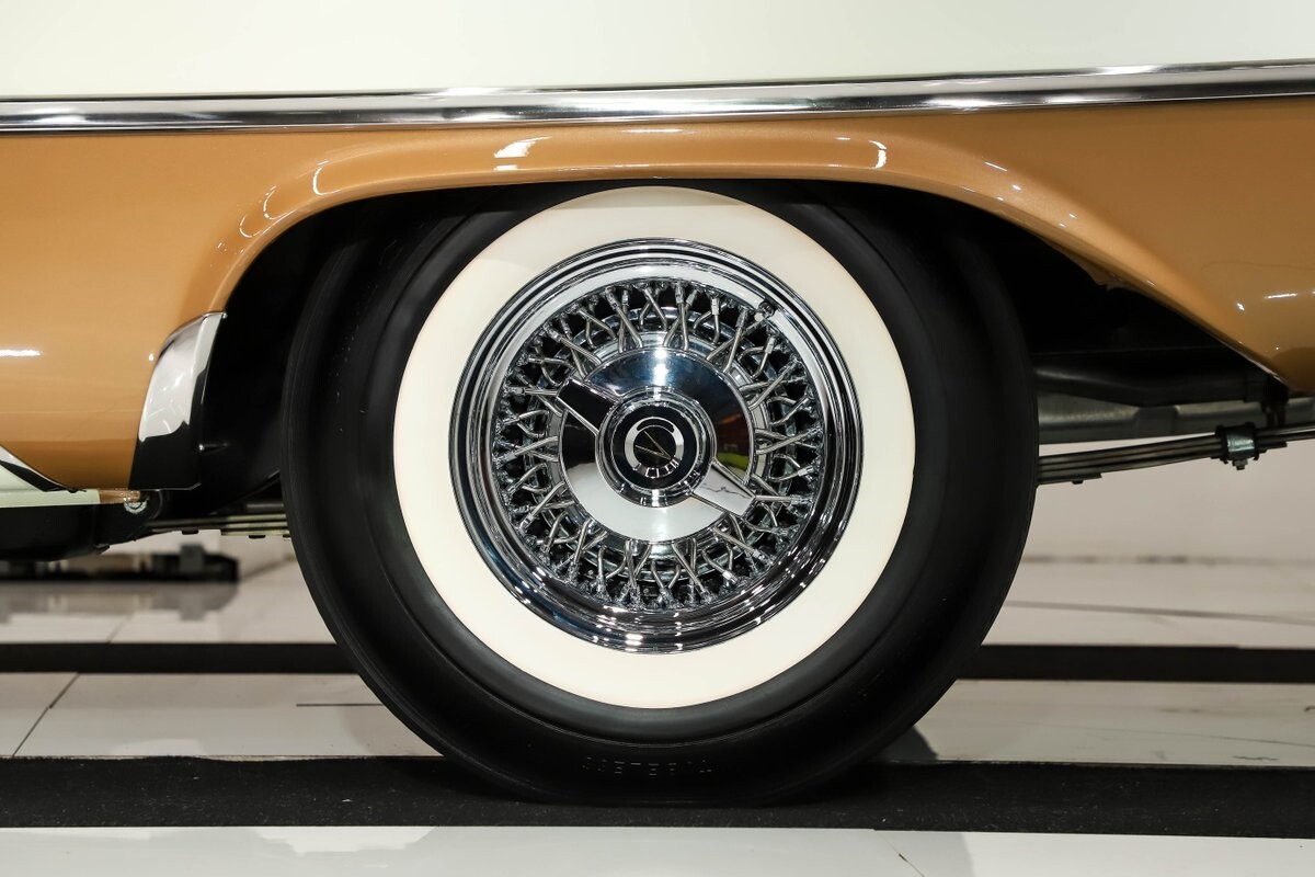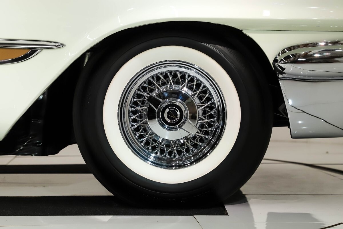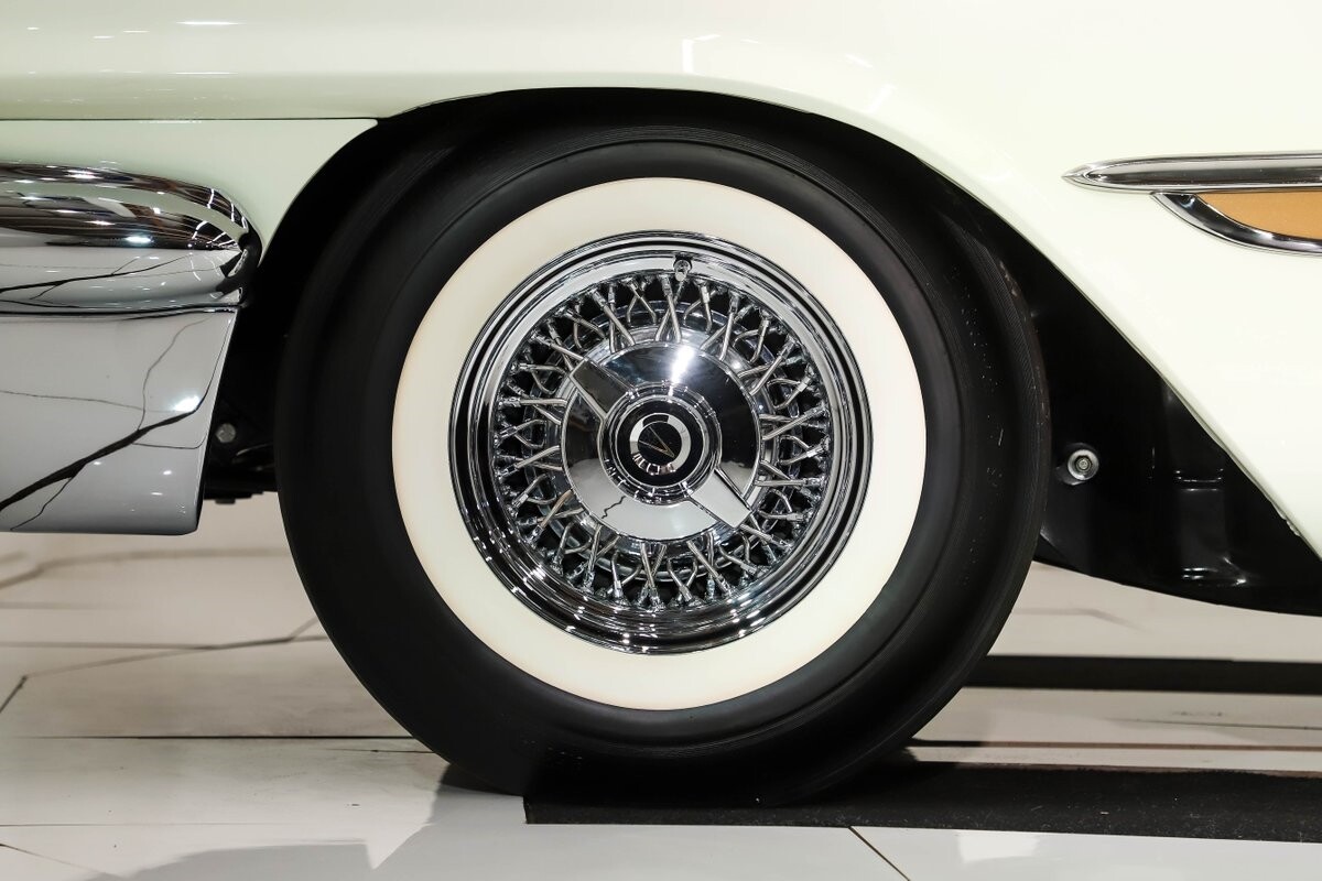 EXTERIOR: What a looker! The lower roof line and tailfins as tall as a teenager give this car a look that can't go unnoticed. The body is pristine, arrow straight with no rust or damage. Only available in black or white, this one has the white polished like glass along with the polished gold accent color too. All the chrome sparkles like jewelry, and there's plenty of it! Giant front bumper, trim around the quad headlights, mirrors perched on top of each fender as well as antenna perched on top of each rear wing. Then there is a big chrome bumper that curves right up into the taillights and chrome strips on top of the trunk for no other reason other than to add more bling. It is rolling on some bling! Chrome wire wheels are wrapped in reproduction whitewall tires.