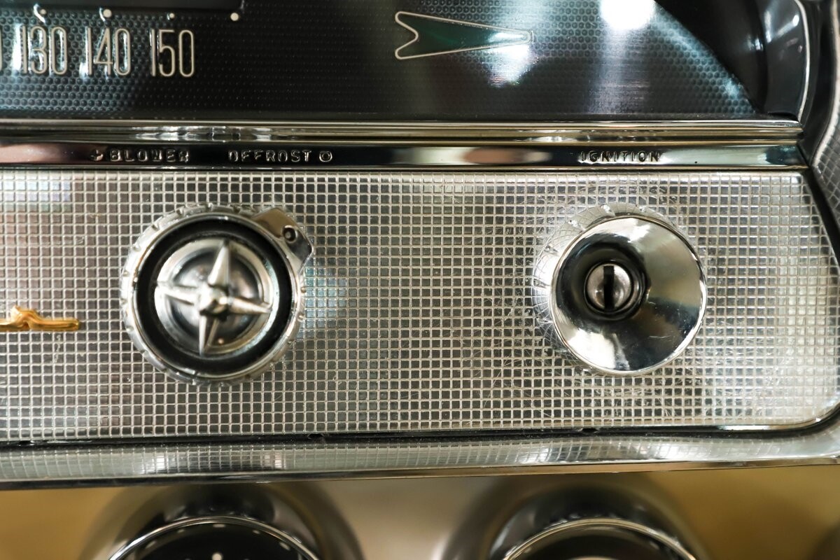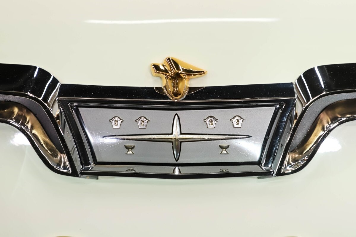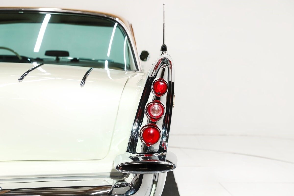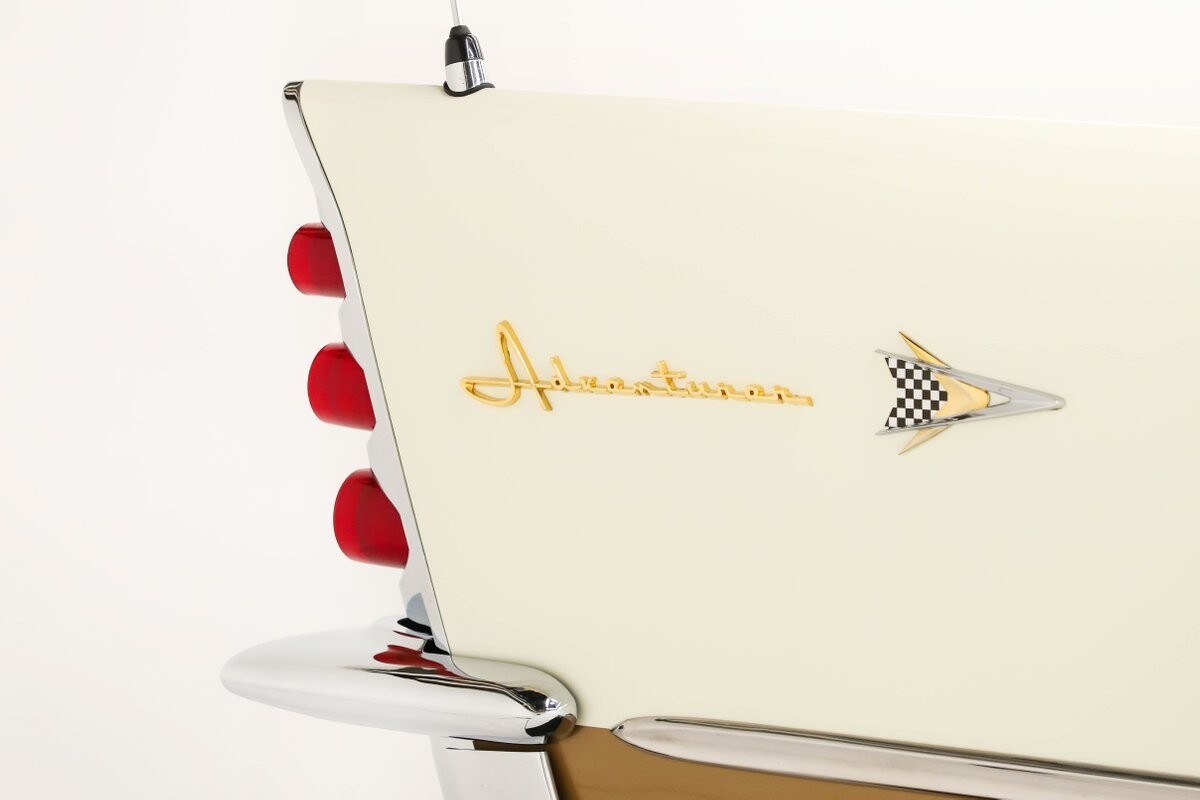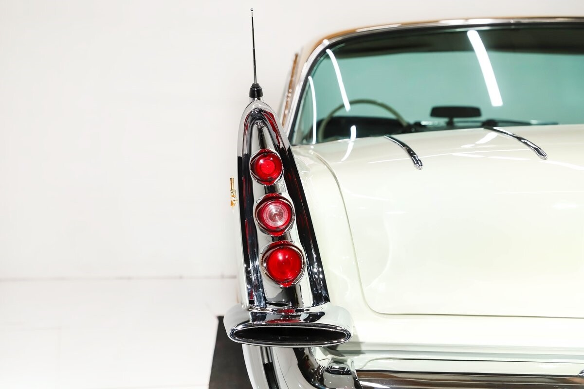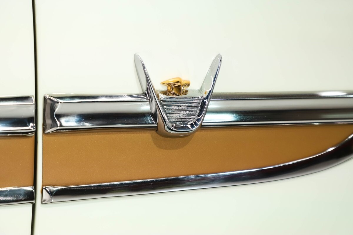 EXTERIOR: What a looker! The lower roof line and tailfins as tall as a teenager give this car a look that can't go unnoticed. The body is pristine, arrow straight with no rust or damage. Only available in black or white, this one has the white polished like glass along with the polished gold accent color too. All the chrome sparkles like jewelry, and there's plenty of it! Giant front bumper, trim around the quad headlights, mirrors perched on top of each fender as well as antenna perched on top of each rear wing. Then there is a big chrome bumper that curves right up into the taillights and chrome strips on top of the trunk for no other reason other than to add more bling. It is rolling on some bling! Chrome wire wheels are wrapped in reproduction whitewall tires.