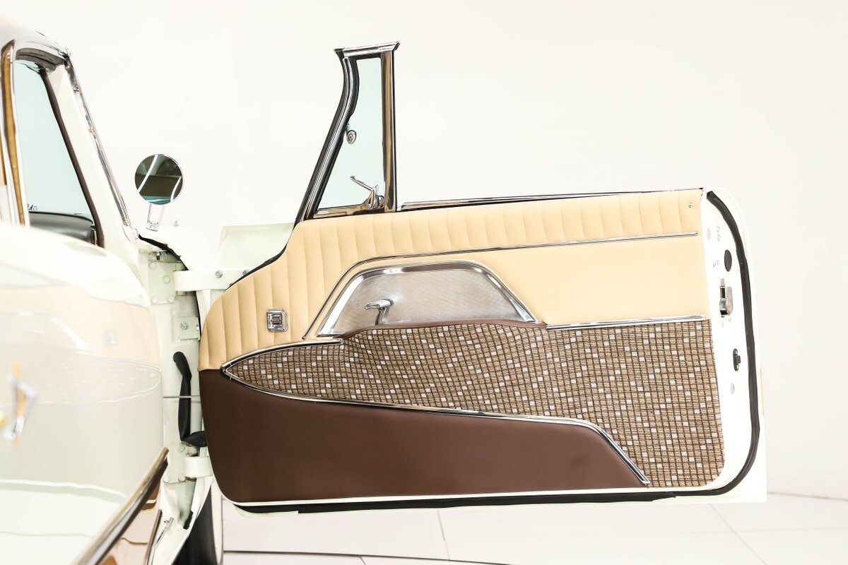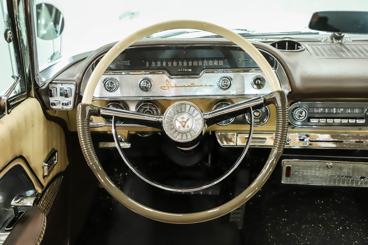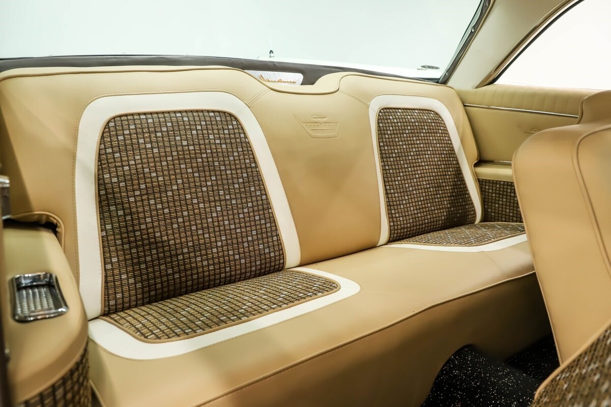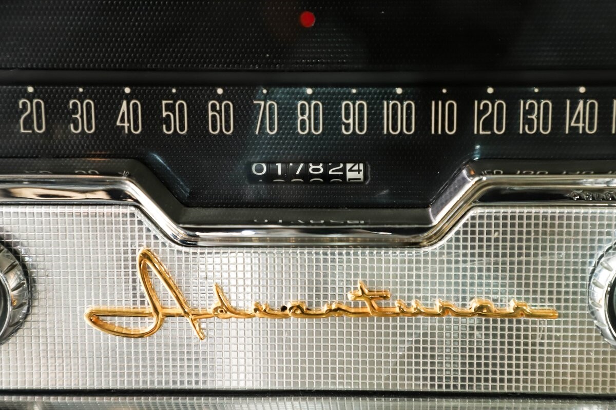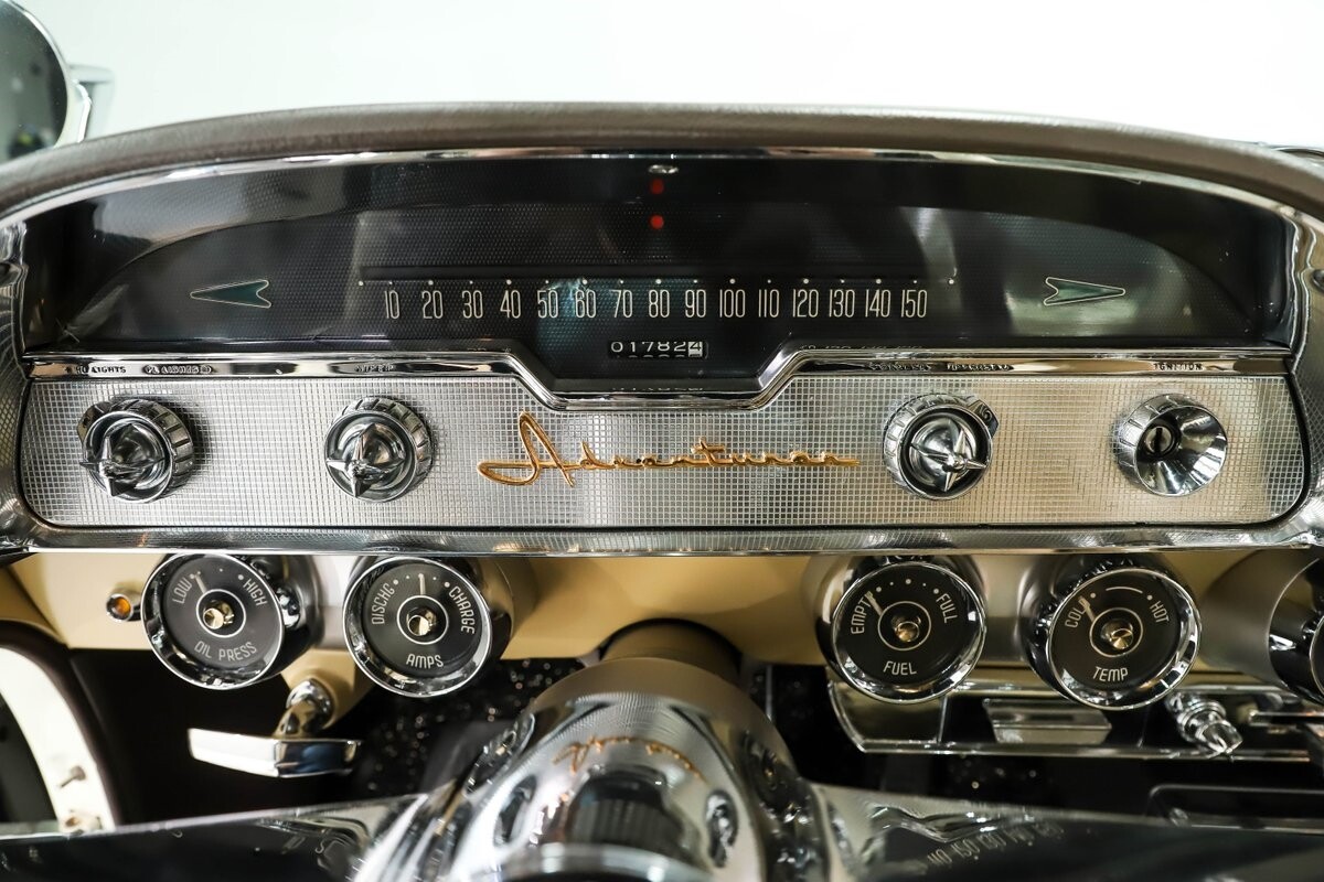 EXTERIOR: What a looker! The lower roof line and tailfins as tall as a teenager give this car a look that can't go unnoticed. The body is pristine, arrow straight with no rust or damage. Only available in black or white, this one has the white polished like glass along with the polished gold accent color too. All the chrome sparkles like jewelry, and there's plenty of it! Giant front bumper, trim around the quad headlights, mirrors perched on top of each fender as well as antenna perched on top of each rear wing. Then there is a big chrome bumper that curves right up into the taillights and chrome strips on top of the trunk for no other reason other than to add more bling. It is rolling on some bling! Chrome wire wheels are wrapped in reproduction whitewall tires.