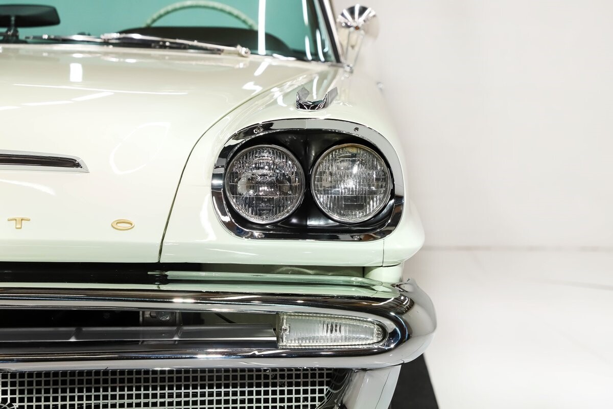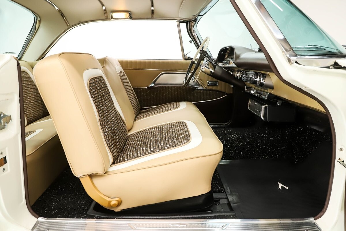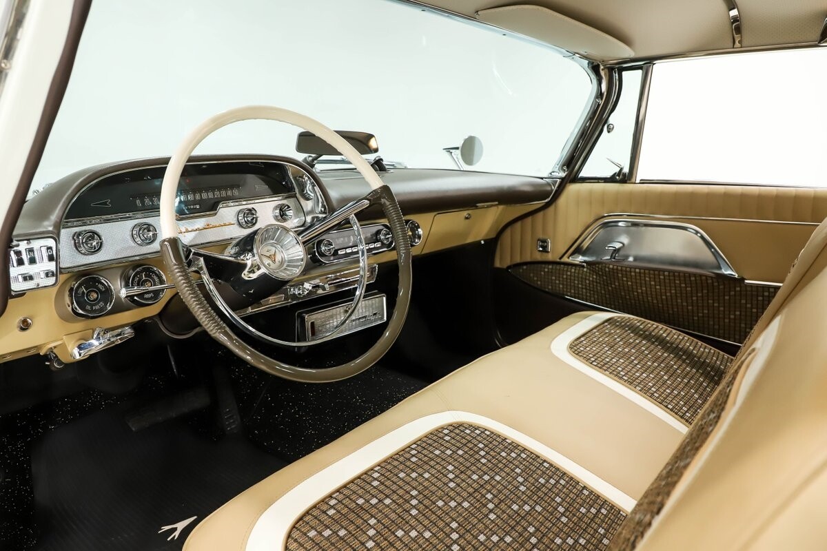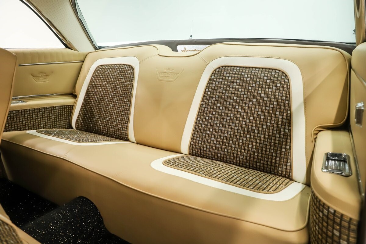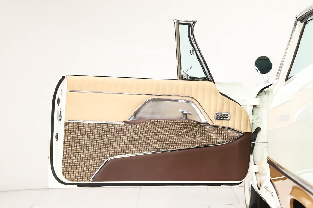 EXTERIOR: What a looker! The lower roof line and tailfins as tall as a teenager give this car a look that can't go unnoticed. The body is pristine, arrow straight with no rust or damage. Only available in black or white, this one has the white polished like glass along with the polished gold accent color too. All the chrome sparkles like jewelry, and there's plenty of it! Giant front bumper, trim around the quad headlights, mirrors perched on top of each fender as well as antenna perched on top of each rear wing. Then there is a big chrome bumper that curves right up into the taillights and chrome strips on top of the trunk for no other reason other than to add more bling. It is rolling on some bling! Chrome wire wheels are wrapped in reproduction whitewall tires.