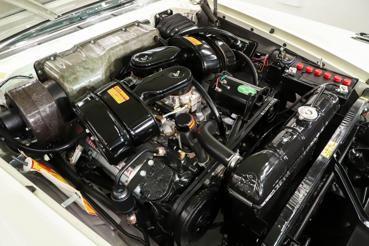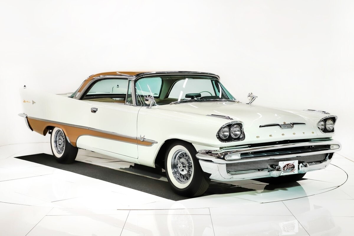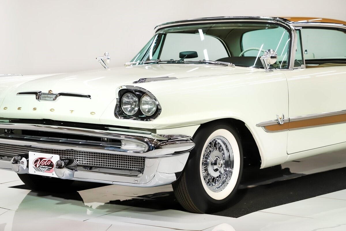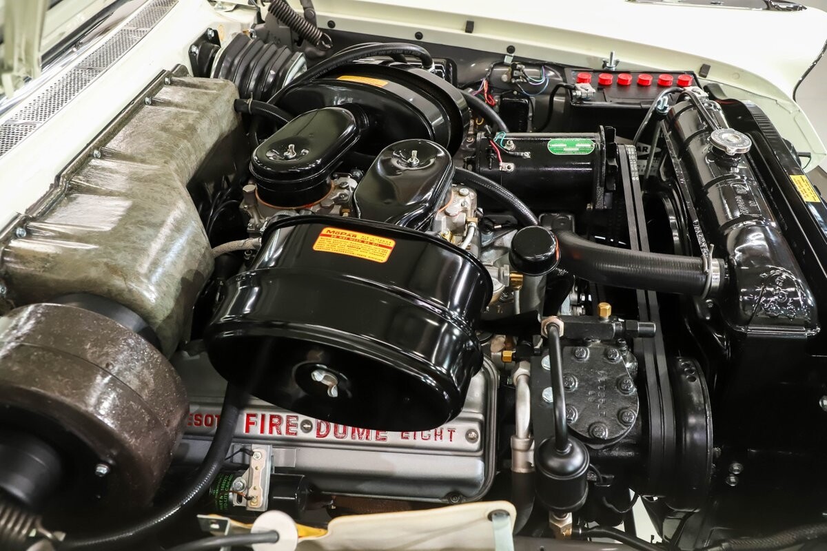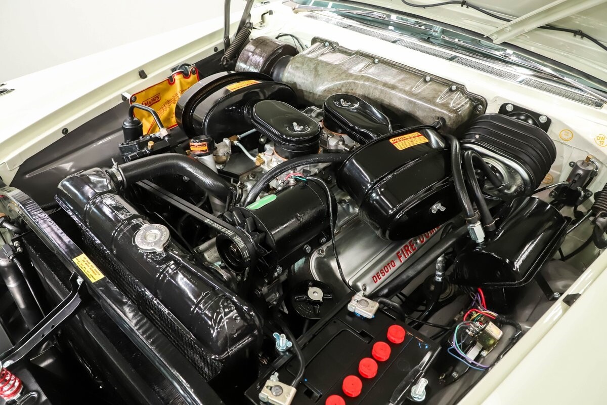 ENGINE COMPARTMENT: 345 cubic inch Hemi with a race cam and dual 4 barrel carbs produced 345 horsepower! It's not all race car, this one has power steering and brakes along with factory air conditioning! It is concourse restored in here, factory correct down to the stickers and paint stamps. It has the correct DeSoto Firedome valve covers, dual air cleaners, and even the Mopar Jiffy Jet washer bag. The a/c box has correct raw fiberglass, all the metal surfaces are painted slick. The wiring was all replaced, it has a reproduction battery. This motor compartment is detailed!