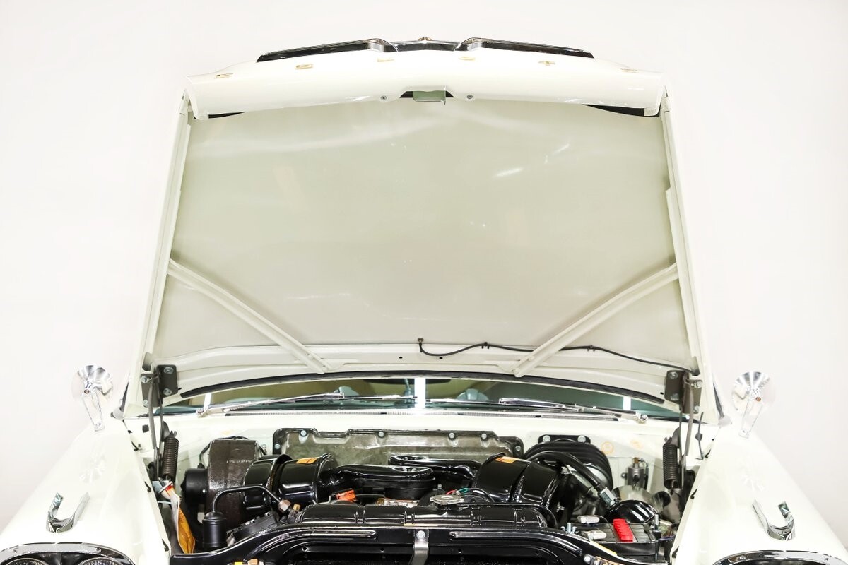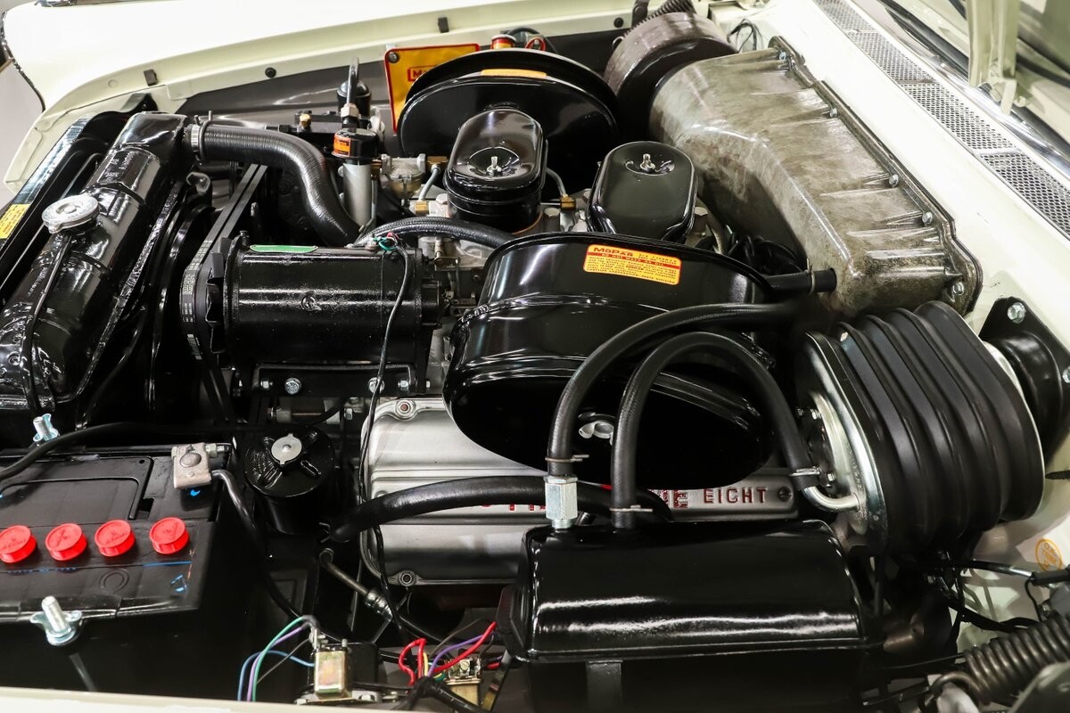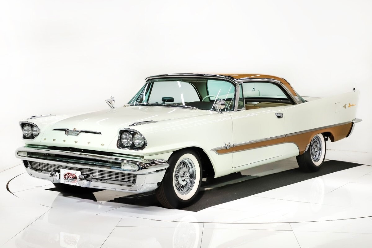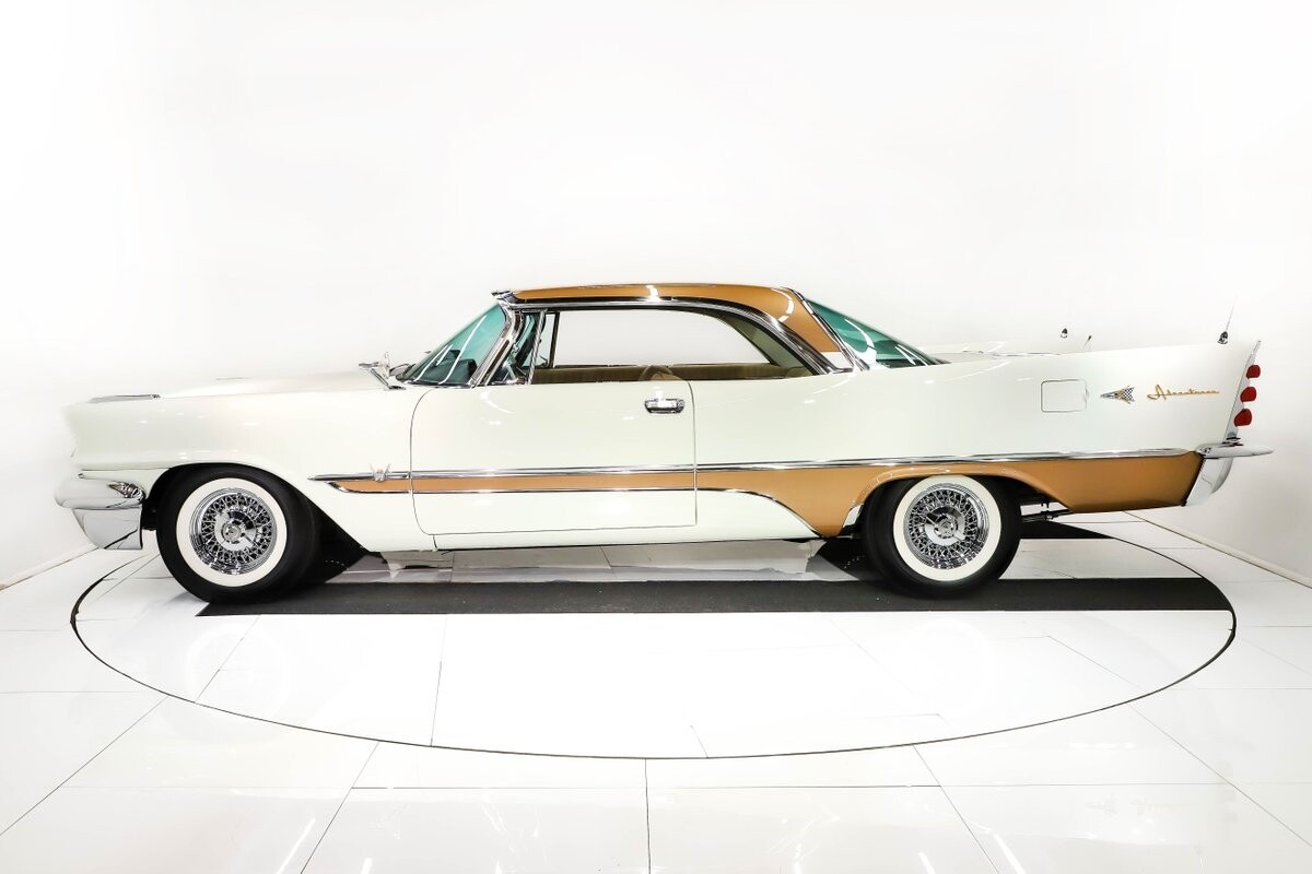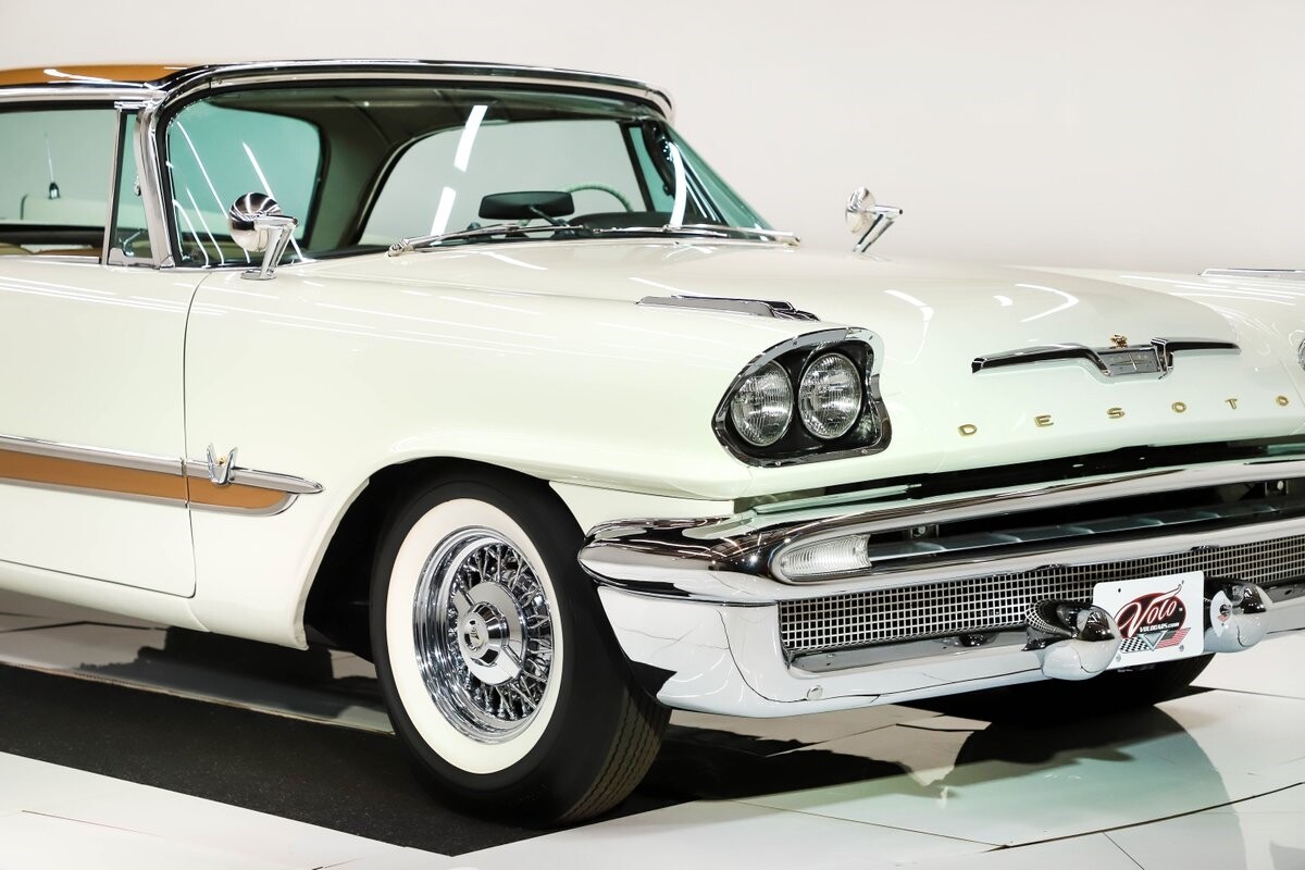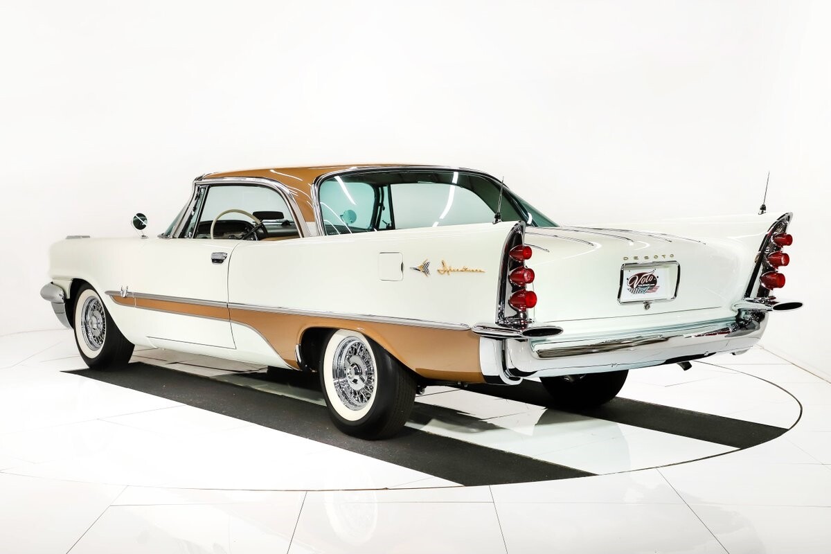ENGINE COMPARTMENT: 345 cubic inch Hemi with a race cam and dual 4 barrel carbs produced 345 horsepower! It's not all race car, this one has power steering and brakes along with factory air conditioning! It is concourse restored in here, factory correct down to the stickers and paint stamps. It has the correct DeSoto Firedome valve covers, dual air cleaners, and even the Mopar Jiffy Jet washer bag. The a/c box has correct raw fiberglass, all the metal surfaces are painted slick. The wiring was all replaced, it has a reproduction battery. This motor compartment is detailed!