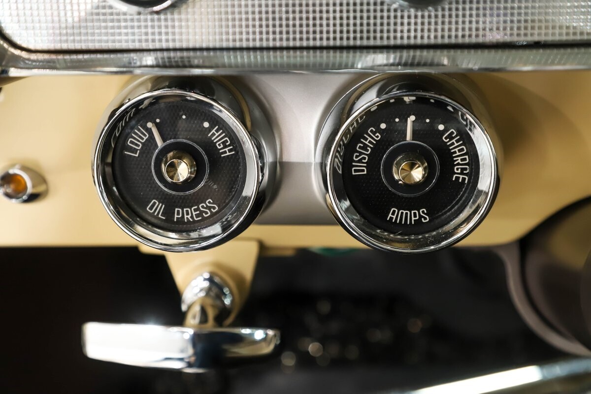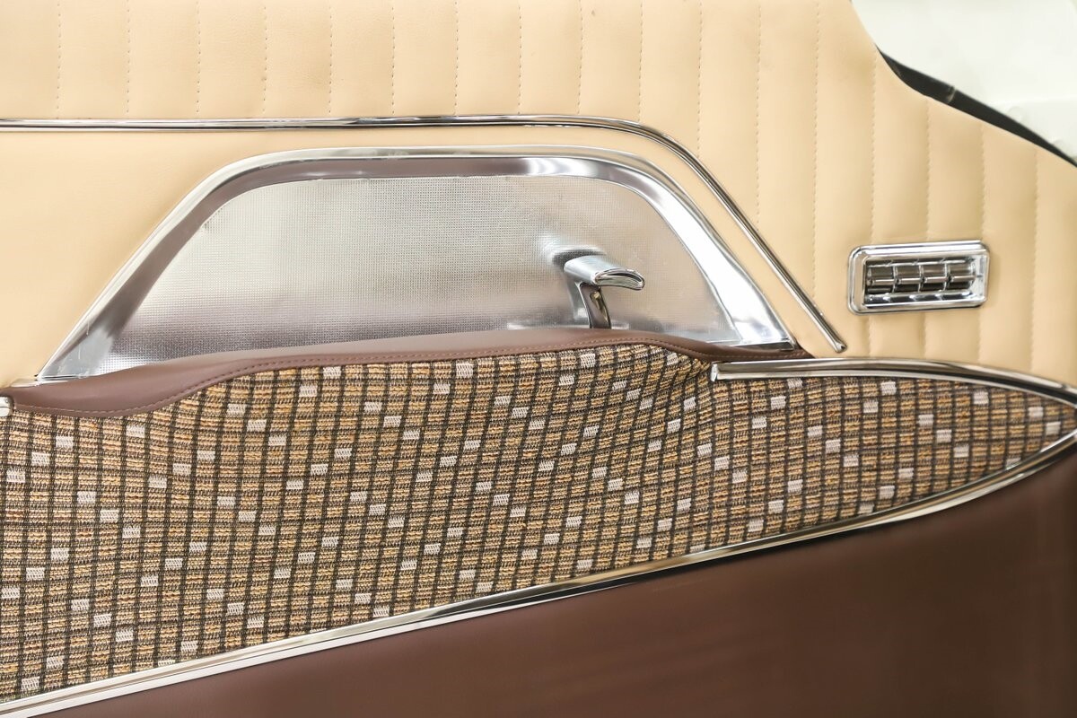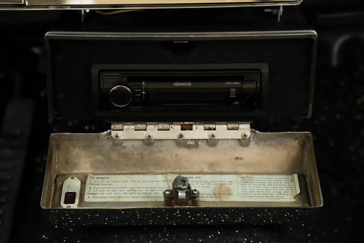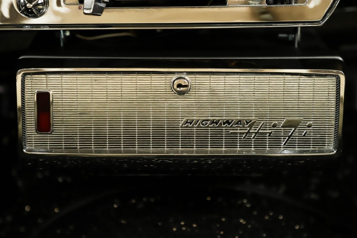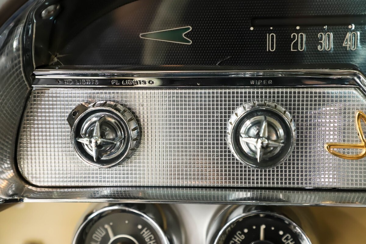 INTERIOR: The outside is cool, well so is the inside! From the silver tinsel carpet to the push button trans. All of the correct upholstery was used to restore the seats and door panels. The dash area is beautiful: the metal is painted, chrome knobs and trim sparkles, gauges are mint, steering wheel is restored. Below the dash looks like a vintage record player but actually opens up to find a stereo. Overhead is a pristine white headliner and visors decorated with chrome bars and working dome lights. Power windows and power seat will make life a little easier.