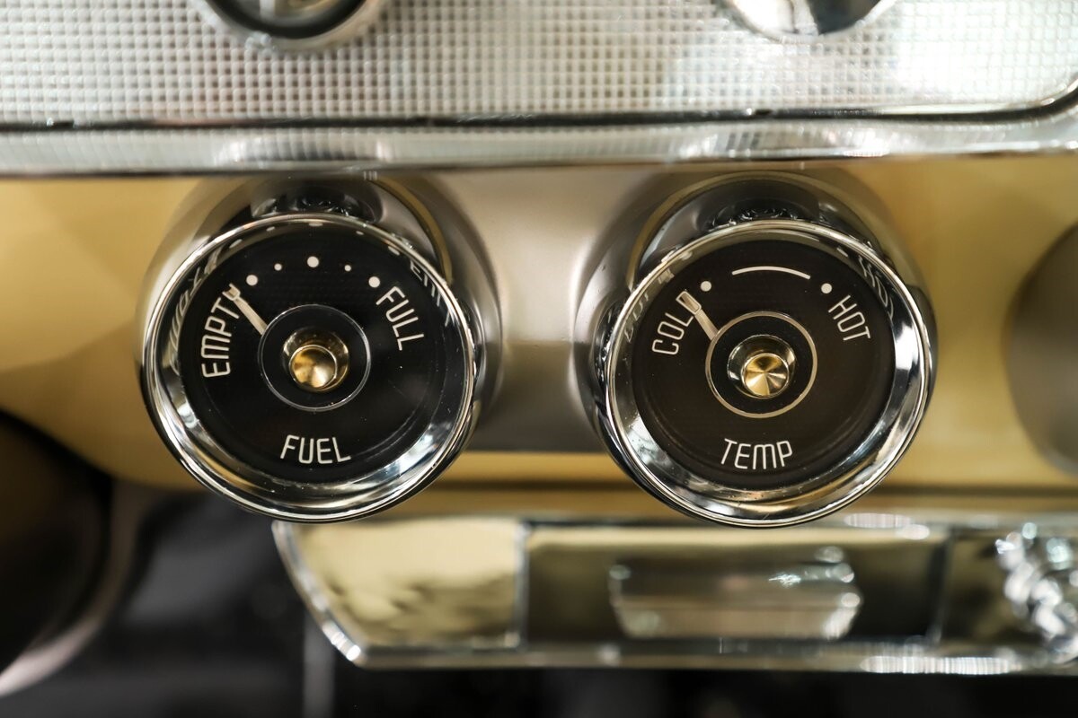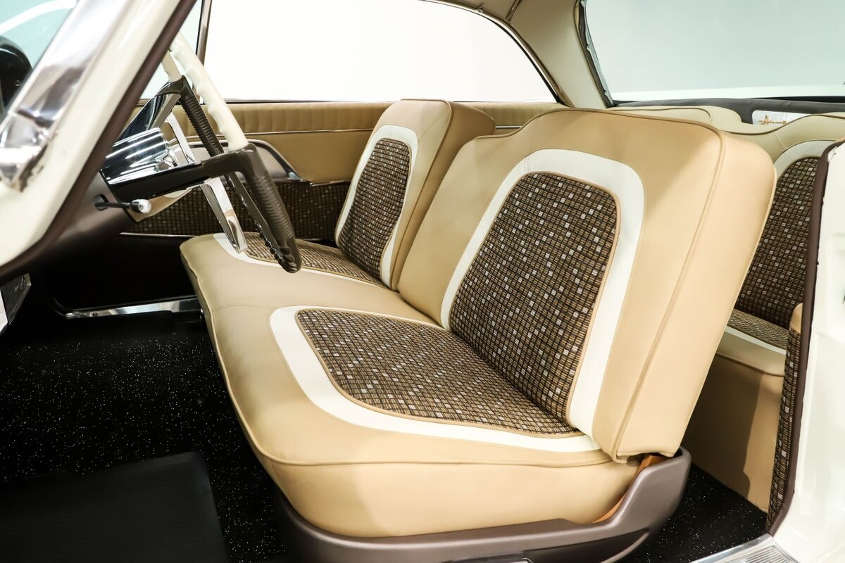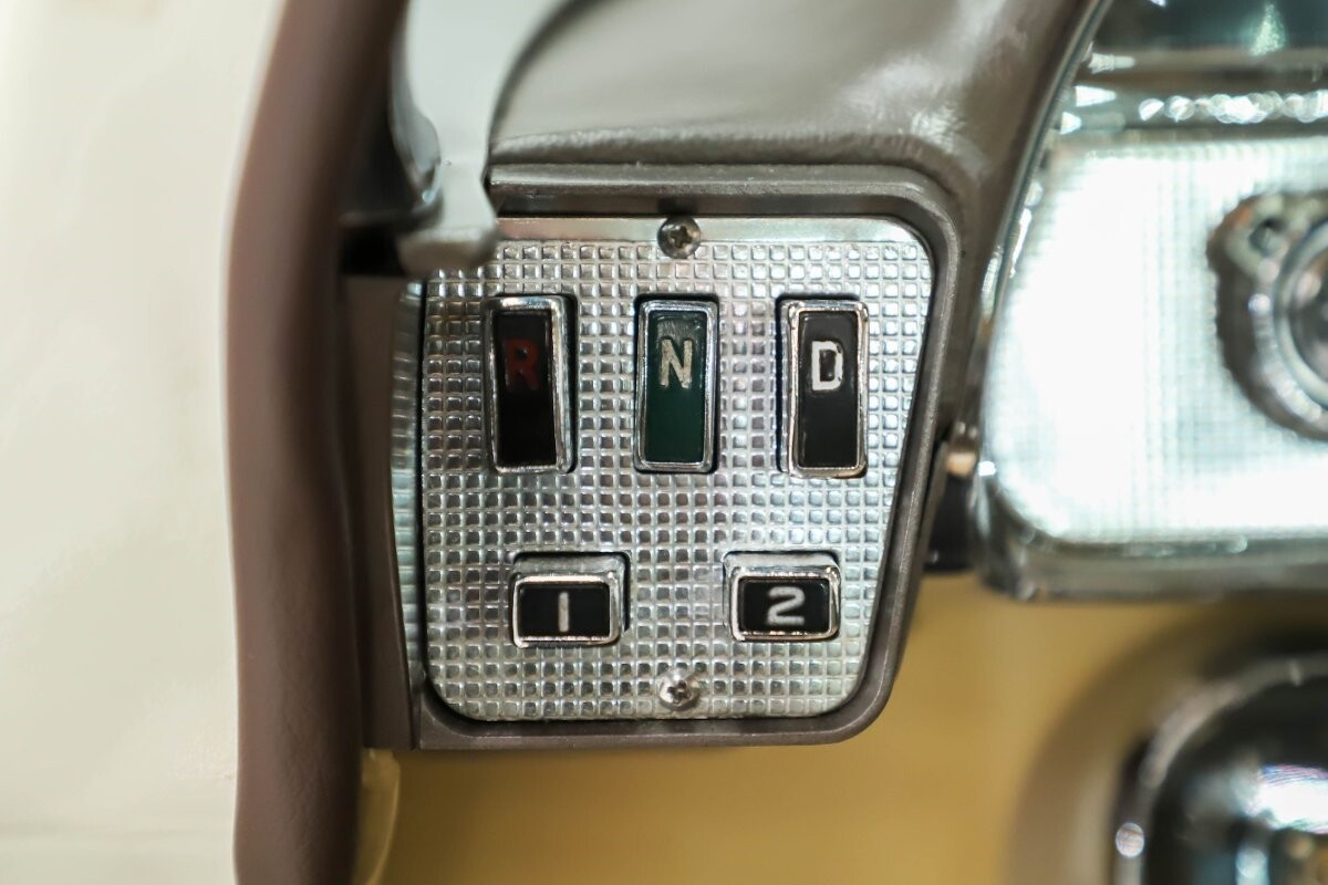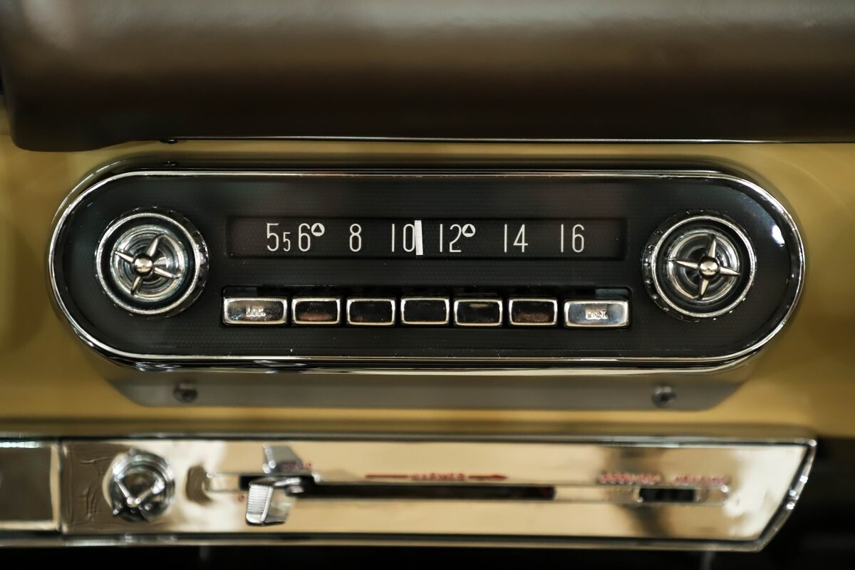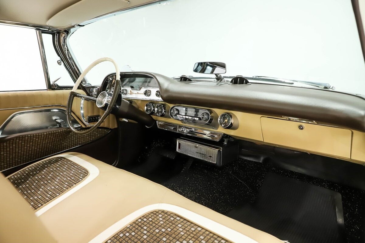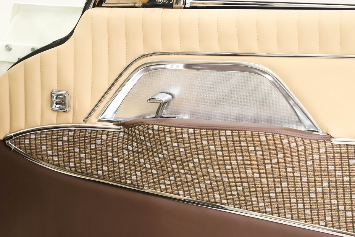 INTERIOR: The outside is cool, well so is the inside! From the silver tinsel carpet to the push button trans. All of the correct upholstery was used to restore the seats and door panels. The dash area is beautiful: the metal is painted, chrome knobs and trim sparkles, gauges are mint, steering wheel is restored. Below the dash looks like a vintage record player but actually opens up to find a stereo. Overhead is a pristine white headliner and visors decorated with chrome bars and working dome lights. Power windows and power seat will make life a little easier.