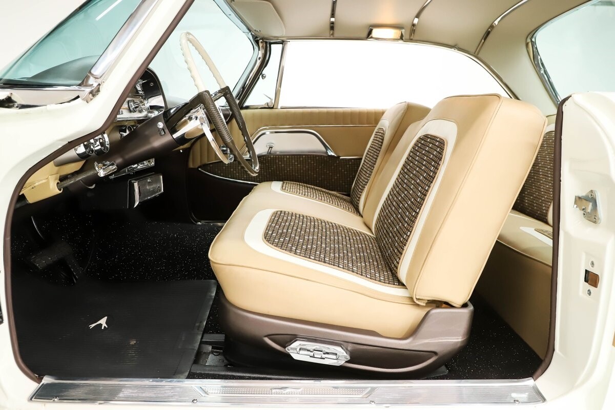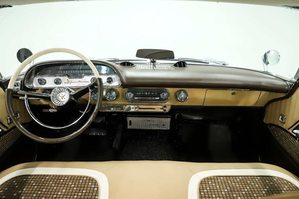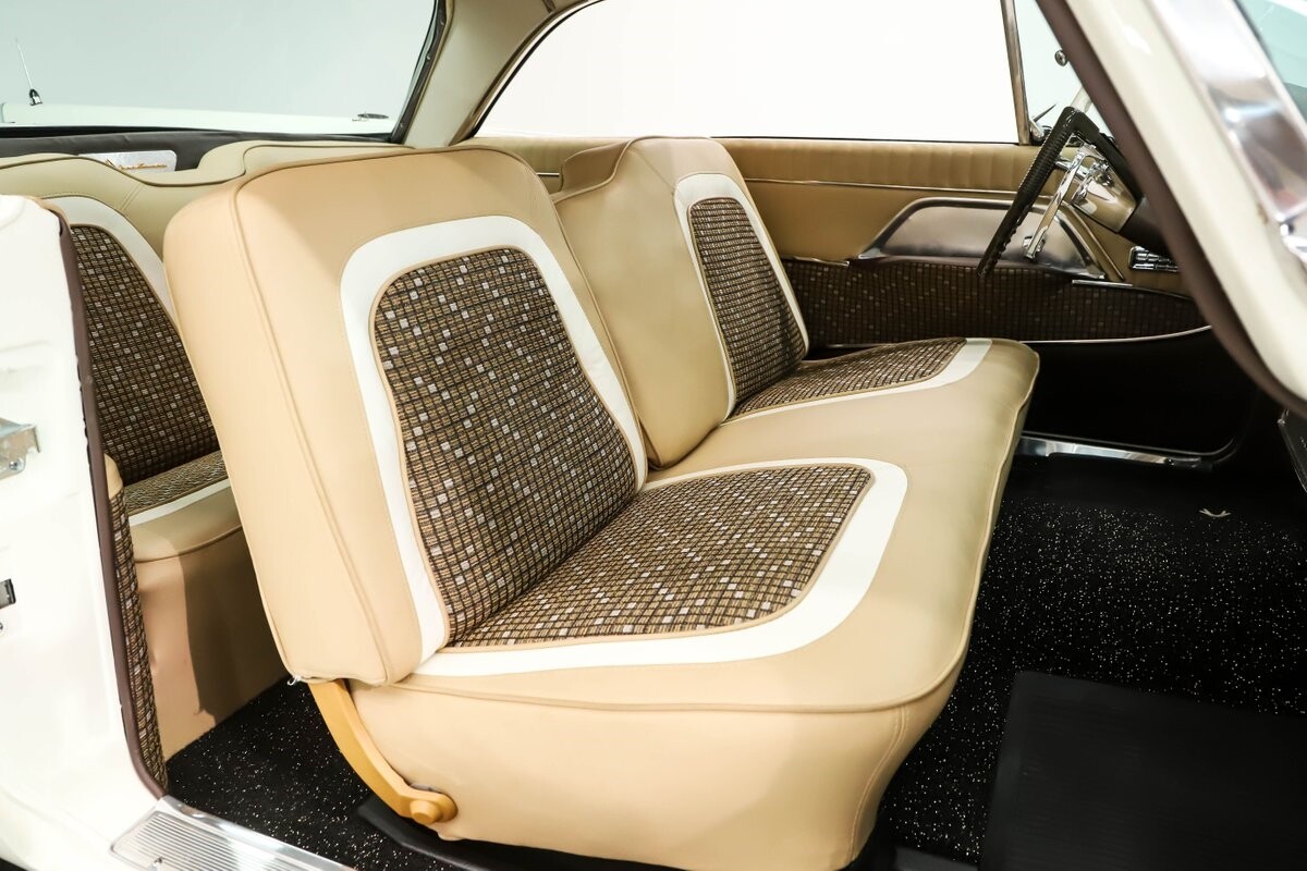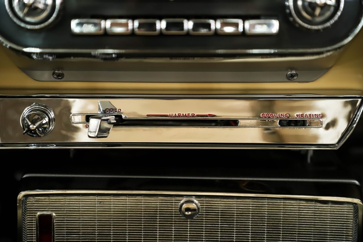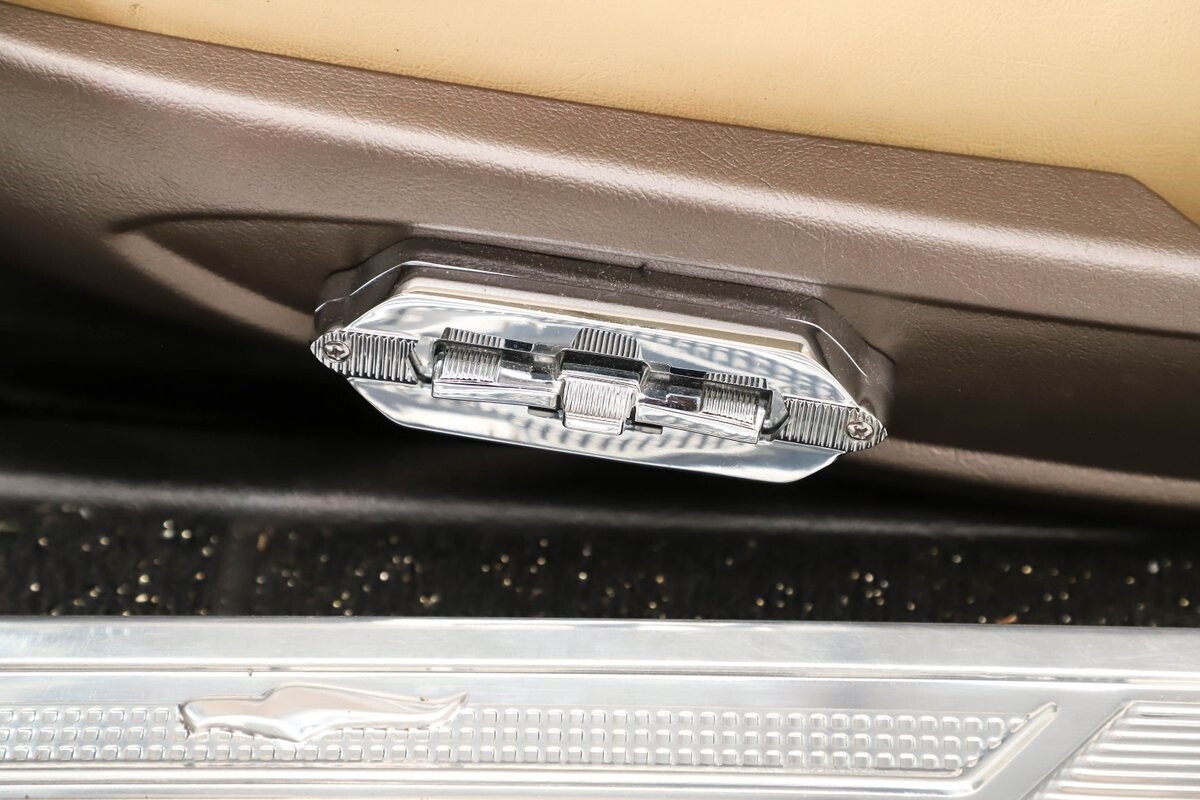 INTERIOR: The outside is cool, well so is the inside! From the silver tinsel carpet to the push button trans. All of the correct upholstery was used to restore the seats and door panels. The dash area is beautiful: the metal is painted, chrome knobs and trim sparkles, gauges are mint, steering wheel is restored. Below the dash looks like a vintage record player but actually opens up to find a stereo. Overhead is a pristine white headliner and visors decorated with chrome bars and working dome lights. Power windows and power seat will make life a little easier.