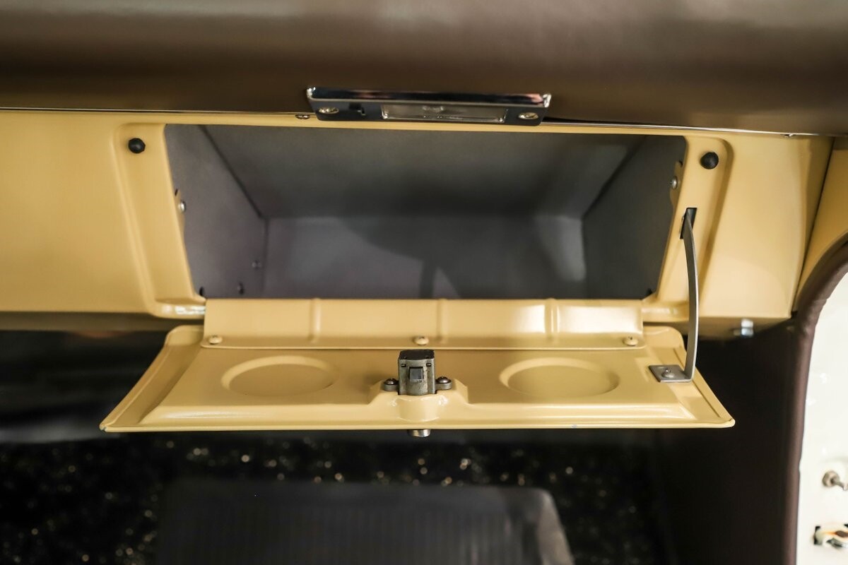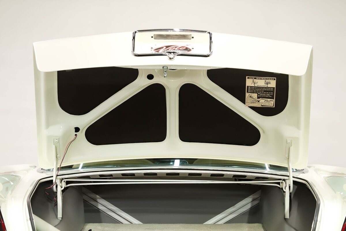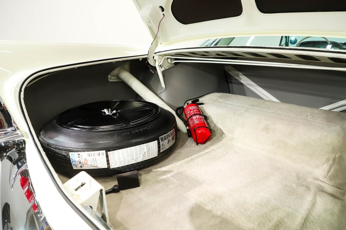 TRUNK COMPARTMENT: It is restored to brand new condition in here too. The metal is painted a smooth white finish. The correct liner kit was installed with a carpeted floor. The spare is a never used 5th reproduction white wall on a painted rim along with a restored jack assembly.