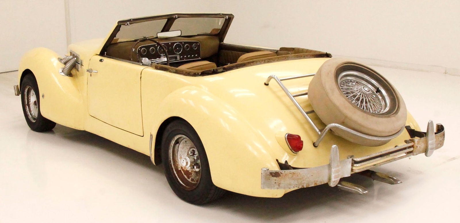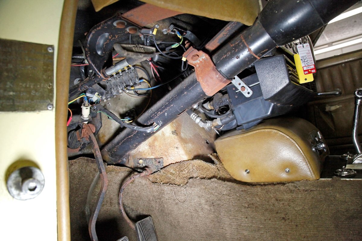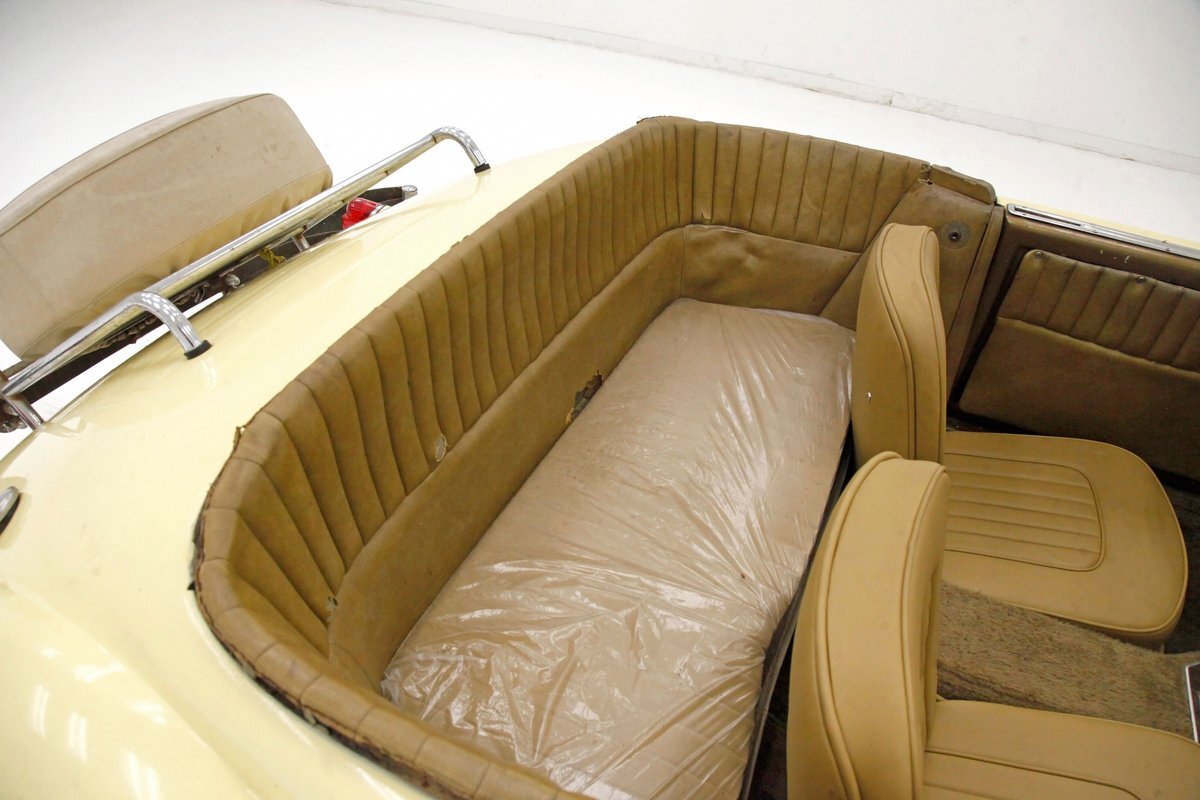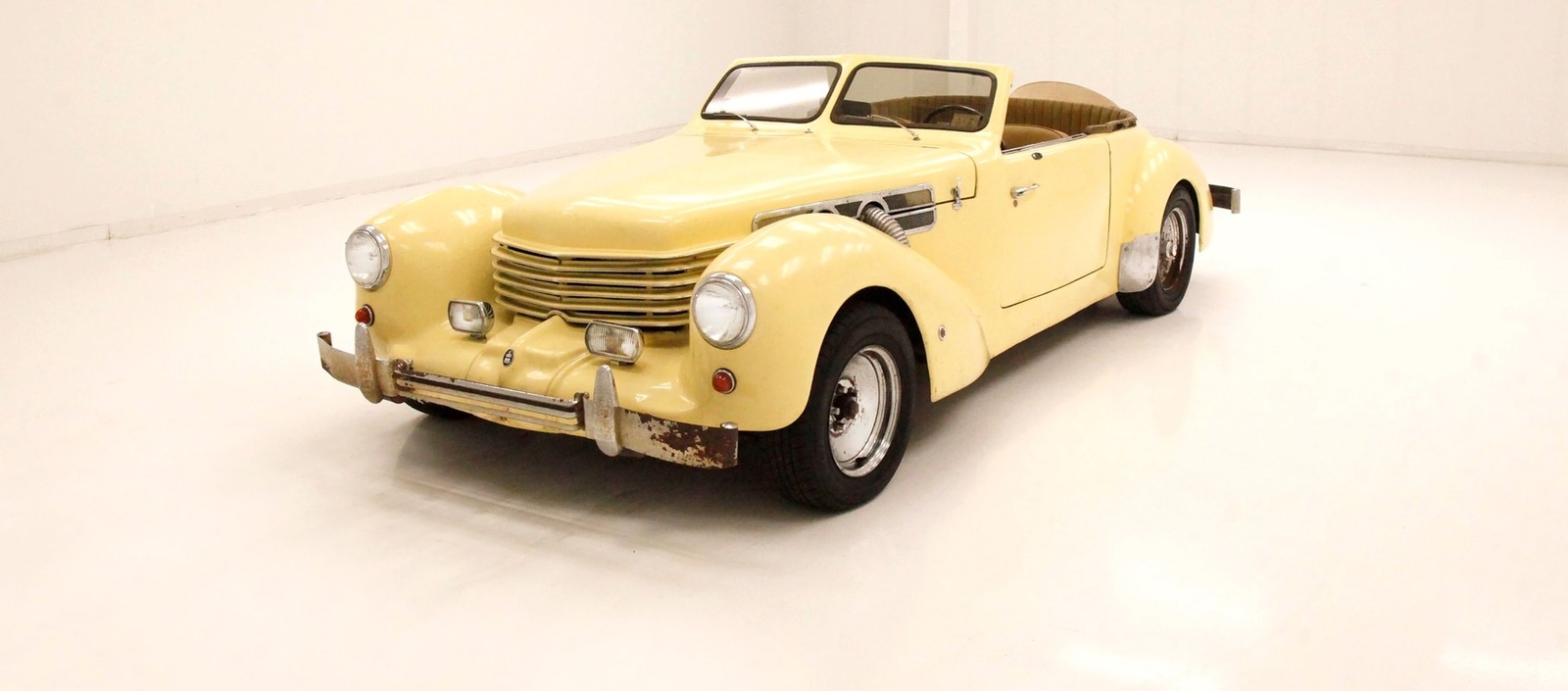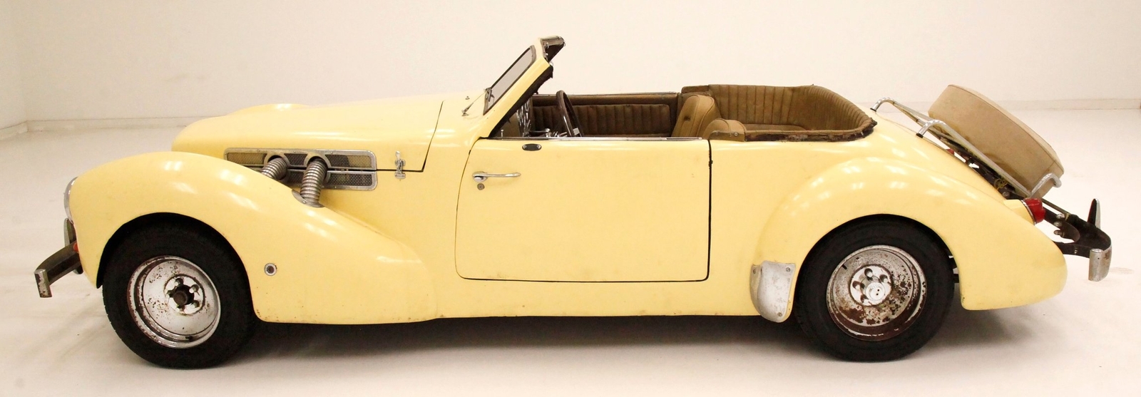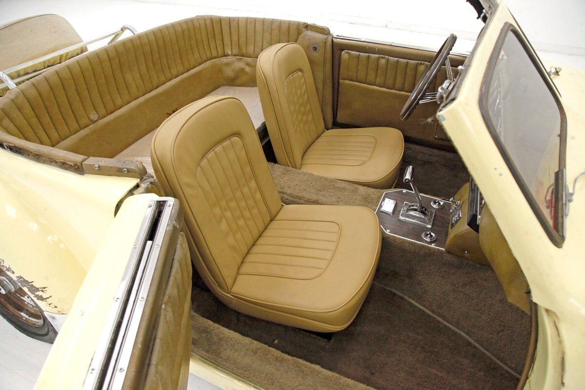 The Model 810/812 are probably the best-known of the Cord products and while this isn't an original, it has all the looks, charm and styling of one. The car's design is known for its flat front nose with a horizontal louvered grille design with fog lamps installed below instead of the common radiator-style grille, that made its nose resemble a coffin, earning it the nickname of "Coffin Nose" and this writer can spot that look instantly. This combined with a change from hidden lamps to headlights mounted within the pontoon like front fenders and long flat area beneath the nose and fenders, it is a very unusual design but nonetheless striking. A split windscreen which is swept rearward grows from the cowling and on the sides of the hood cowling we see faux exhaust vent pipes, reminiscent of the Cords of yore. The rear fenders, also pontoon inspired, meet up with the downward sloping trunk deck and end up on top of the rear bumper. A chrome luggage rack with tan canvas covered spare tire graces the swooping rear lines flanked to the sides by stand-off tail lights and a tarnished and rusted bumper below. 14-inch chromed steel wheels with a peppering of surface rust are rolled and wrapped with deeply treaded blackwall tires. The condition of the exterior surfaces is rough with blistering of the pale yellow paint on nearly every panel, but thankfully due to the fiberglass body construction rust isn't a concern at all. We note the bows for the manually actuated convertible top are included, but not top material is installed.