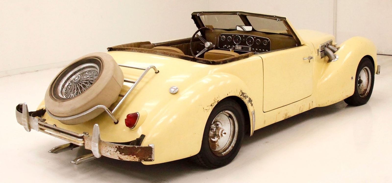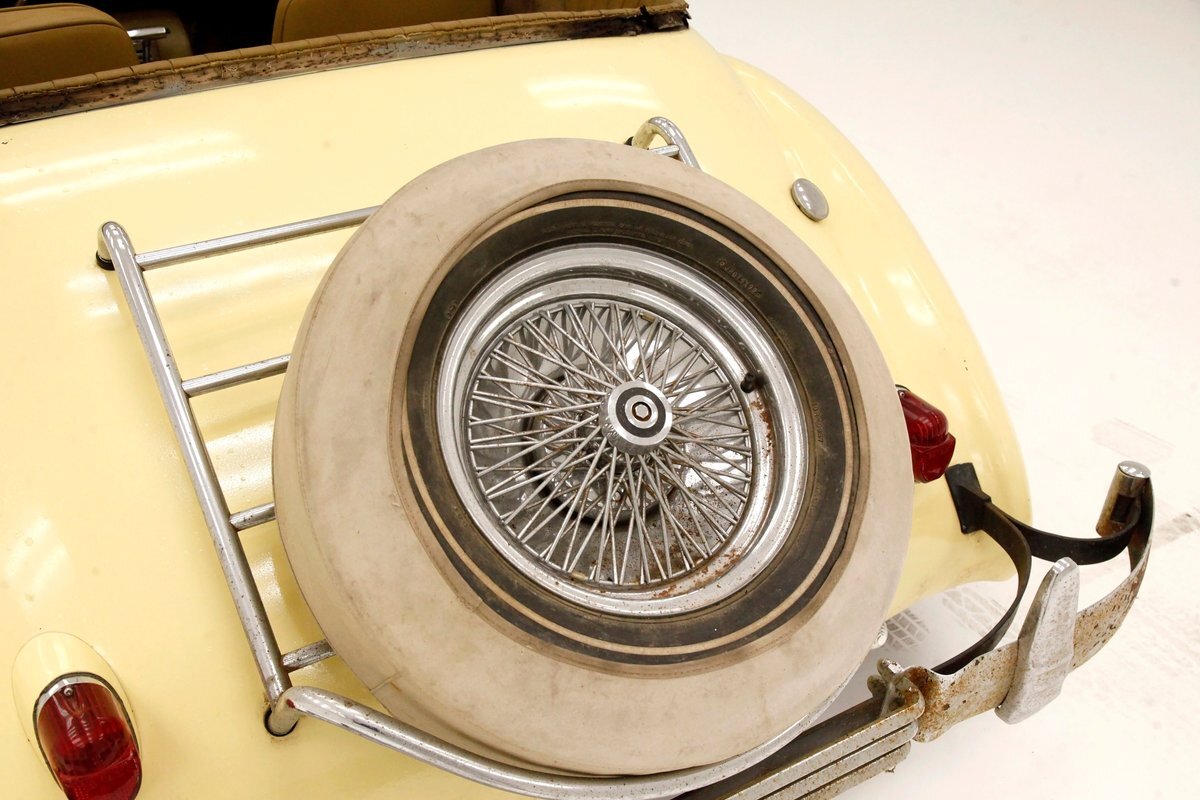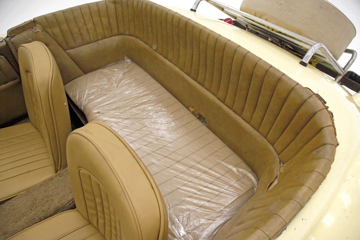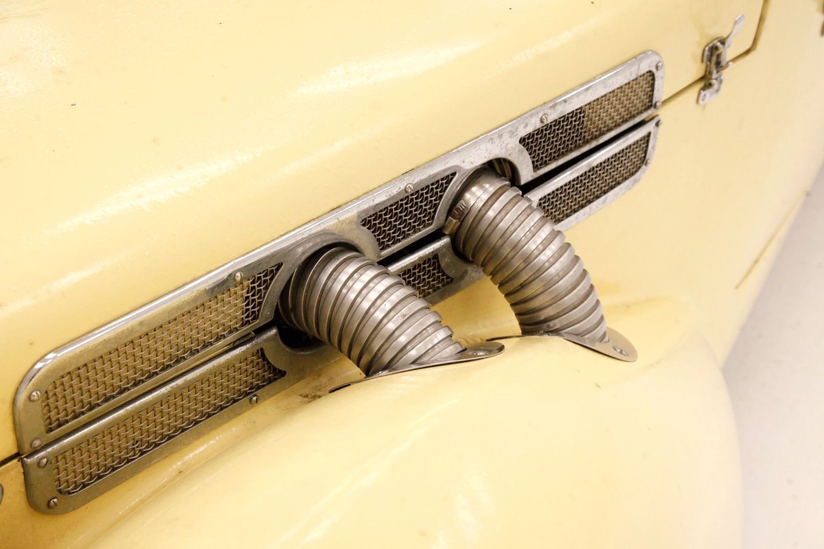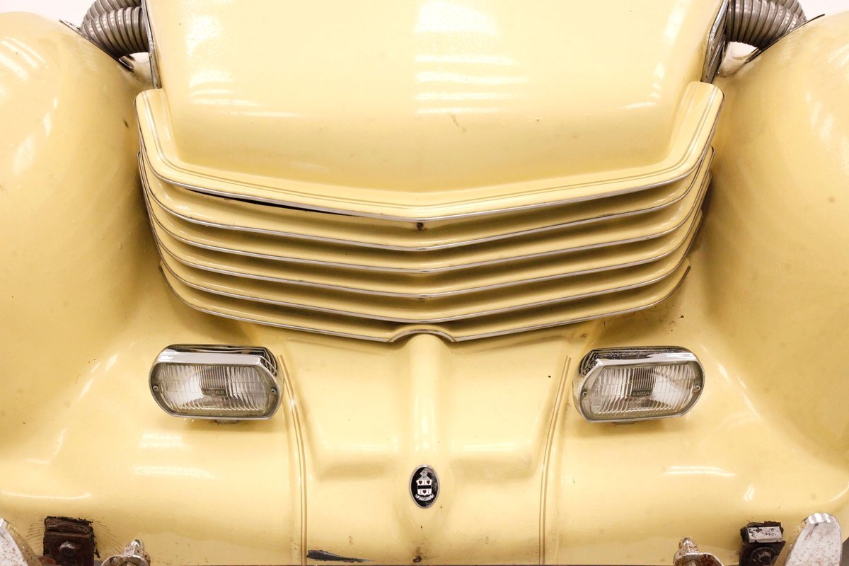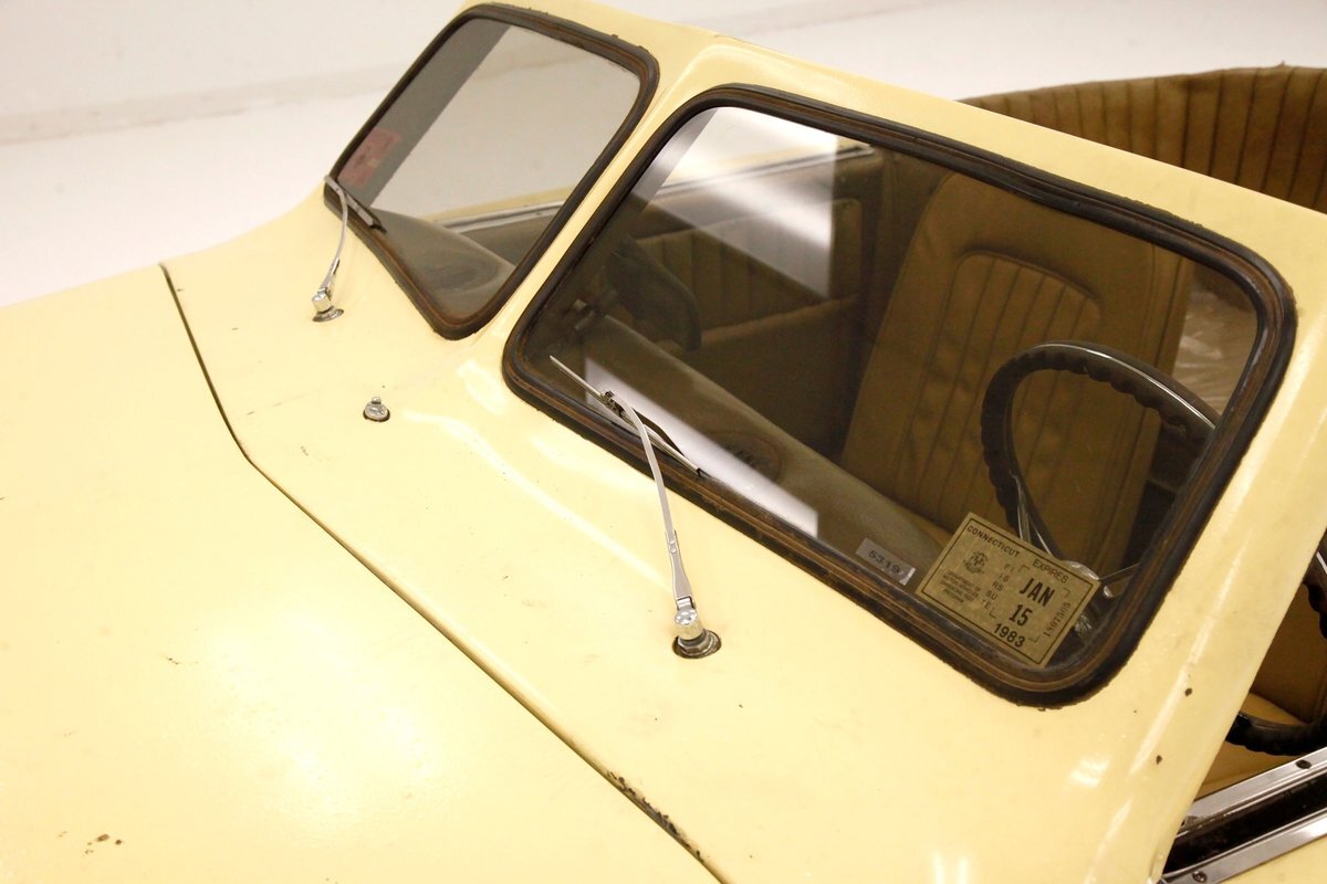 The Model 810/812 are probably the best-known of the Cord products and while this isn't an original, it has all the looks, charm and styling of one. The car's design is known for its flat front nose with a horizontal louvered grille design with fog lamps installed below instead of the common radiator-style grille, that made its nose resemble a coffin, earning it the nickname of "Coffin Nose" and this writer can spot that look instantly. This combined with a change from hidden lamps to headlights mounted within the pontoon like front fenders and long flat area beneath the nose and fenders, it is a very unusual design but nonetheless striking. A split windscreen which is swept rearward grows from the cowling and on the sides of the hood cowling we see faux exhaust vent pipes, reminiscent of the Cords of yore. The rear fenders, also pontoon inspired, meet up with the downward sloping trunk deck and end up on top of the rear bumper. A chrome luggage rack with tan canvas covered spare tire graces the swooping rear lines flanked to the sides by stand-off tail lights and a tarnished and rusted bumper below. 14-inch chromed steel wheels with a peppering of surface rust are rolled and wrapped with deeply treaded blackwall tires. The condition of the exterior surfaces is rough with blistering of the pale yellow paint on nearly every panel, but thankfully due to the fiberglass body construction rust isn't a concern at all. We note the bows for the manually actuated convertible top are included, but not top material is installed.