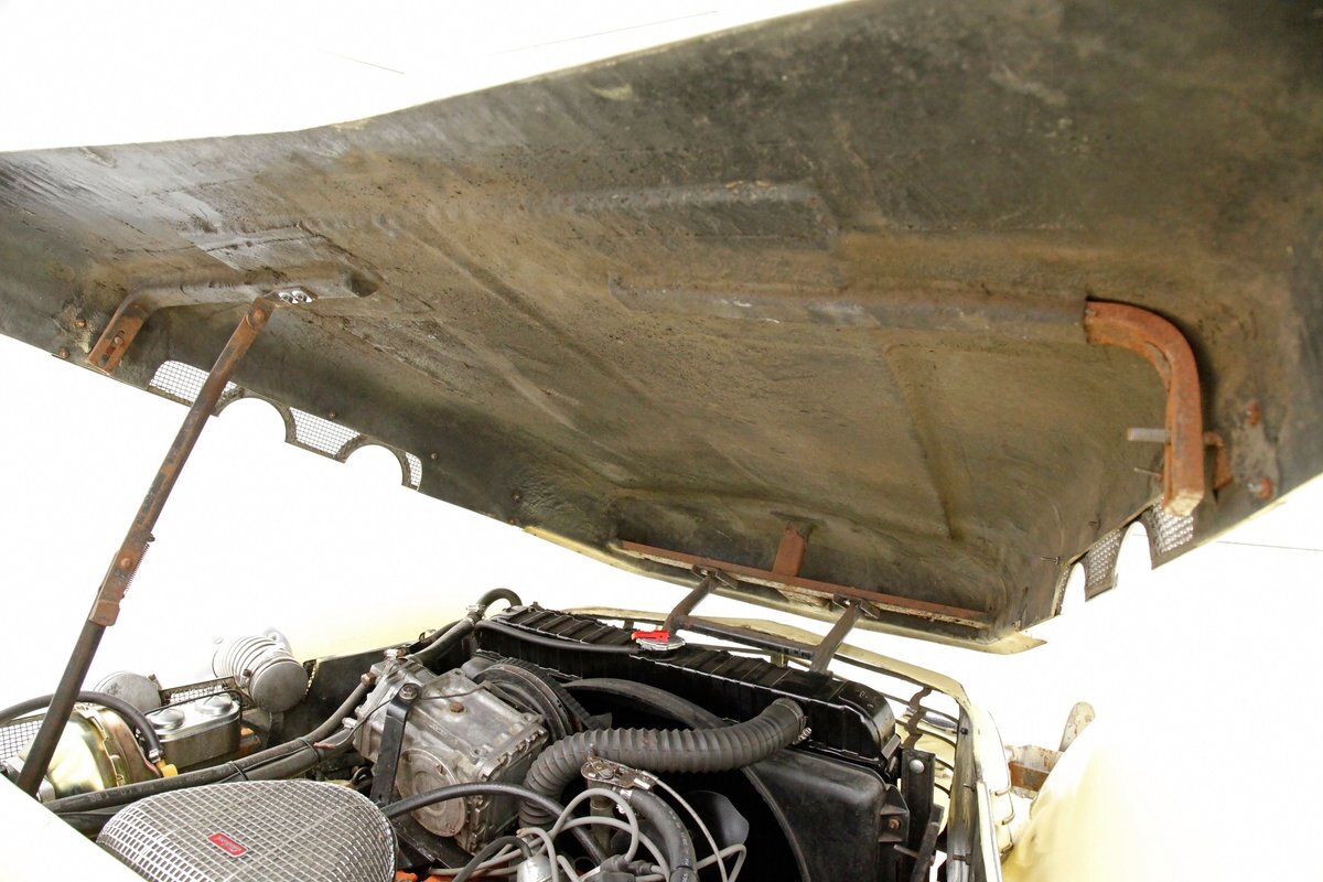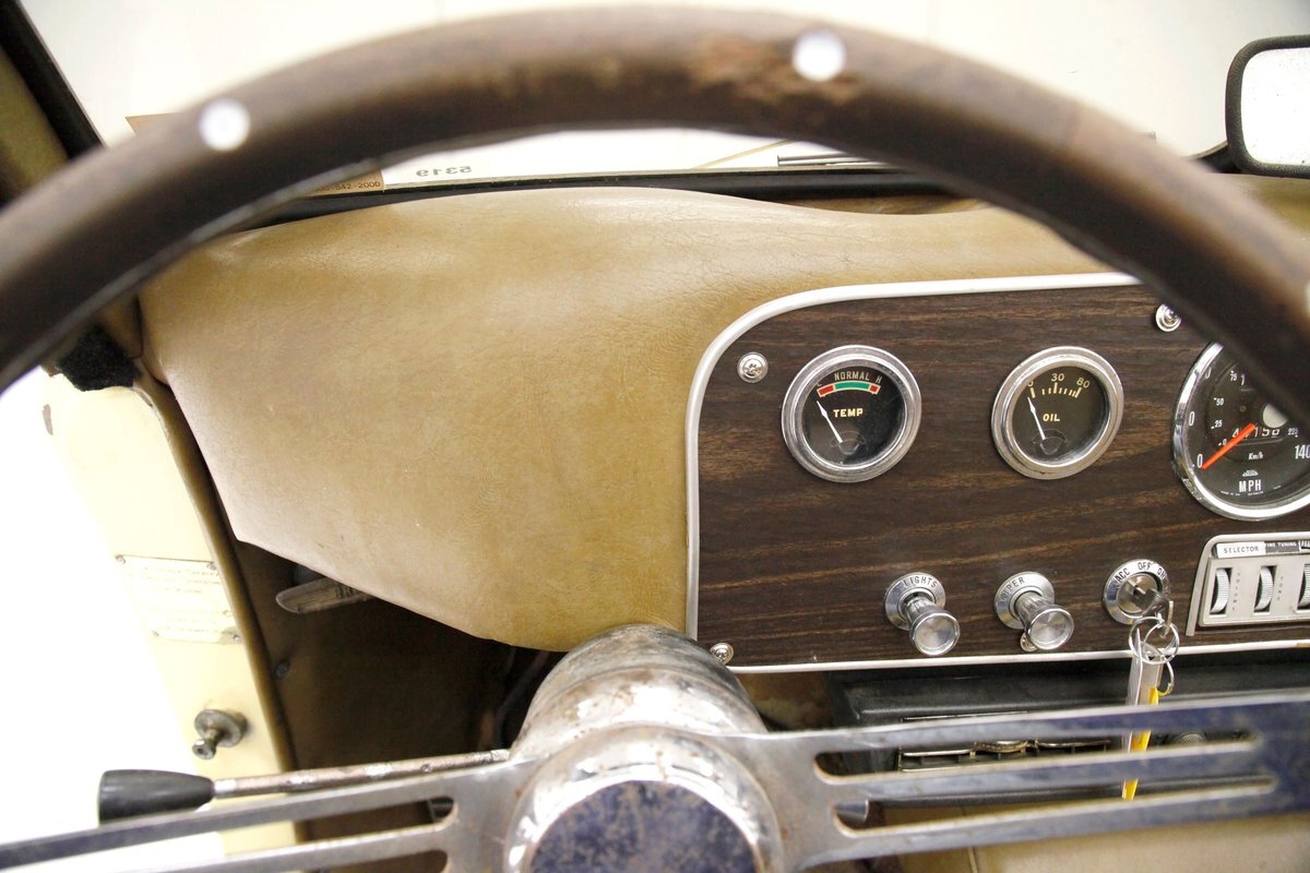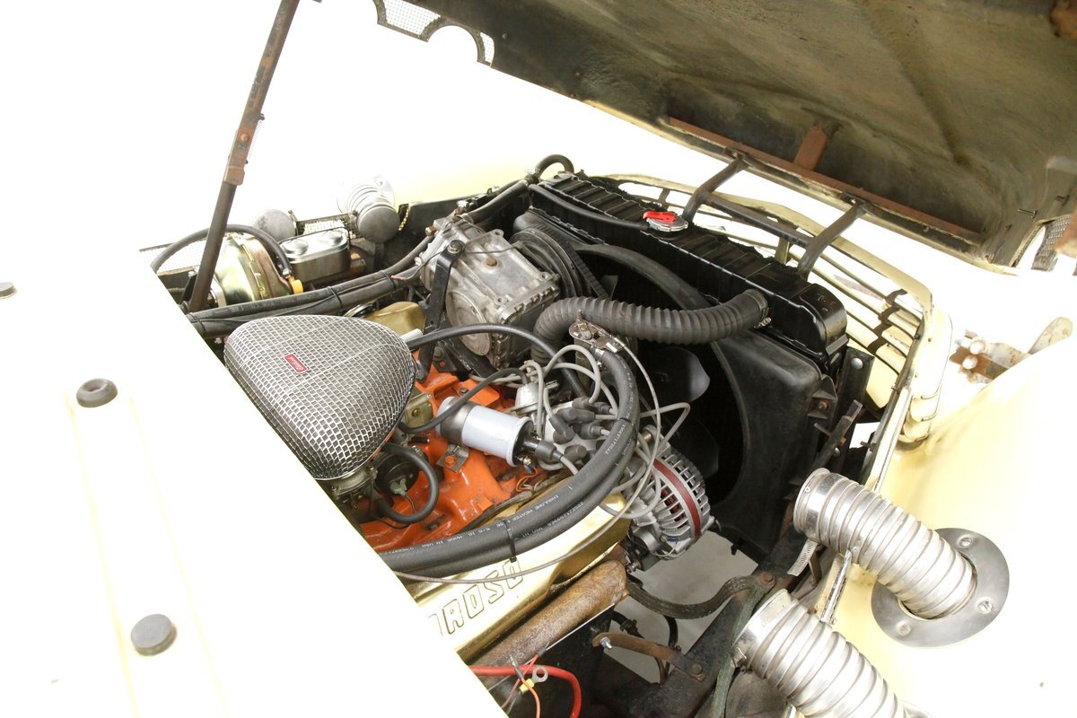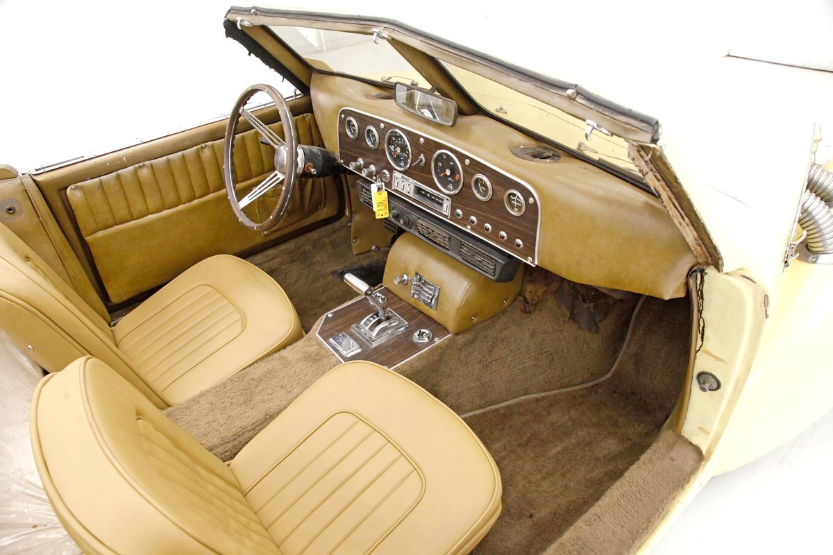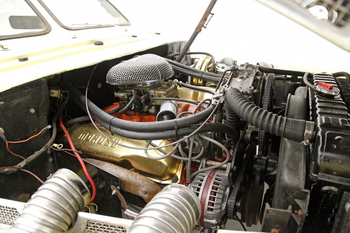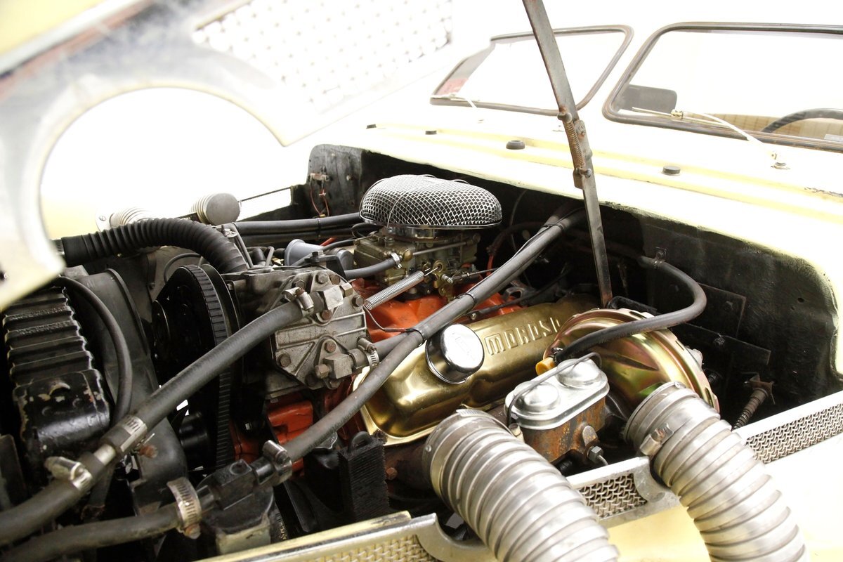 The Model 810/812 are probably the best-known of the Cord products and while this isn't an original, it has all the looks, charm and styling of one. The car's design is known for its flat front nose with a horizontal louvered grille design with fog lamps installed below instead of the common radiator-style grille, that made its nose resemble a coffin, earning it the nickname of "Coffin Nose" and this writer can spot that look instantly. This combined with a change from hidden lamps to headlights mounted within the pontoon like front fenders and long flat area beneath the nose and fenders, it is a very unusual design but nonetheless striking. A split windscreen which is swept rearward grows from the cowling and on the sides of the hood cowling we see faux exhaust vent pipes, reminiscent of the Cords of yore. The rear fenders, also pontoon inspired, meet up with the downward sloping trunk deck and end up on top of the rear bumper. A chrome luggage rack with tan canvas covered spare tire graces the swooping rear lines flanked to the sides by stand-off tail lights and a tarnished and rusted bumper below. 14-inch chromed steel wheels with a peppering of surface rust are rolled and wrapped with deeply treaded blackwall tires. The condition of the exterior surfaces is rough with blistering of the pale yellow paint on nearly every panel, but thankfully due to the fiberglass body construction rust isn't a concern at all. We note the bows for the manually actuated convertible top are included, but not top material is installed.