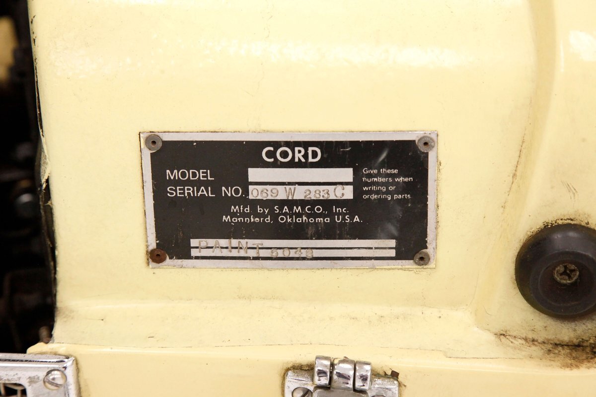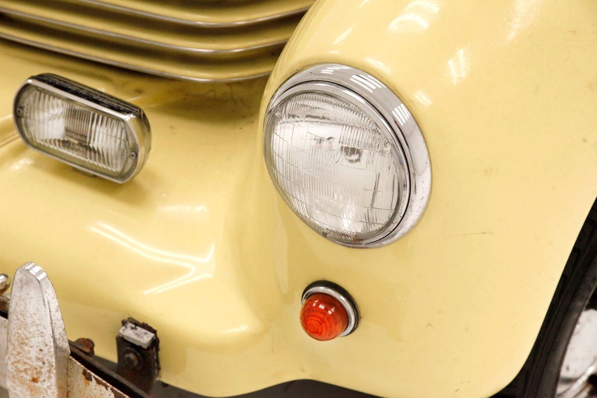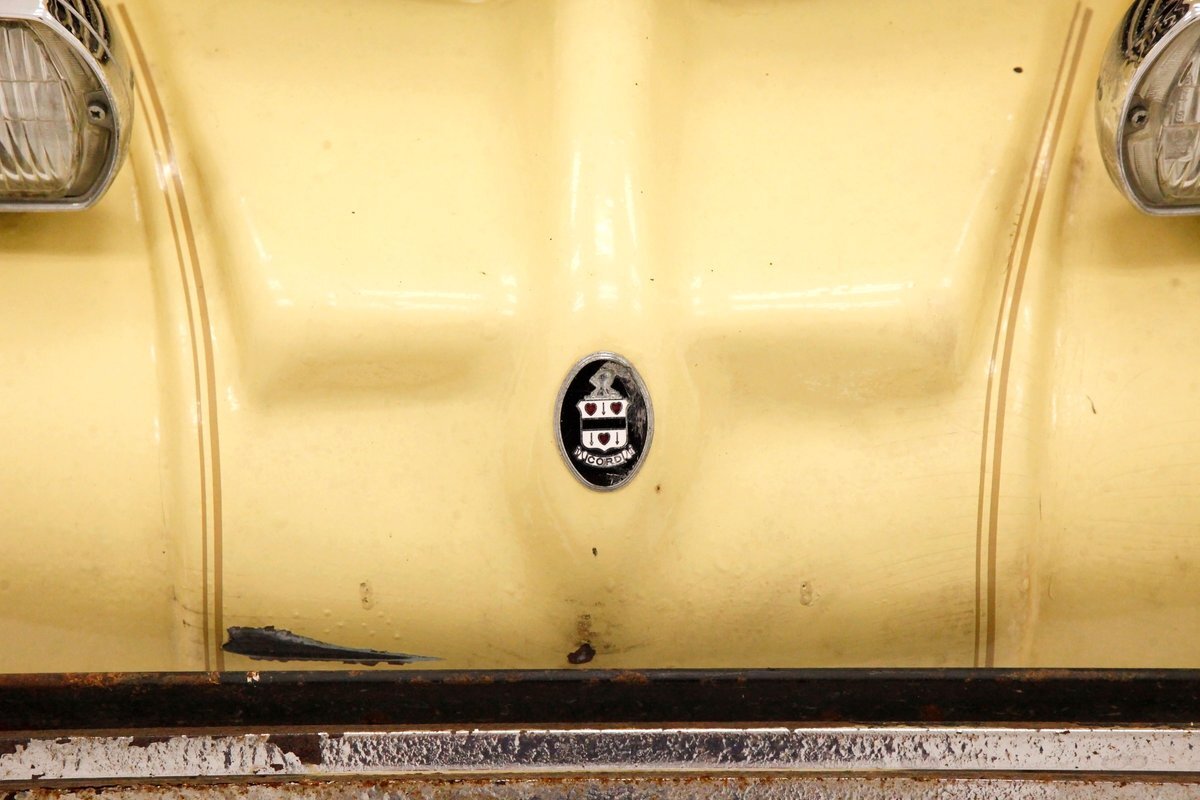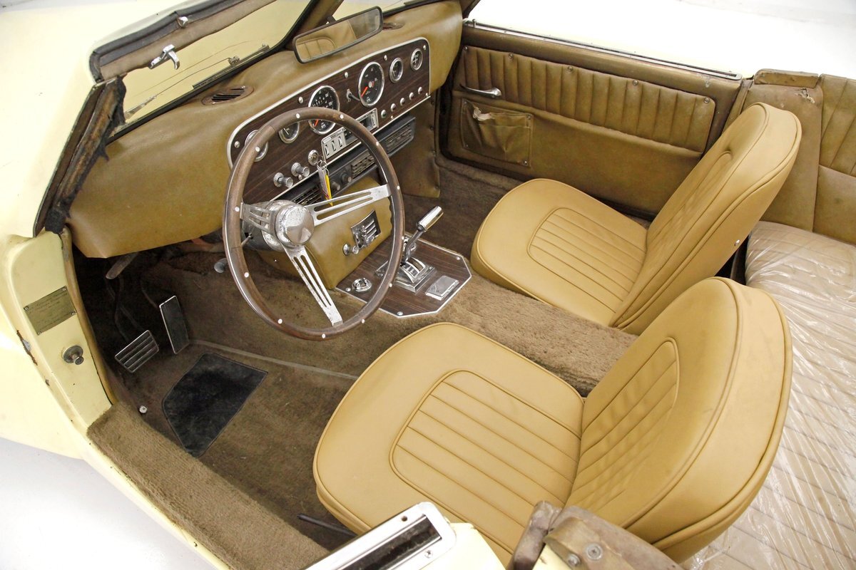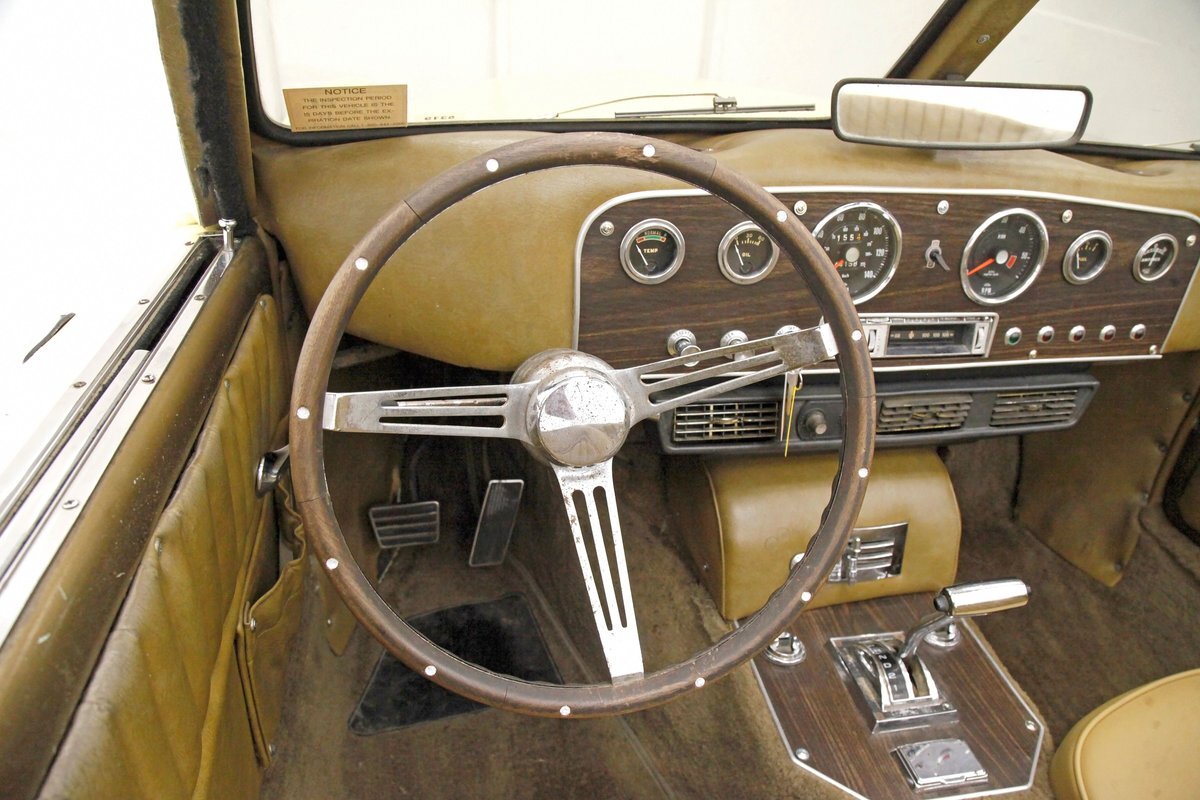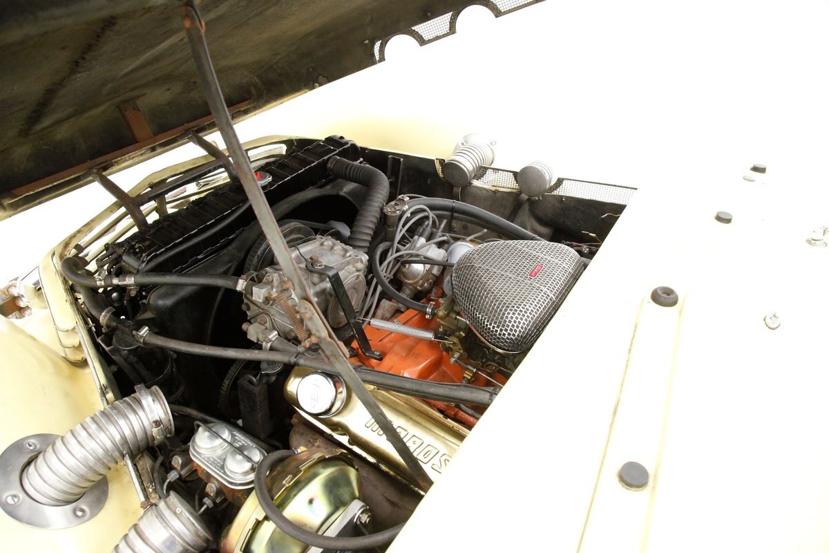The Model 810/812 are probably the best-known of the Cord products and while this isn't an original, it has all the looks, charm and styling of one. The car's design is known for its flat front nose with a horizontal louvered grille design with fog lamps installed below instead of the common radiator-style grille, that made its nose resemble a coffin, earning it the nickname of "Coffin Nose" and this writer can spot that look instantly. This combined with a change from hidden lamps to headlights mounted within the pontoon like front fenders and long flat area beneath the nose and fenders, it is a very unusual design but nonetheless striking. A split windscreen which is swept rearward grows from the cowling and on the sides of the hood cowling we see faux exhaust vent pipes, reminiscent of the Cords of yore. The rear fenders, also pontoon inspired, meet up with the downward sloping trunk deck and end up on top of the rear bumper. A chrome luggage rack with tan canvas covered spare tire graces the swooping rear lines flanked to the sides by stand-off tail lights and a tarnished and rusted bumper below. 14-inch chromed steel wheels with a peppering of surface rust are rolled and wrapped with deeply treaded blackwall tires. The condition of the exterior surfaces is rough with blistering of the pale yellow paint on nearly every panel, but thankfully due to the fiberglass body construction rust isn't a concern at all. We note the bows for the manually actuated convertible top are included, but not top material is installed.