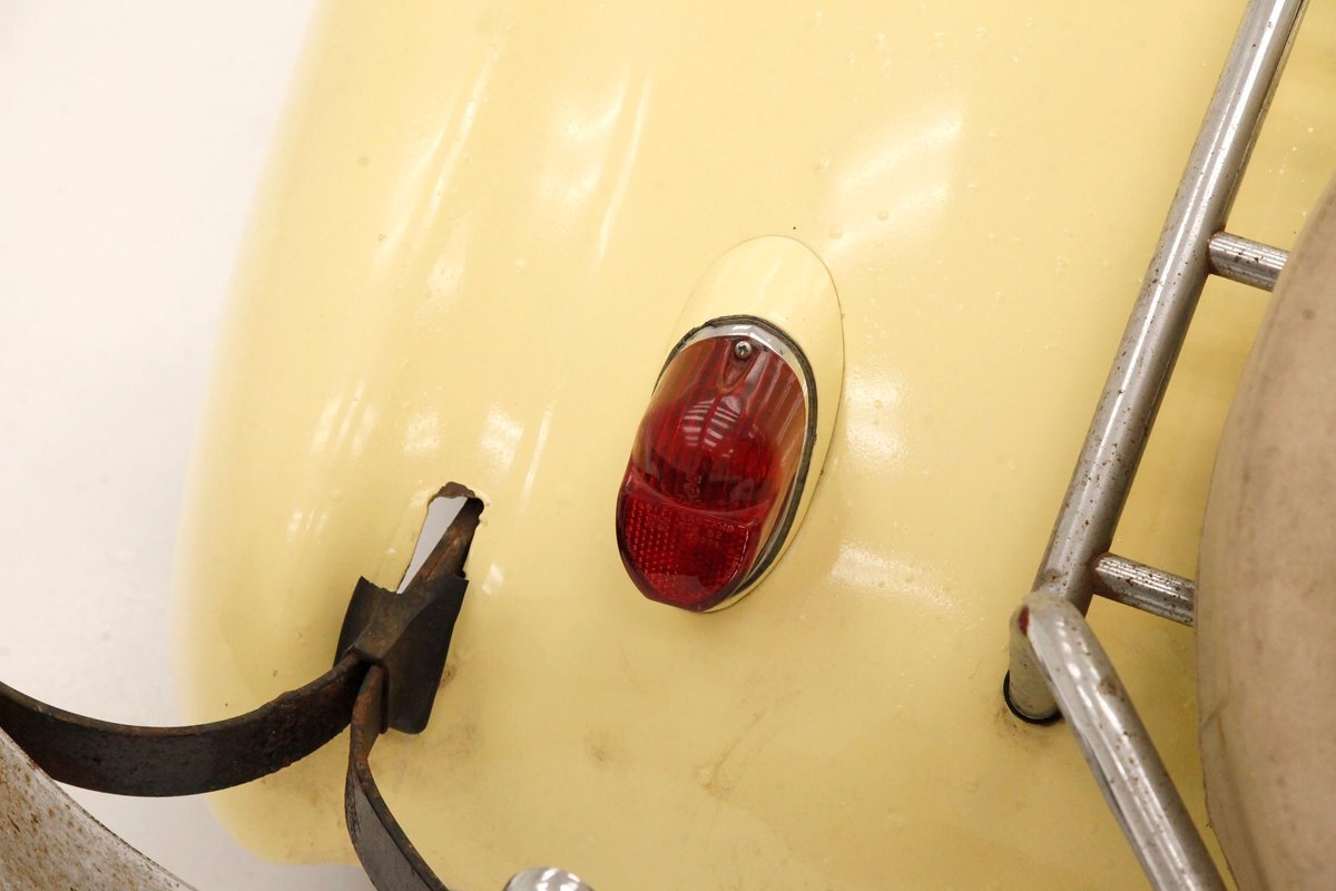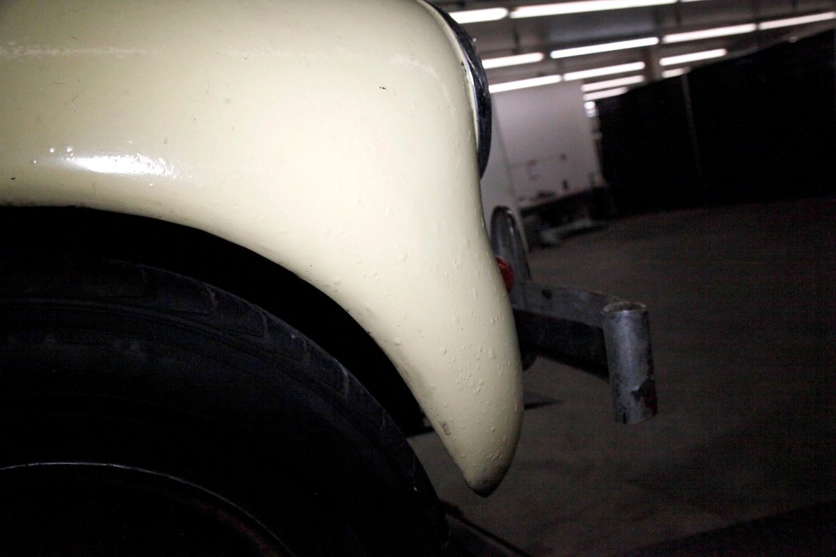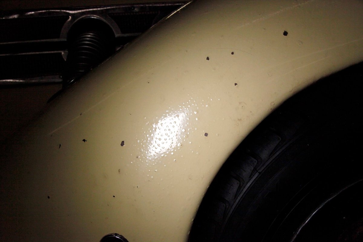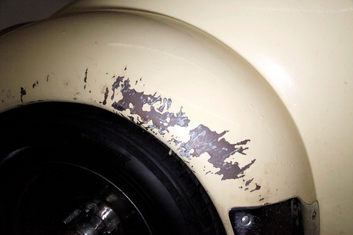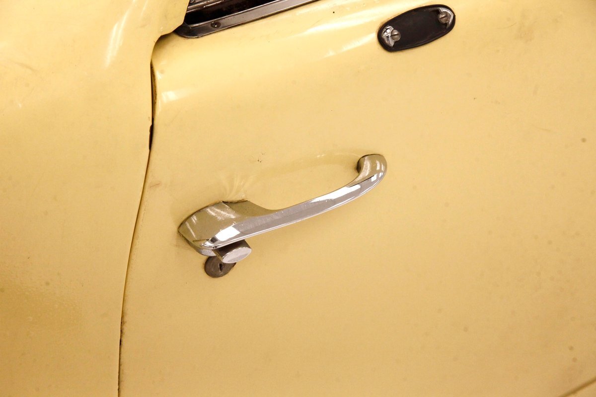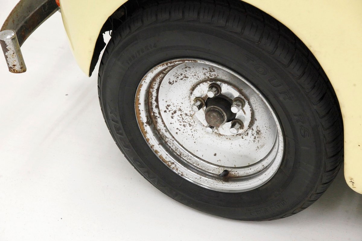 The Model 810/812 are probably the best-known of the Cord products and while this isn't an original, it has all the looks, charm and styling of one. The car's design is known for its flat front nose with a horizontal louvered grille design with fog lamps installed below instead of the common radiator-style grille, that made its nose resemble a coffin, earning it the nickname of "Coffin Nose" and this writer can spot that look instantly. This combined with a change from hidden lamps to headlights mounted within the pontoon like front fenders and long flat area beneath the nose and fenders, it is a very unusual design but nonetheless striking. A split windscreen which is swept rearward grows from the cowling and on the sides of the hood cowling we see faux exhaust vent pipes, reminiscent of the Cords of yore. The rear fenders, also pontoon inspired, meet up with the downward sloping trunk deck and end up on top of the rear bumper. A chrome luggage rack with tan canvas covered spare tire graces the swooping rear lines flanked to the sides by stand-off tail lights and a tarnished and rusted bumper below. 14-inch chromed steel wheels with a peppering of surface rust are rolled and wrapped with deeply treaded blackwall tires. The condition of the exterior surfaces is rough with blistering of the pale yellow paint on nearly every panel, but thankfully due to the fiberglass body construction rust isn't a concern at all. We note the bows for the manually actuated convertible top are included, but not top material is installed.