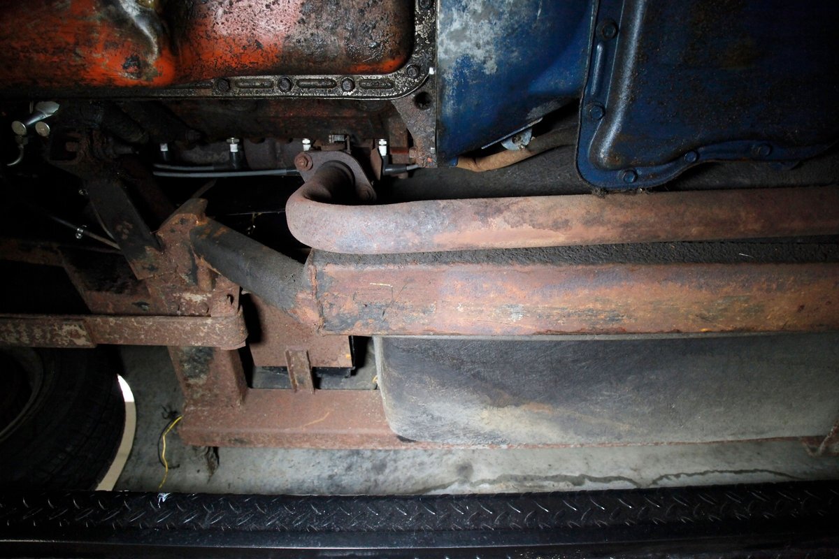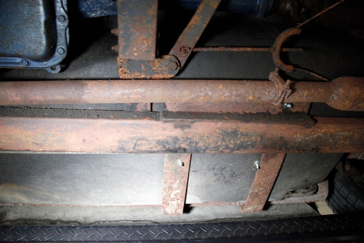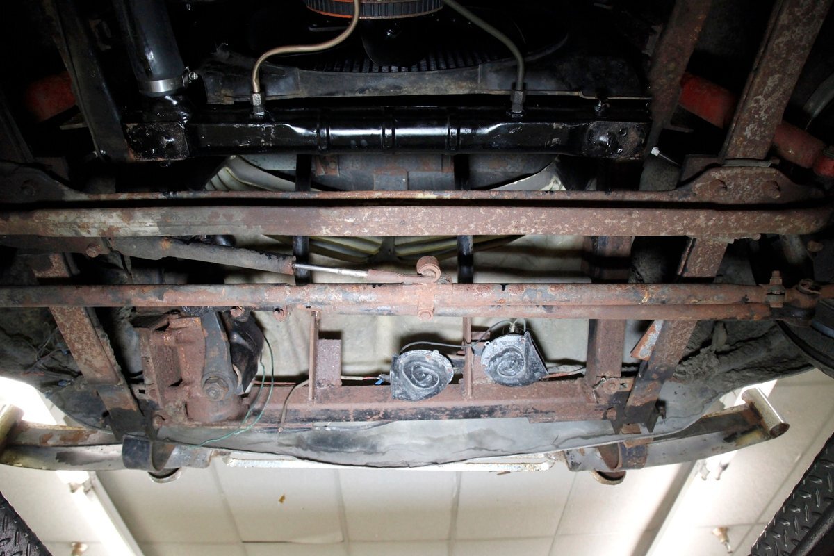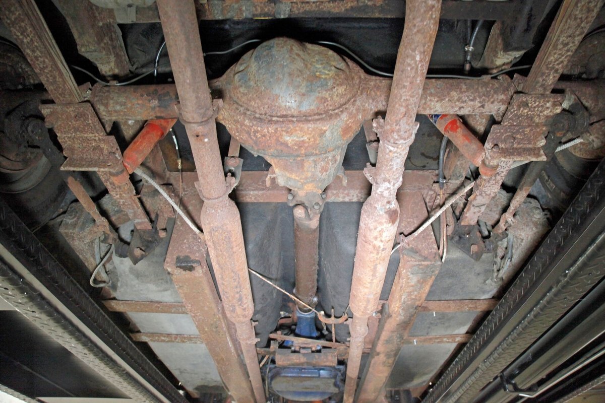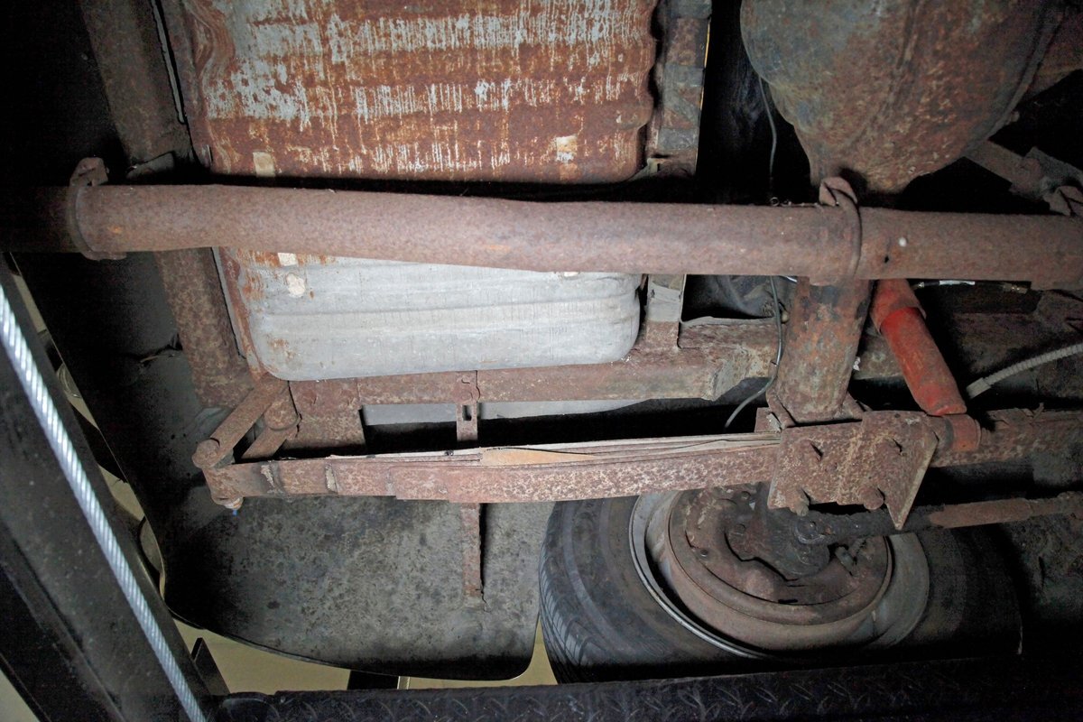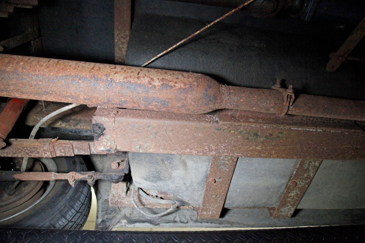 Plenty of road dirt, some earlier rustproofing which is wearing off and surface rust are noted underneath. A square tube frame supports the fiberglass flooring and shows with surface rust as well. Power drum brakes are on for the front and rear along with leaf spring suspension at both ends. Dual exhaust with glasspack mufflers is on for the exhale and maintains the surface rusted theme.