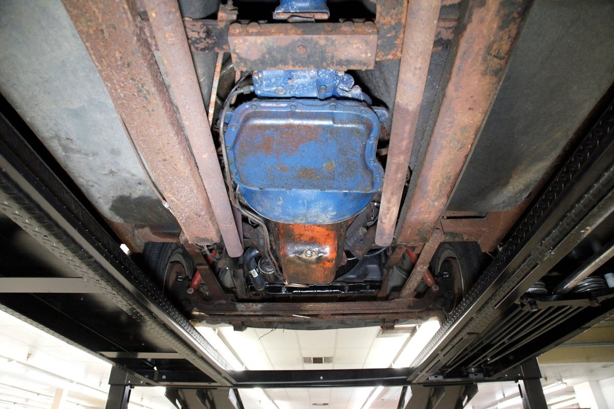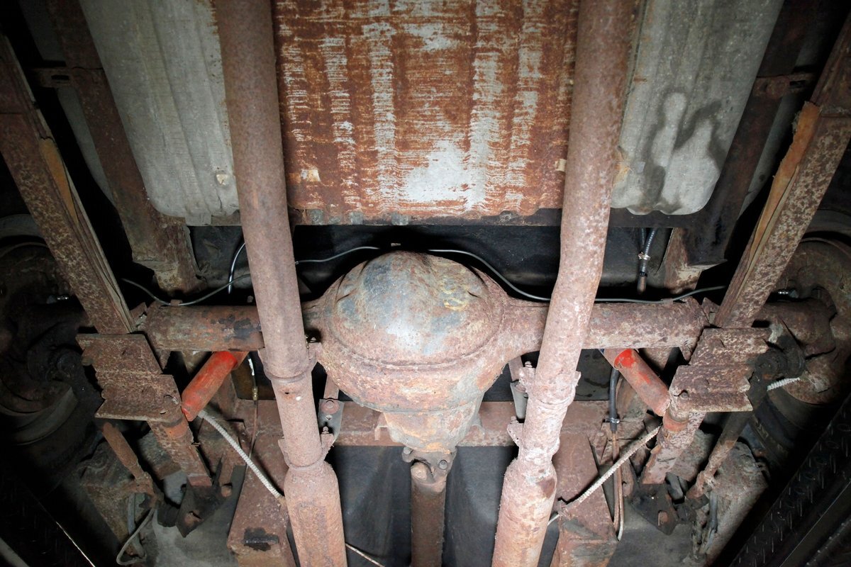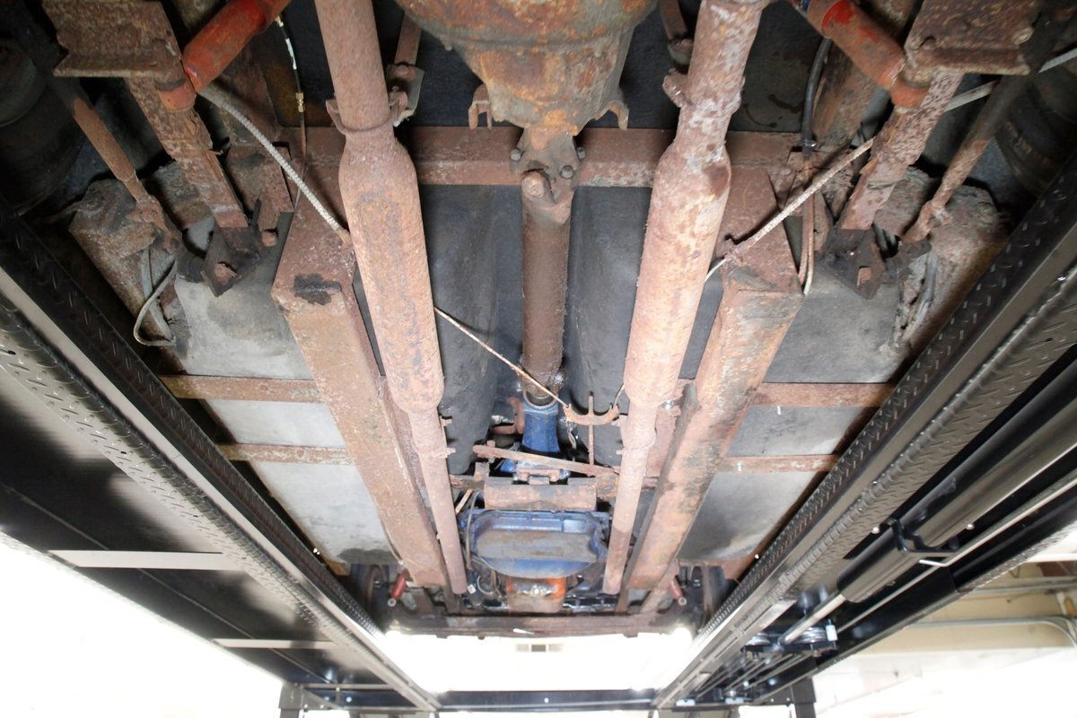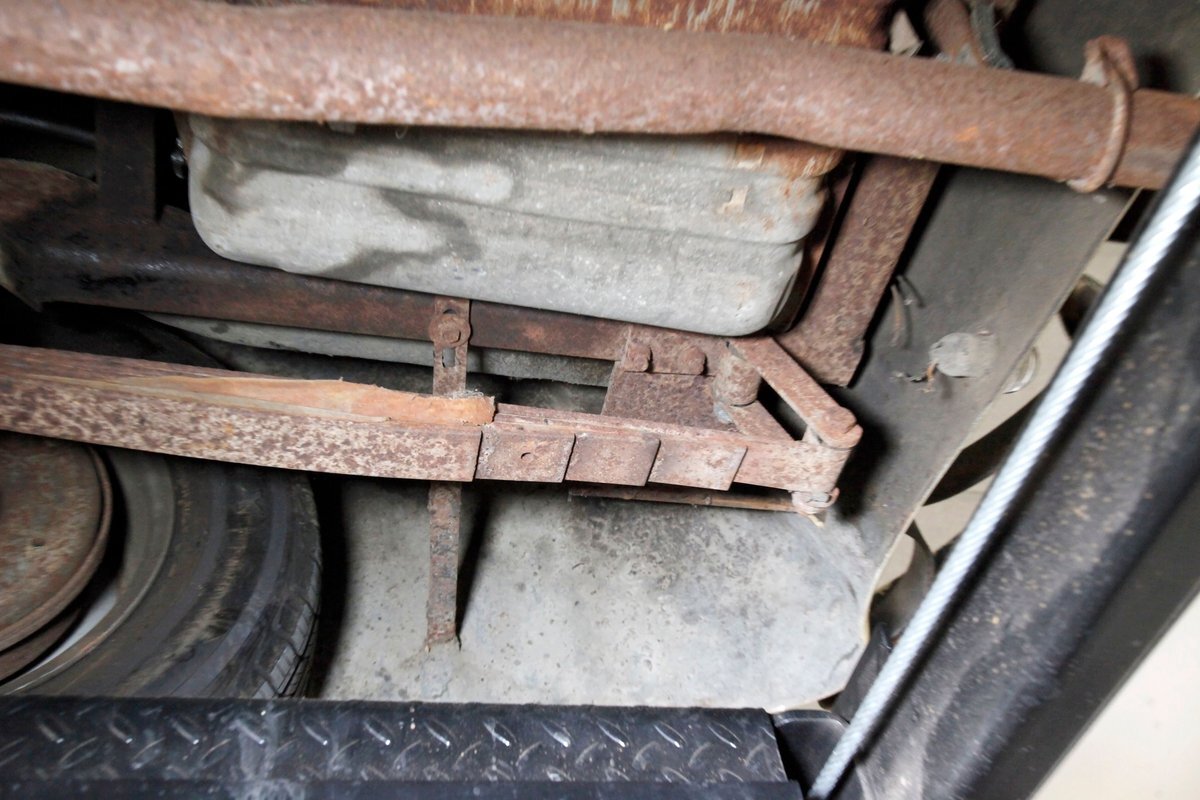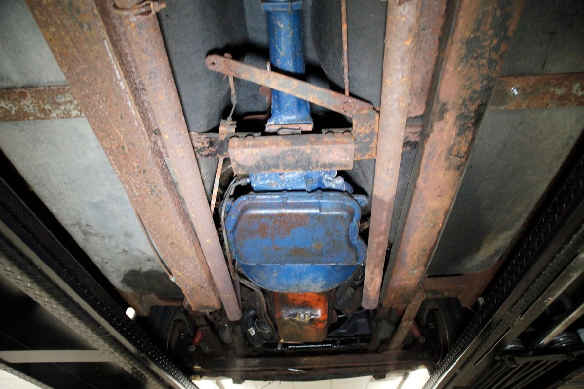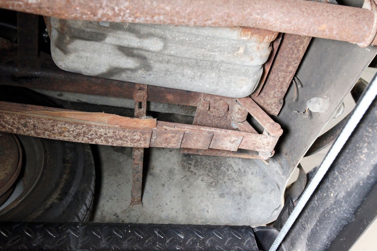 Plenty of road dirt, some earlier rustproofing which is wearing off and surface rust are noted underneath. A square tube frame supports the fiberglass flooring and shows with surface rust as well. Power drum brakes are on for the front and rear along with leaf spring suspension at both ends. Dual exhaust with glasspack mufflers is on for the exhale and maintains the surface rusted theme.