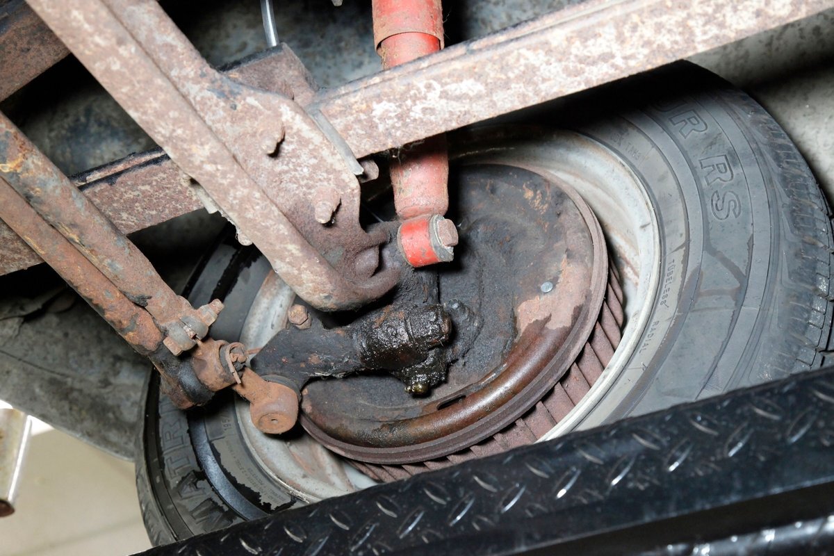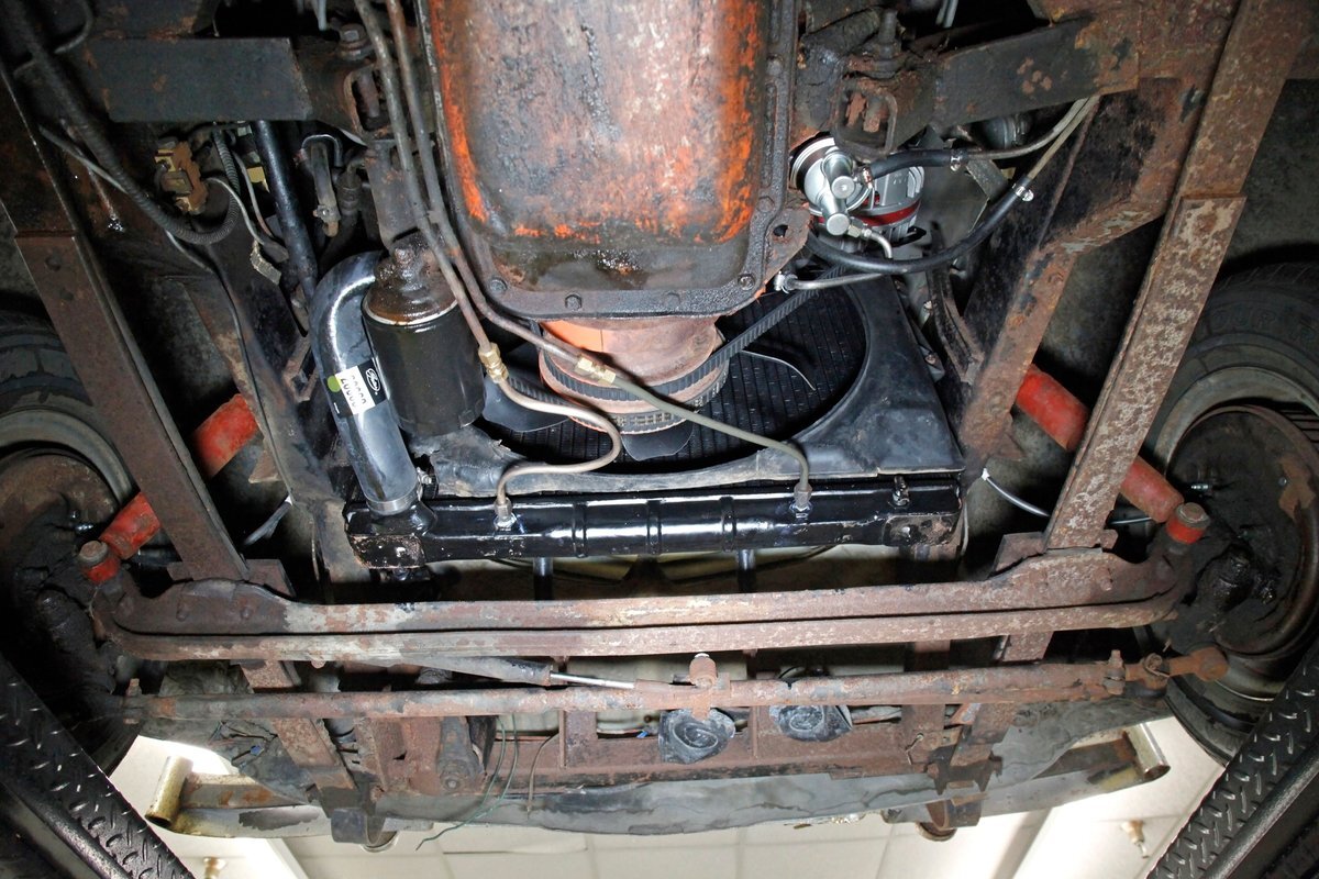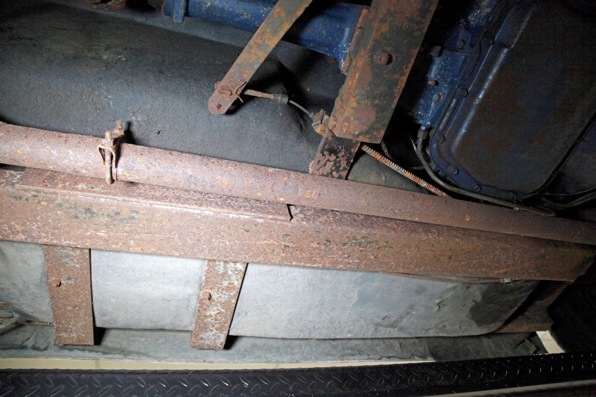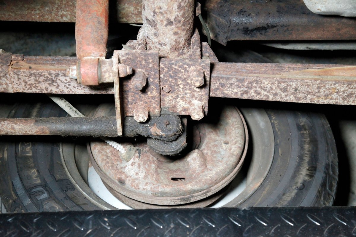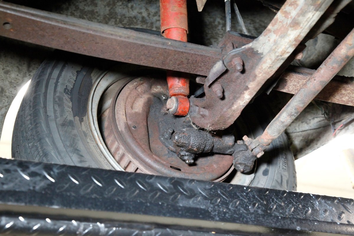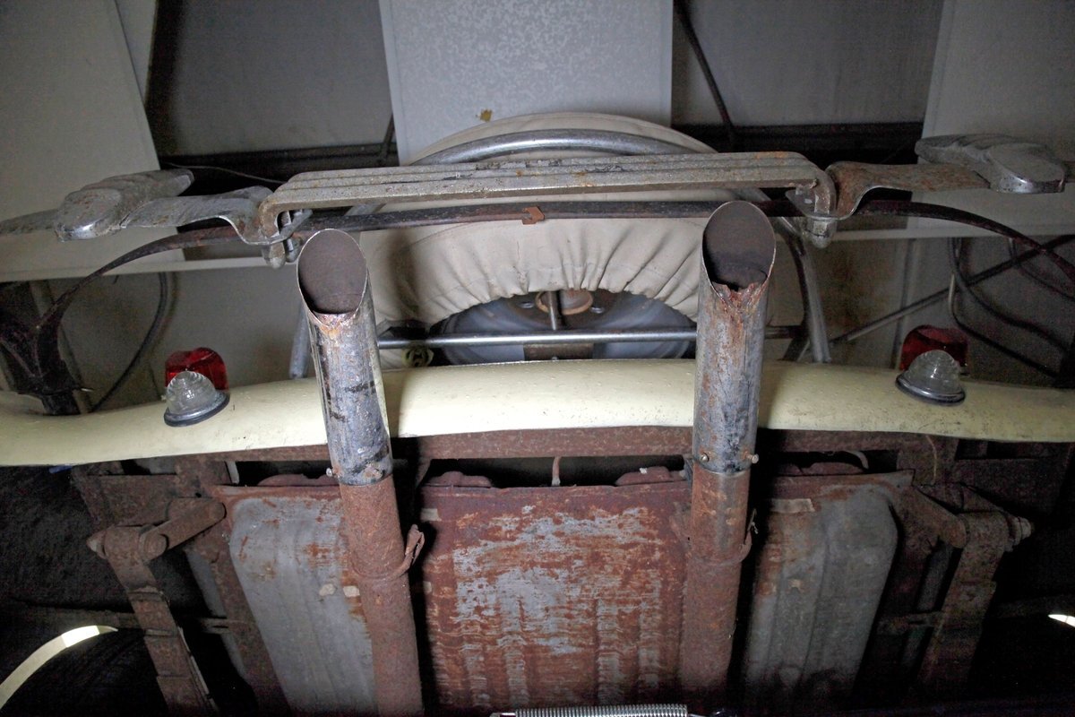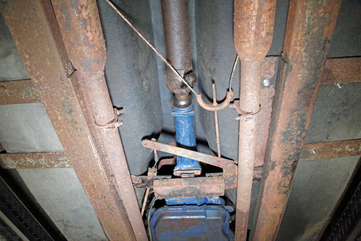 Plenty of road dirt, some earlier rustproofing which is wearing off and surface rust are noted underneath. A square tube frame supports the fiberglass flooring and shows with surface rust as well. Power drum brakes are on for the front and rear along with leaf spring suspension at both ends. Dual exhaust with glasspack mufflers is on for the exhale and maintains the surface rusted theme.