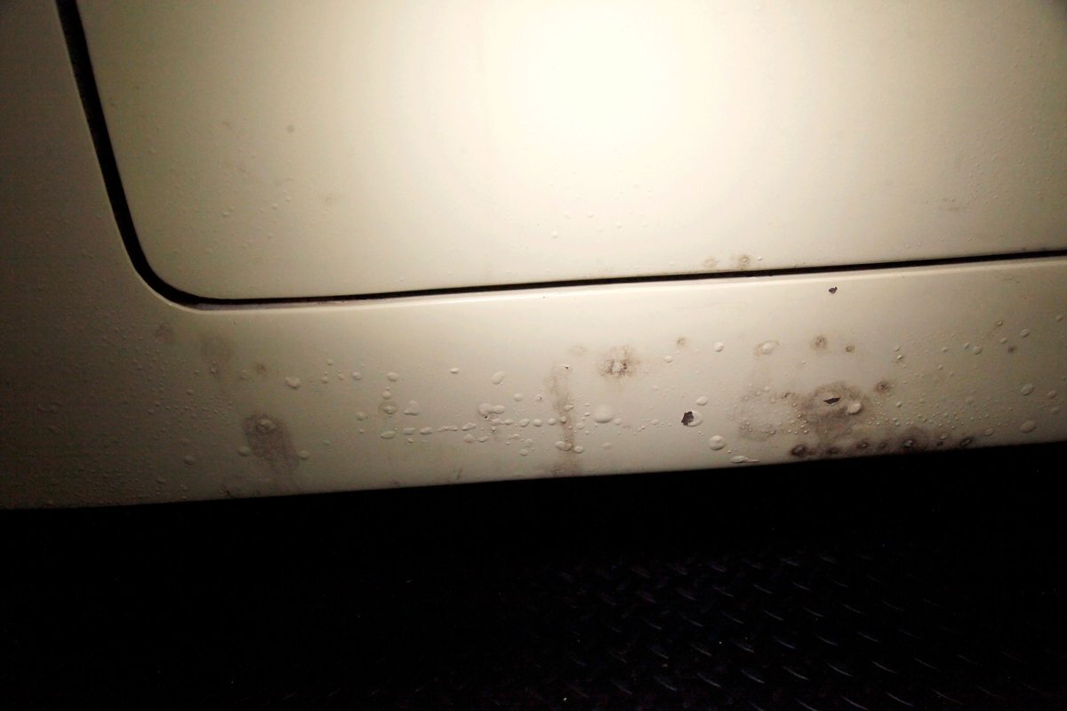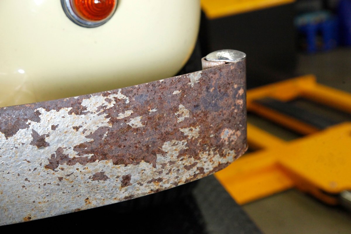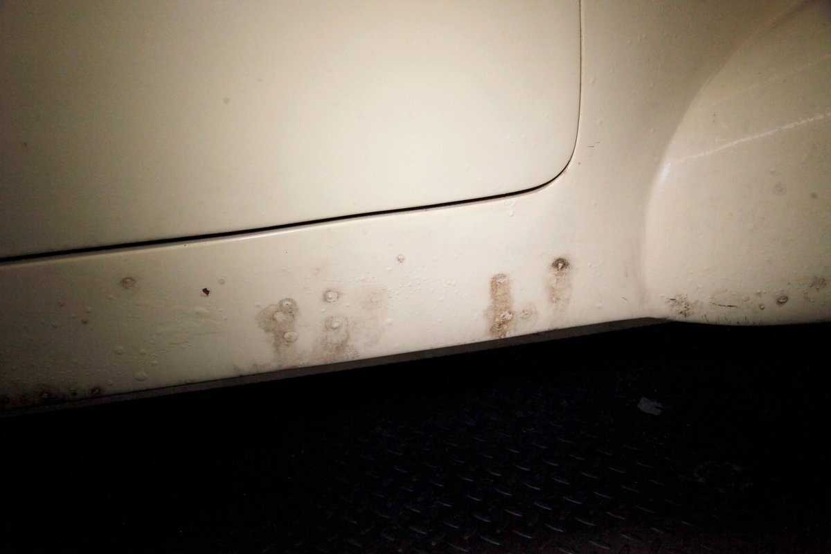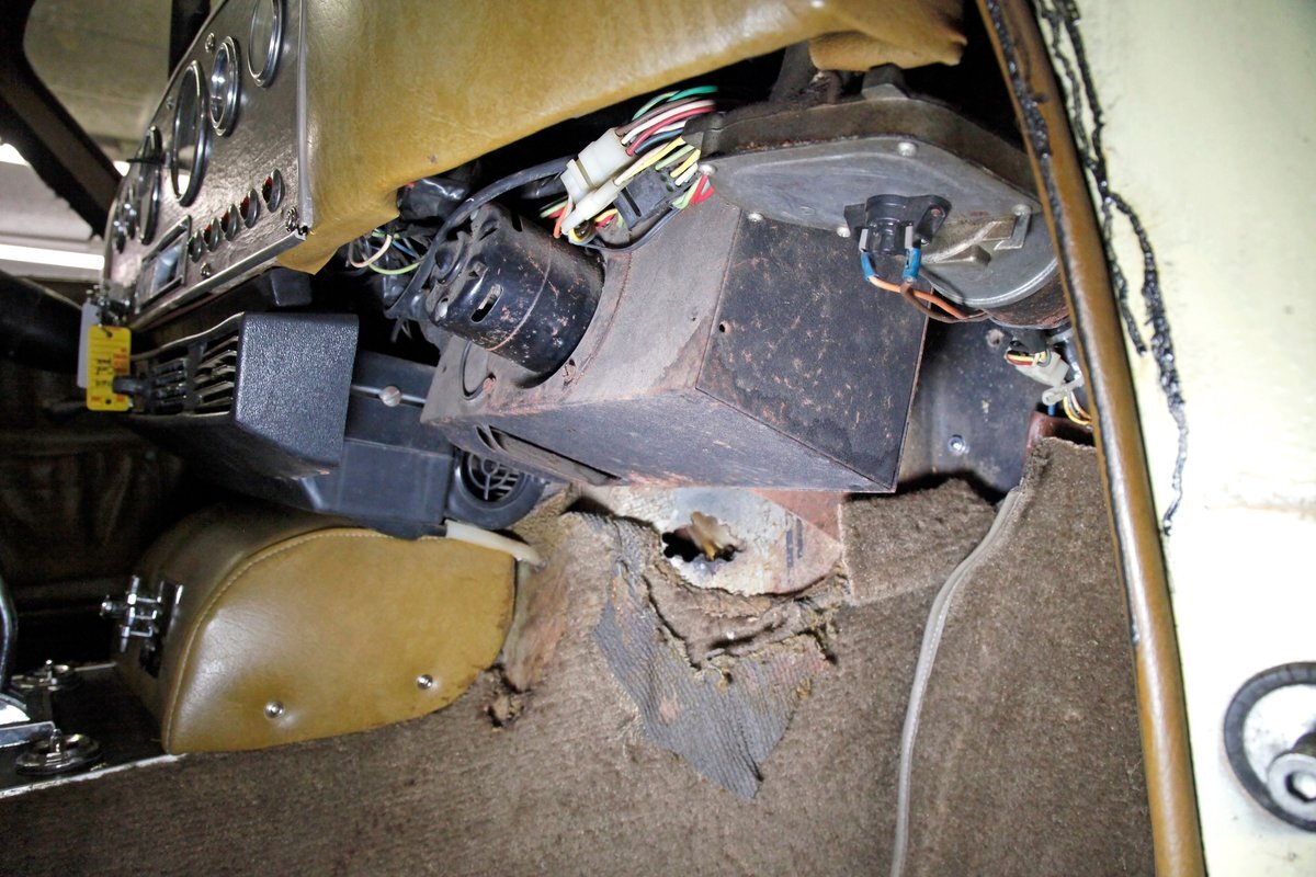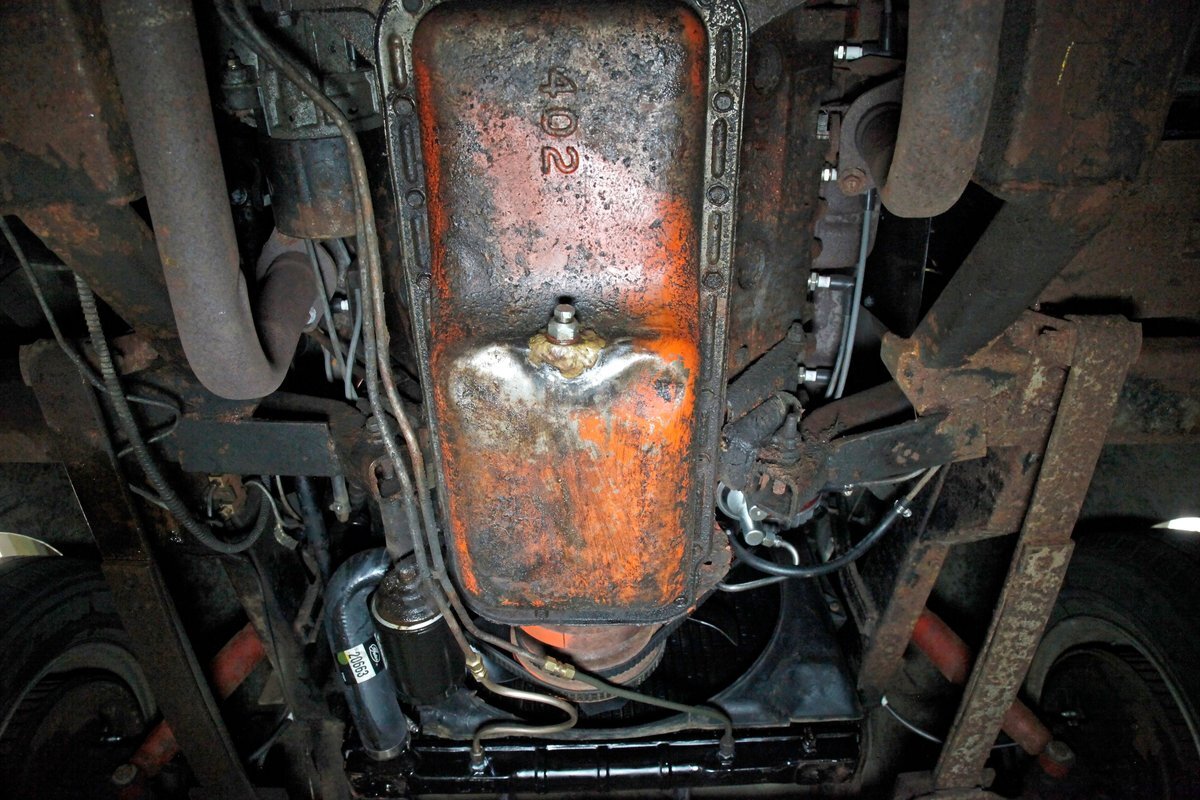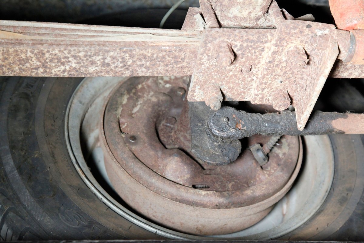 Plenty of road dirt, some earlier rustproofing which is wearing off and surface rust are noted underneath. A square tube frame supports the fiberglass flooring and shows with surface rust as well. Power drum brakes are on for the front and rear along with leaf spring suspension at both ends. Dual exhaust with glasspack mufflers is on for the exhale and maintains the surface rusted theme.