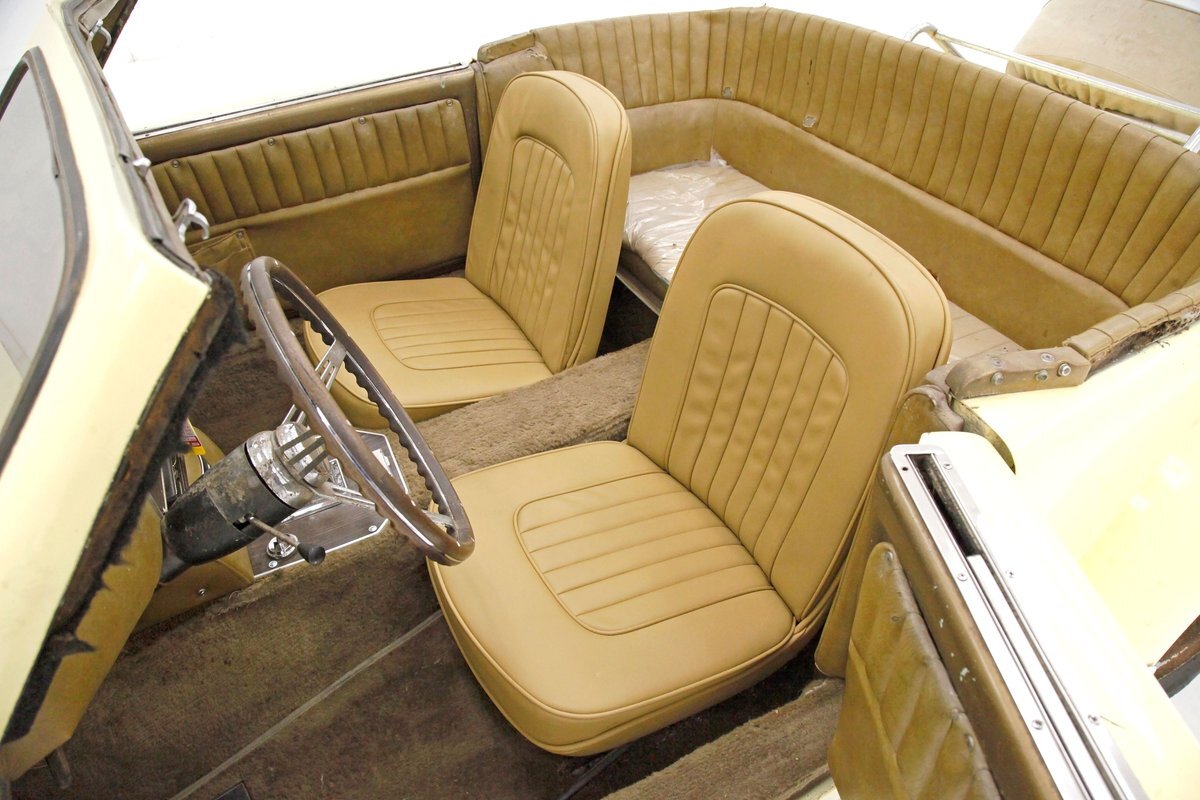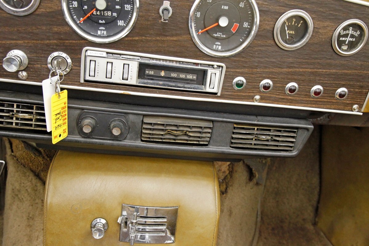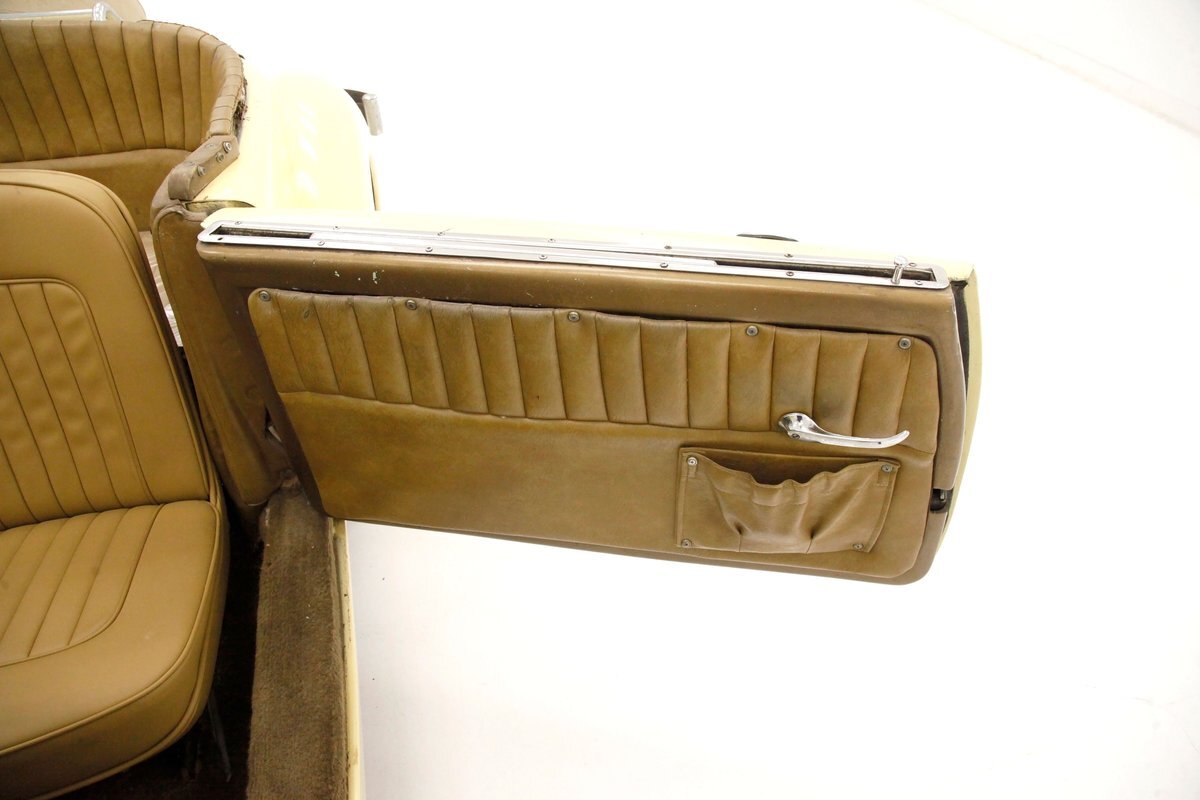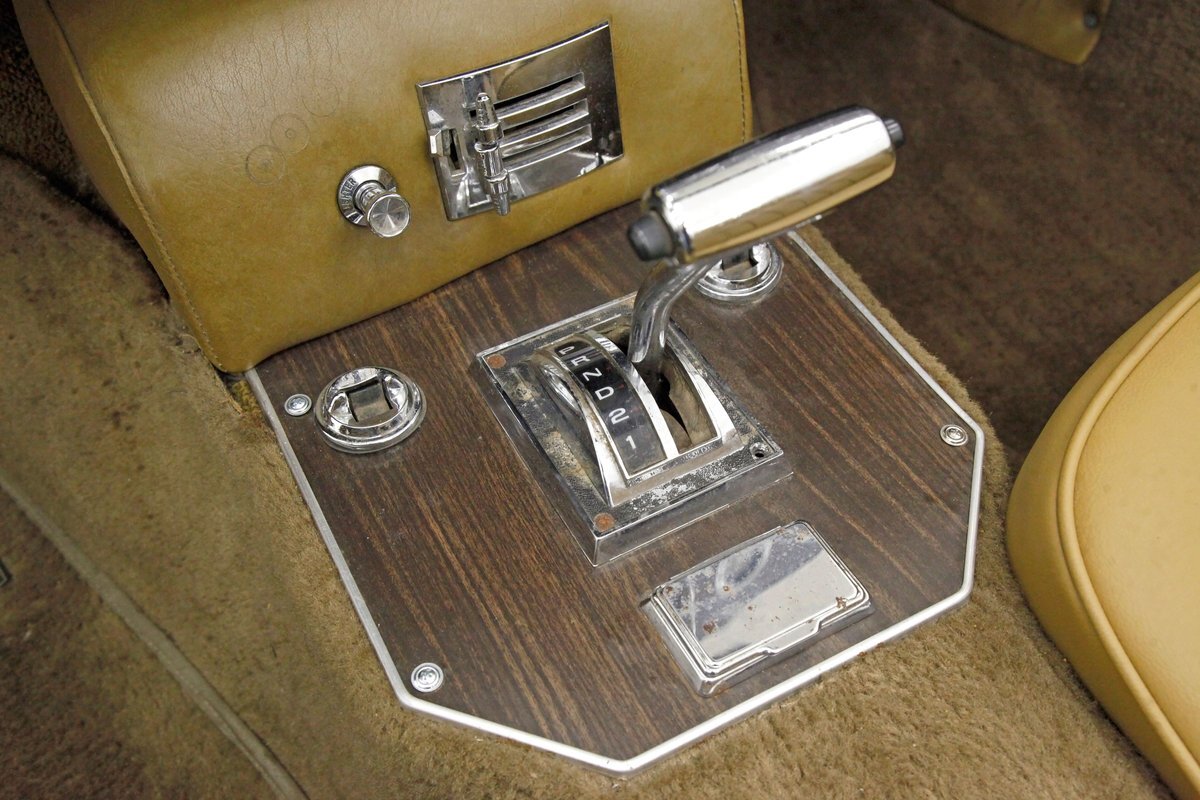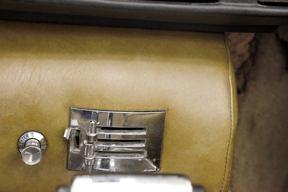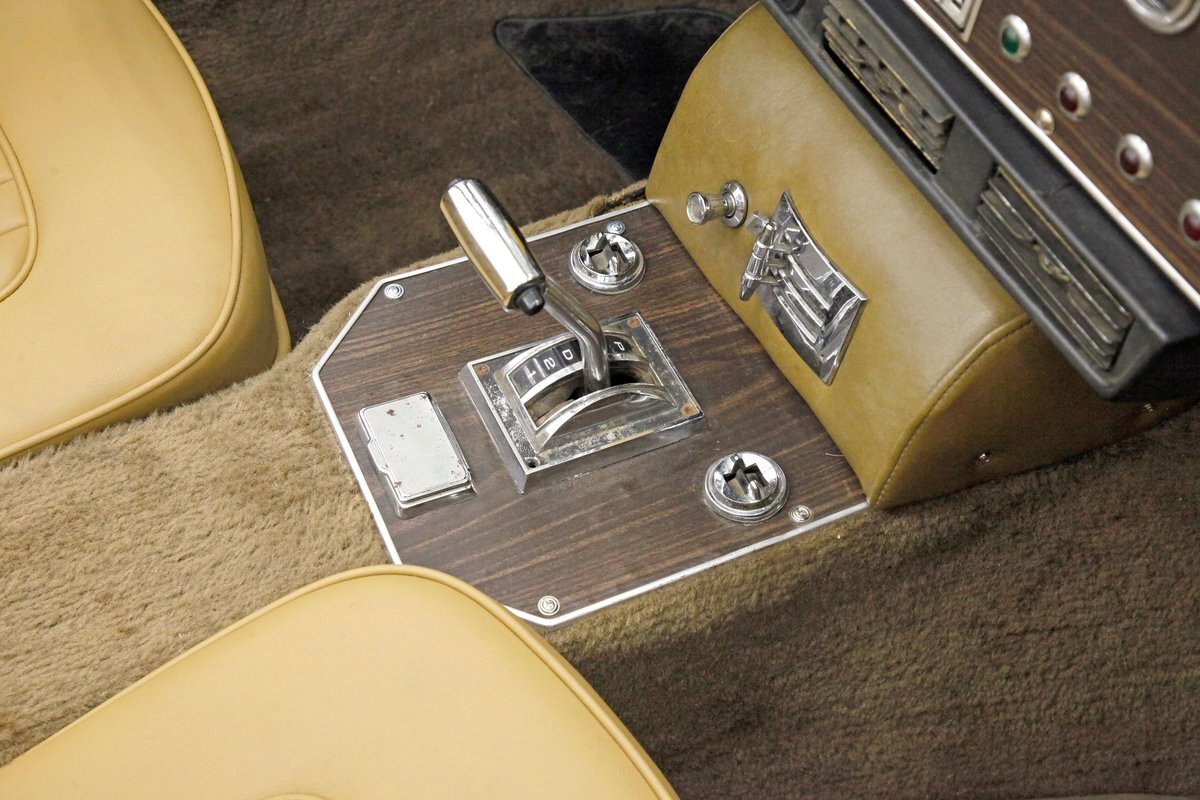 Swinging open the doors allows us a view of the inside panels and carpeted thresholds. Saddle vinyl covers the panels and mixes a smooth and tuck and roll pattern for some visual eye candy. The doors are suicide doors with the latch in the front of the door, and these doors have hidden hinges something that is a carryover of the original Cord cars. Shiny door actuators along with a painted taupe frame gives an expensive look. Inside, like new yellow tinted beige leather covers the low back bomber style buckets with nice tuck and roll inserts and smooth bolsters. In the back is an expansive bench seat with a new lower cushion and wrap around upper. Brown deep pile carpet with light soiling and overall wear floods the floors and covers the central hump. A consolette with a nice wood applique inlay surrounds the chrome T-handle shifter as well as the ashtray and chrome power window toggles. This meets up with a padded lower panel with chrome heater and AC slides that flows up to meet up with the flat faced undulating mustard brown padded dash. A central chrome trimmed and wood applique backed central instrument cluster pattern panel to house the black face round Jaeger instruments, chrome knobs and pulls. An AM/FM/8 Track radio hovers in this area with the output vents for the heat and AC just below.