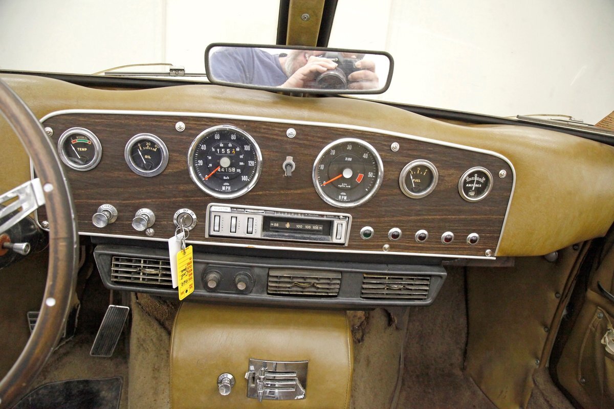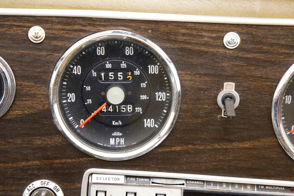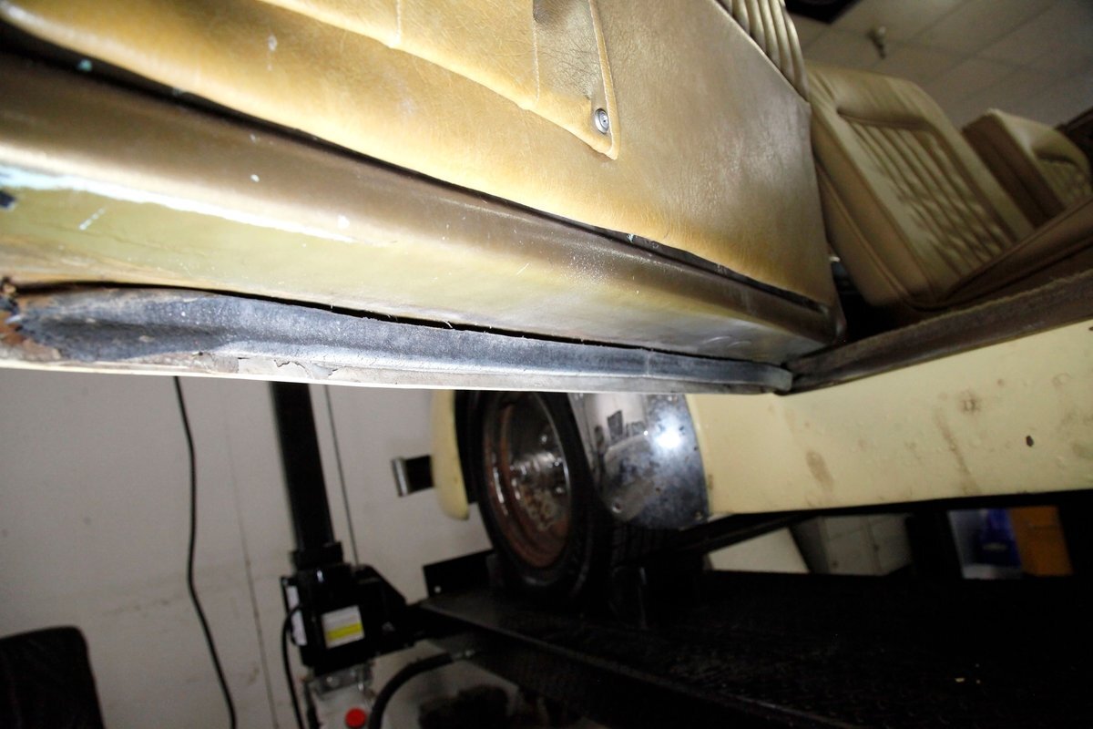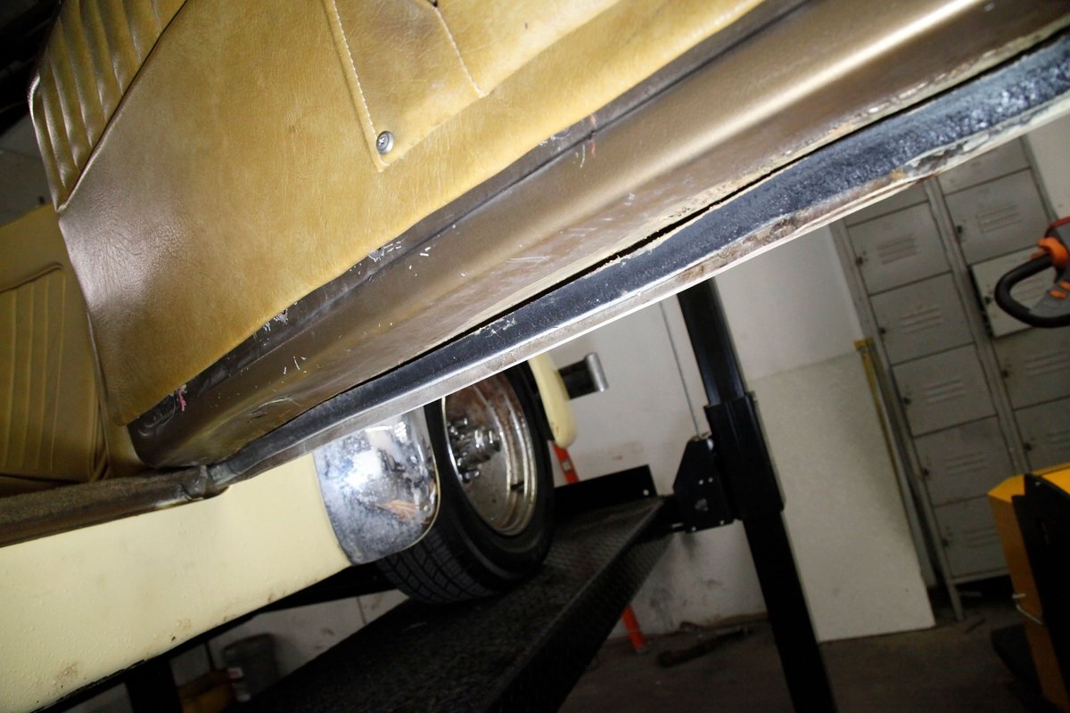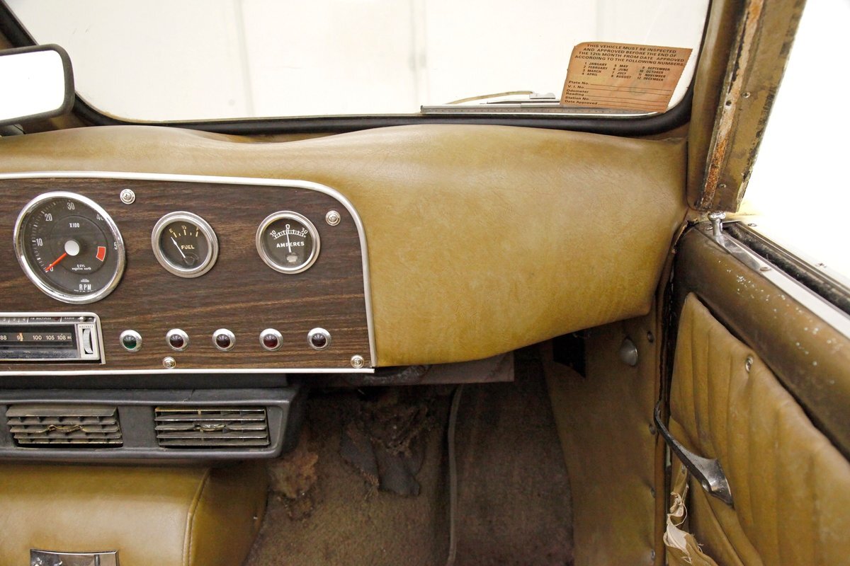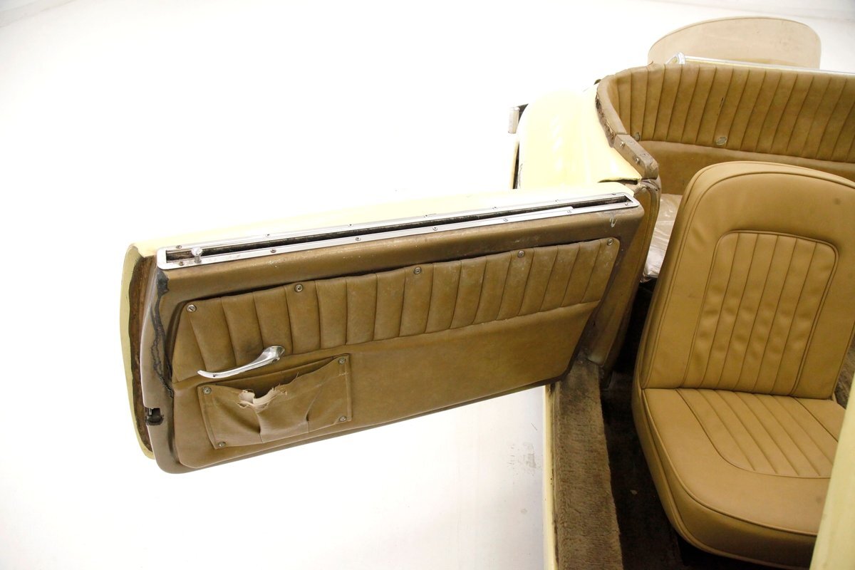 Swinging open the doors allows us a view of the inside panels and carpeted thresholds. Saddle vinyl covers the panels and mixes a smooth and tuck and roll pattern for some visual eye candy. The doors are suicide doors with the latch in the front of the door, and these doors have hidden hinges something that is a carryover of the original Cord cars. Shiny door actuators along with a painted taupe frame gives an expensive look. Inside, like new yellow tinted beige leather covers the low back bomber style buckets with nice tuck and roll inserts and smooth bolsters. In the back is an expansive bench seat with a new lower cushion and wrap around upper. Brown deep pile carpet with light soiling and overall wear floods the floors and covers the central hump. A consolette with a nice wood applique inlay surrounds the chrome T-handle shifter as well as the ashtray and chrome power window toggles. This meets up with a padded lower panel with chrome heater and AC slides that flows up to meet up with the flat faced undulating mustard brown padded dash. A central chrome trimmed and wood applique backed central instrument cluster pattern panel to house the black face round Jaeger instruments, chrome knobs and pulls. An AM/FM/8 Track radio hovers in this area with the output vents for the heat and AC just below.