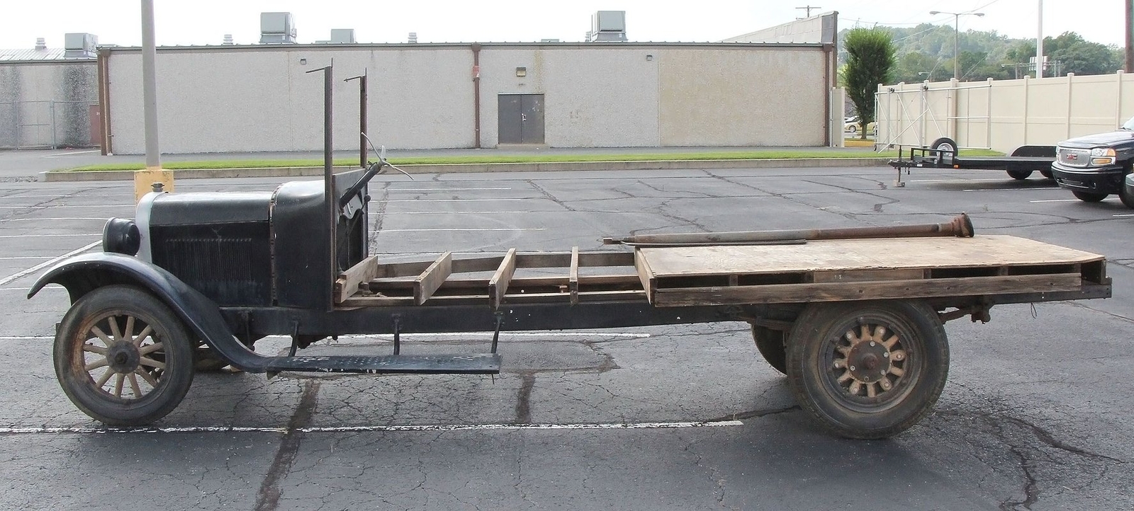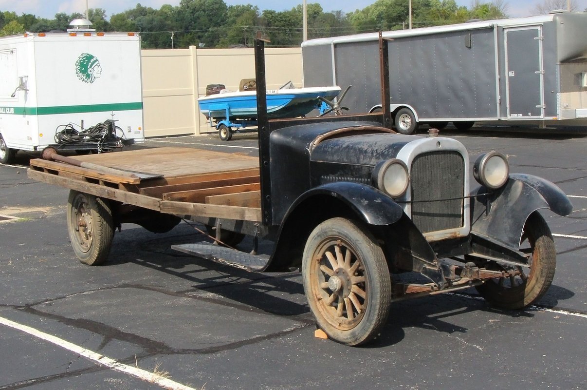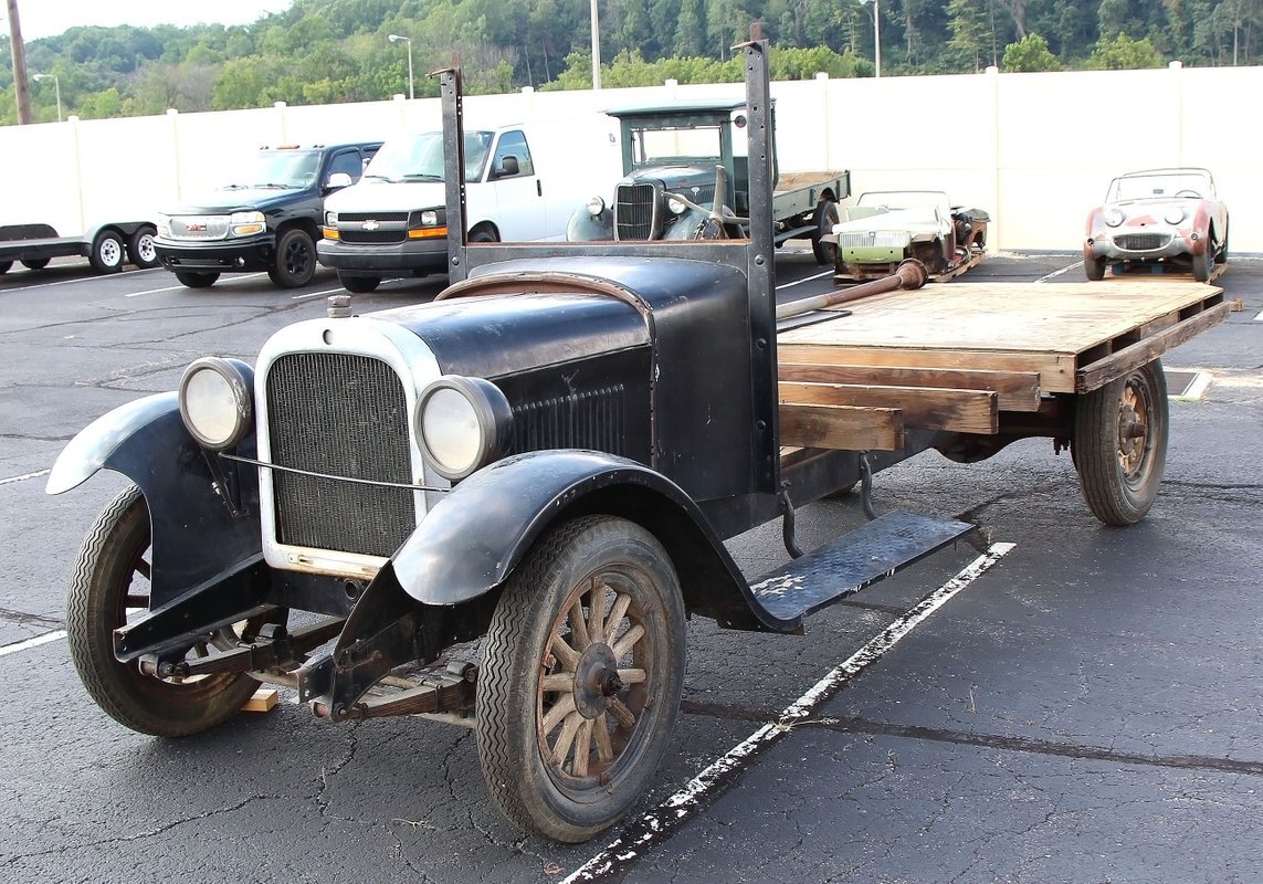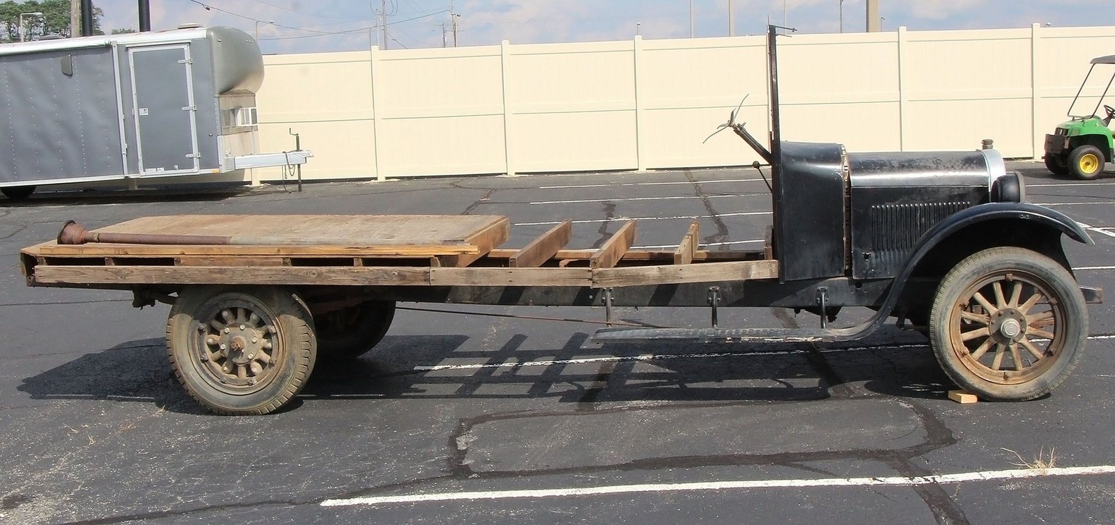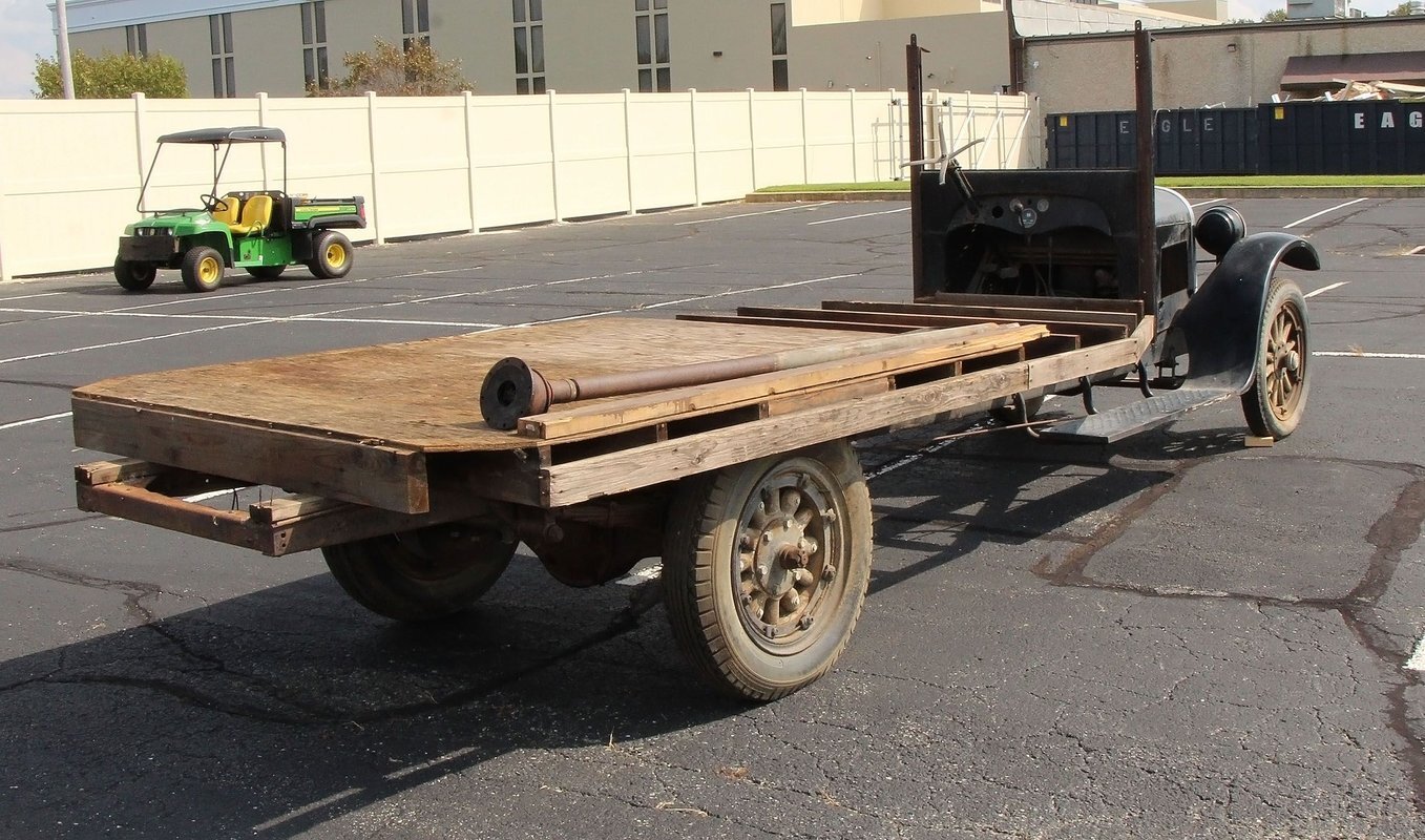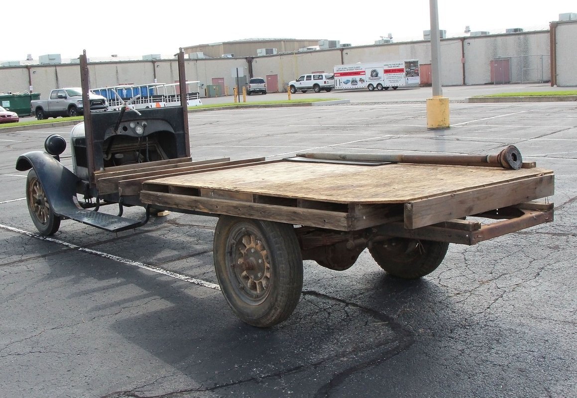For consignment, a flatbed truck built by the Dodge Brothers from 1927. This truck comes to us in unrestored form with a black steel front with little rust, and a wood framed bed, and no passenger compartment. Truly a blank canvas barn find, ready for the plucking from the Hallowed Halls of Classic Auto Mall.