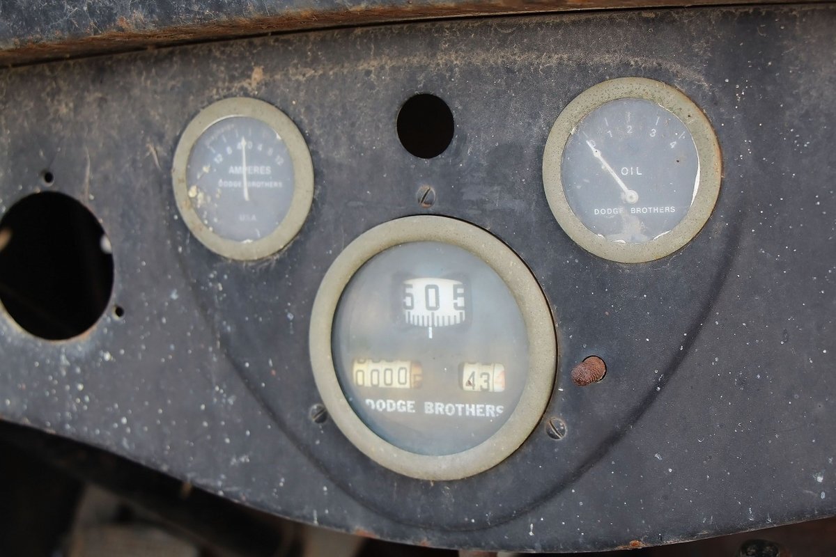 There isn't much to say here, as the interior and cab are gone, so let's just give the facts. The original black steel dash is present and fairly intact holding a few of the factory Dodge Brothers gauges. A few round openings are noted in this dash, most likely for other gauges, pulls, and knobs. The factory steering column rises from the exposed inner workings under the dash and is topped with silver 4 metal spokes that once held the steering wheel rim. The clutch and brake pedals are still intact and the long armed shifter rises from the exposed transmission.