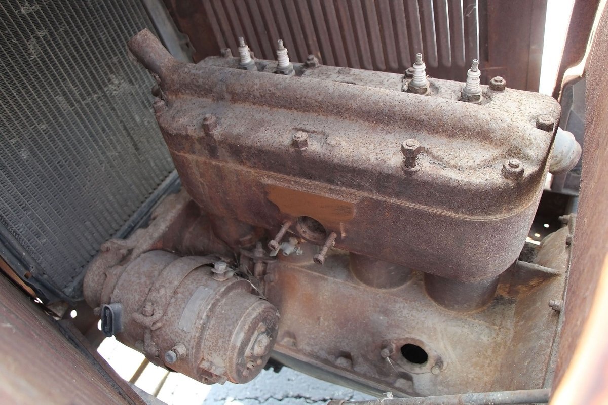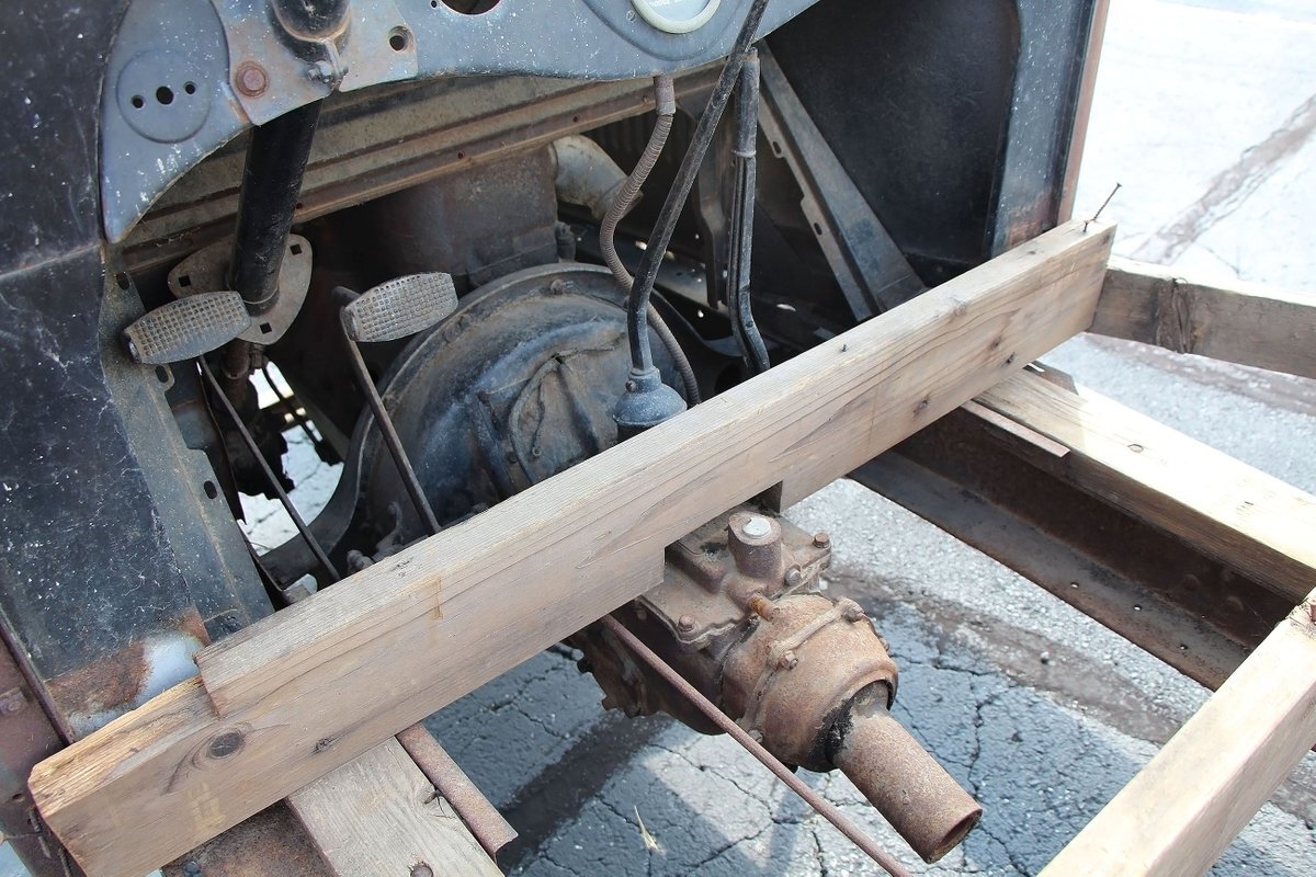 A 212ci L-headed 4-cylinder engine, gas powered, sits in an unrestored engine bay. We note the hoses, belts, wires, intake manifold and carburetor, and exhaust manifold have been removed and are missing. A 3-speed manual transmission is on back.