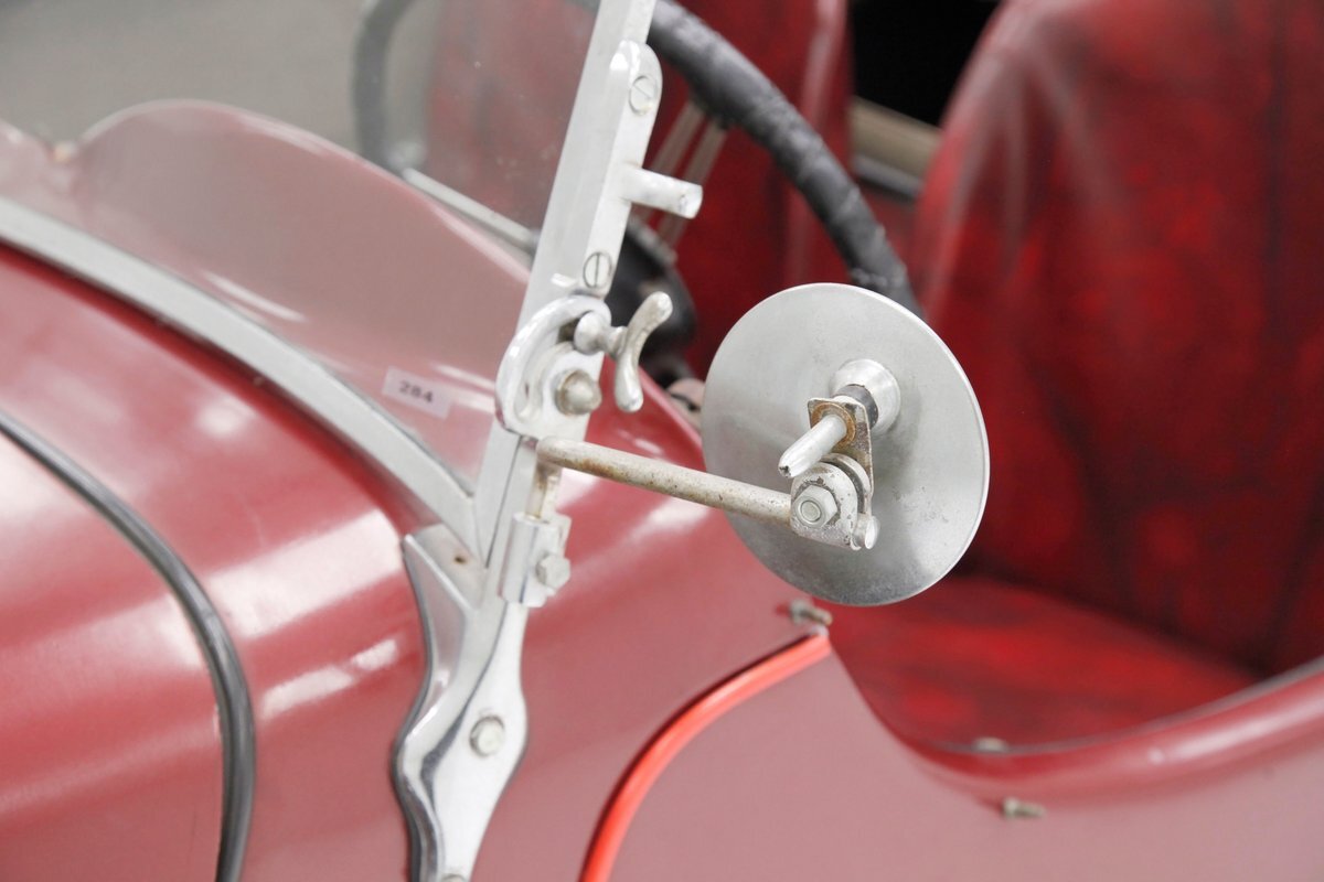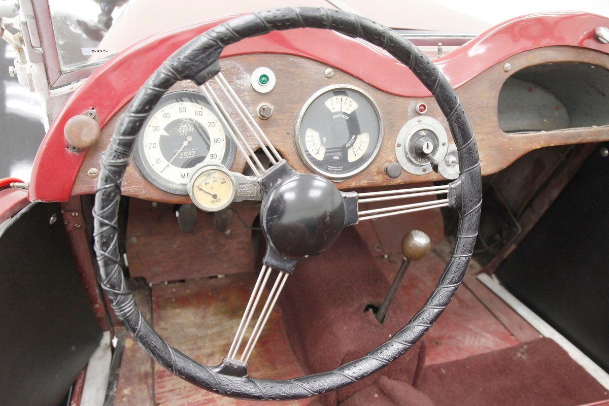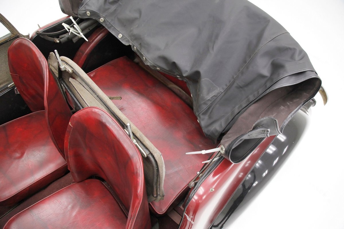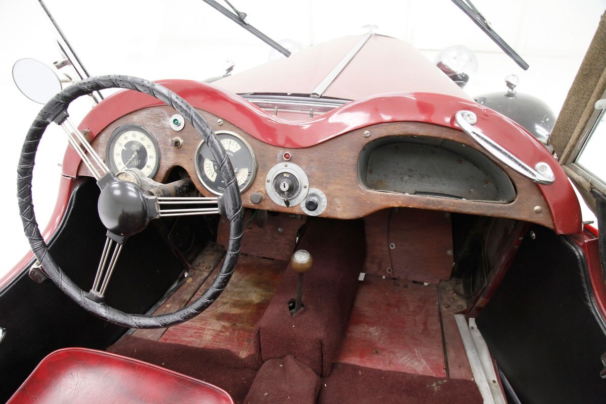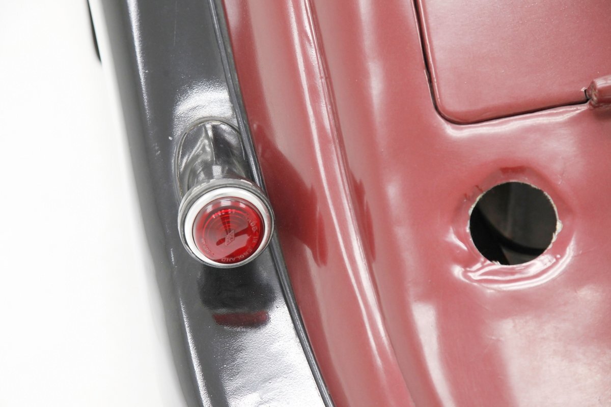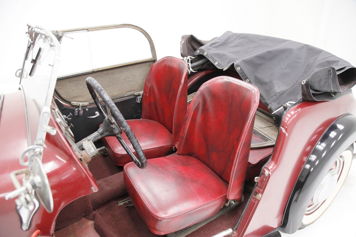 Flip open either door and gaze around at your passenger compartment where you'll see a wonderfully curved dual hump designed dash draped in aged walnut veneer with just a hint of maroon aluminum riding the wave of the top edge. A center mounted ignition/headlamp switch and choke pull is flanked by the instrument to the left and an open glovebox to the right. Fronting the curvaceous dash is the original steering wheel in full banjo style, presenting with a black leatherette cover and chromed ribs. Smooth oxblood marbled vinyl lowback bomber style bucket seats show little to no wear and have the convenience of a full back and individual bucket seats. The door panels are in black and are in just as good of shape as the seats, all nice. Red carpet covers the rear section of the floors and console as well as a small storage area behind the seats and under the convertible top stowage. The front floors are red painted sturdy wood...smashing baby!
