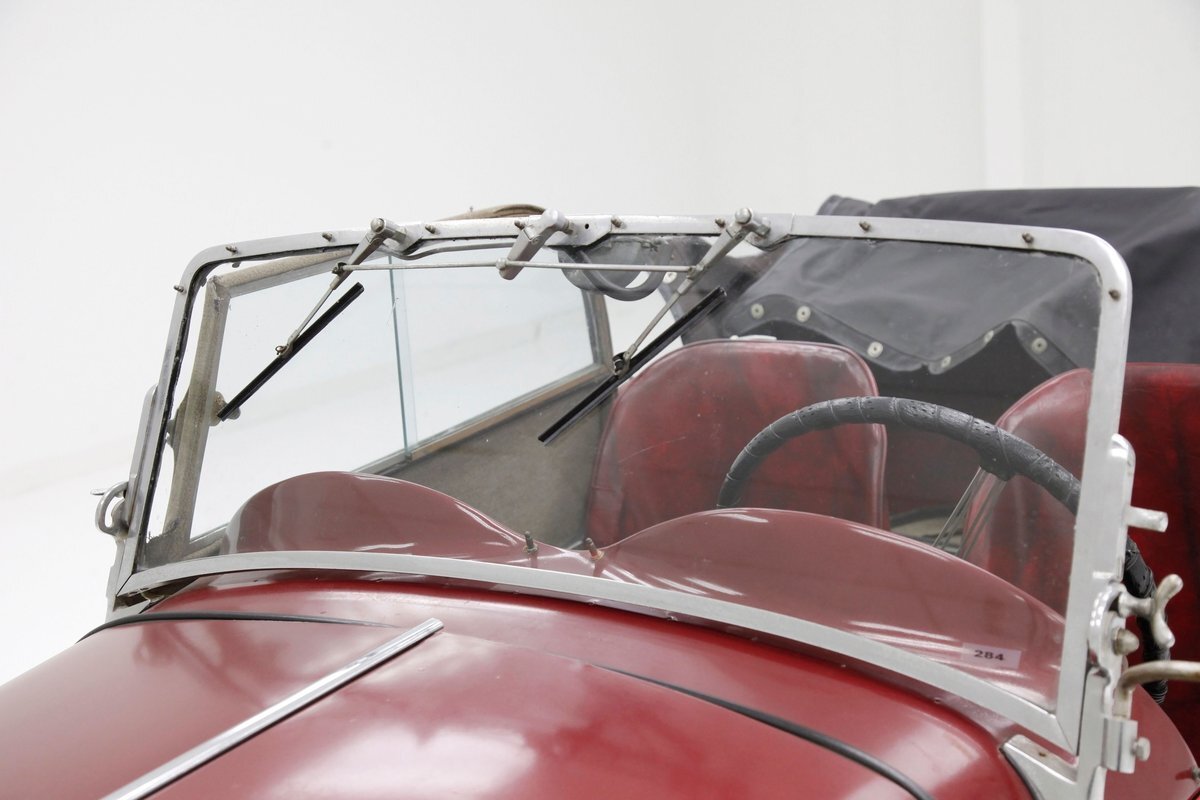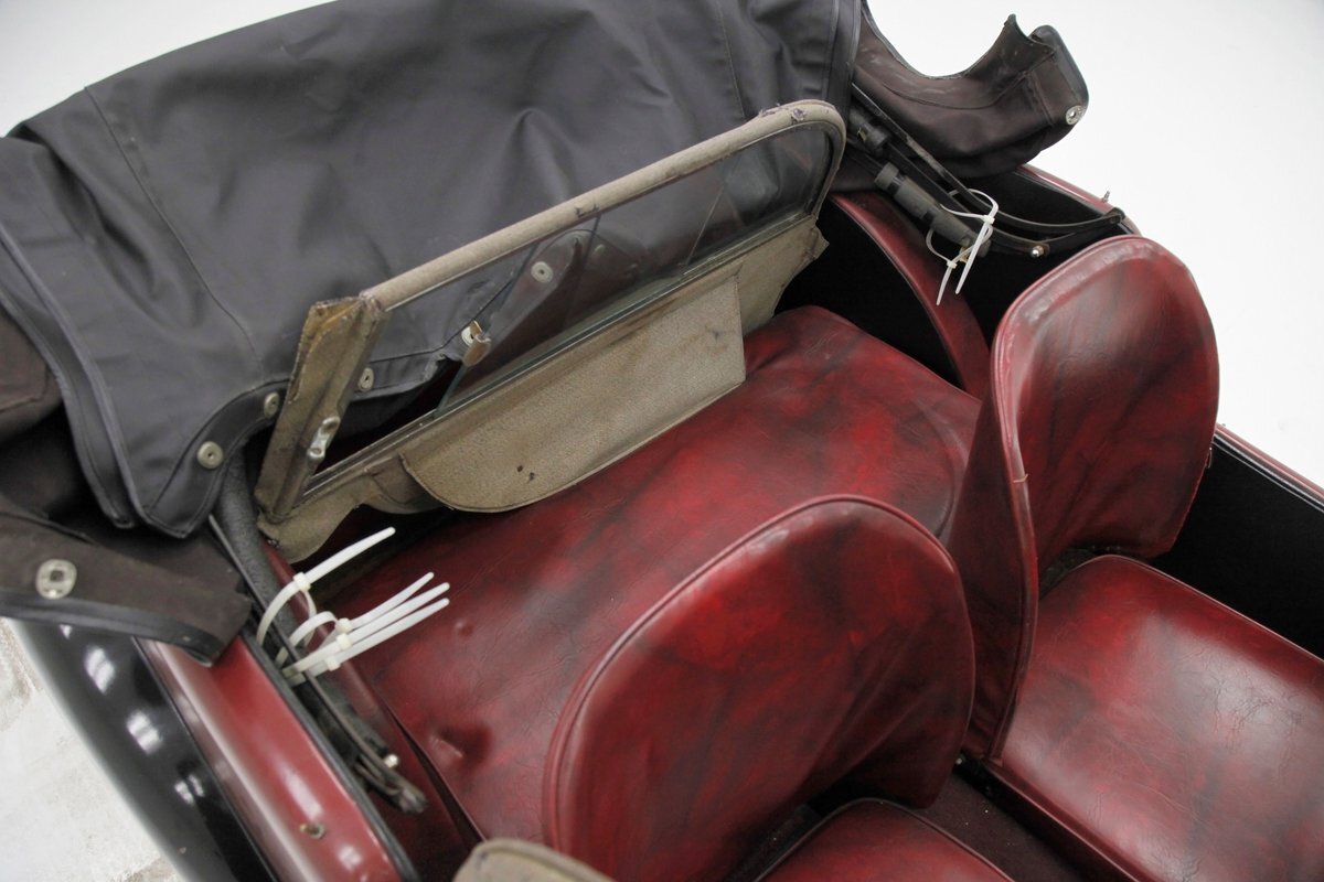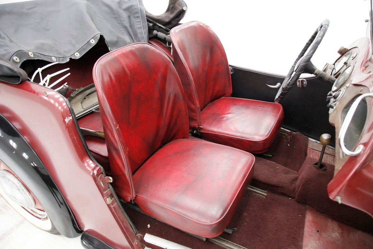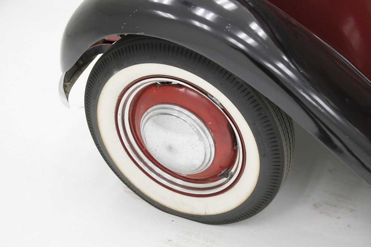 On the body tub, center hinged hood, and vented side panels maroon paint covers all the original aluminum that is fairly straight, gaps that are well minded and an aged but very presentable paint job. Curvaceous fenders grace the sides of the car and meet up via thin running boards. From fenders to running boards, body panels to hood flaps, trunk to rear bumper, there are a few notable faults in the form of dings, waves and dents. The front grille with correct chromed vertical slats which are surrounded by chrome and topped with the iconic factory swept back chromed radiator cap will leave you gazing when the car comes and goes. A black convertible top and tan canvas side panels are also included which are rarely seen, and all in usable condition. Dog dish wheel covers work with smooth maroon steel wheels wrapped in wide white wall tires on all 4 corners specing out at 5.25/5.50-16 rubber.