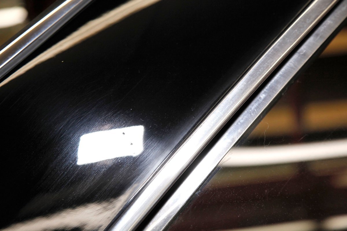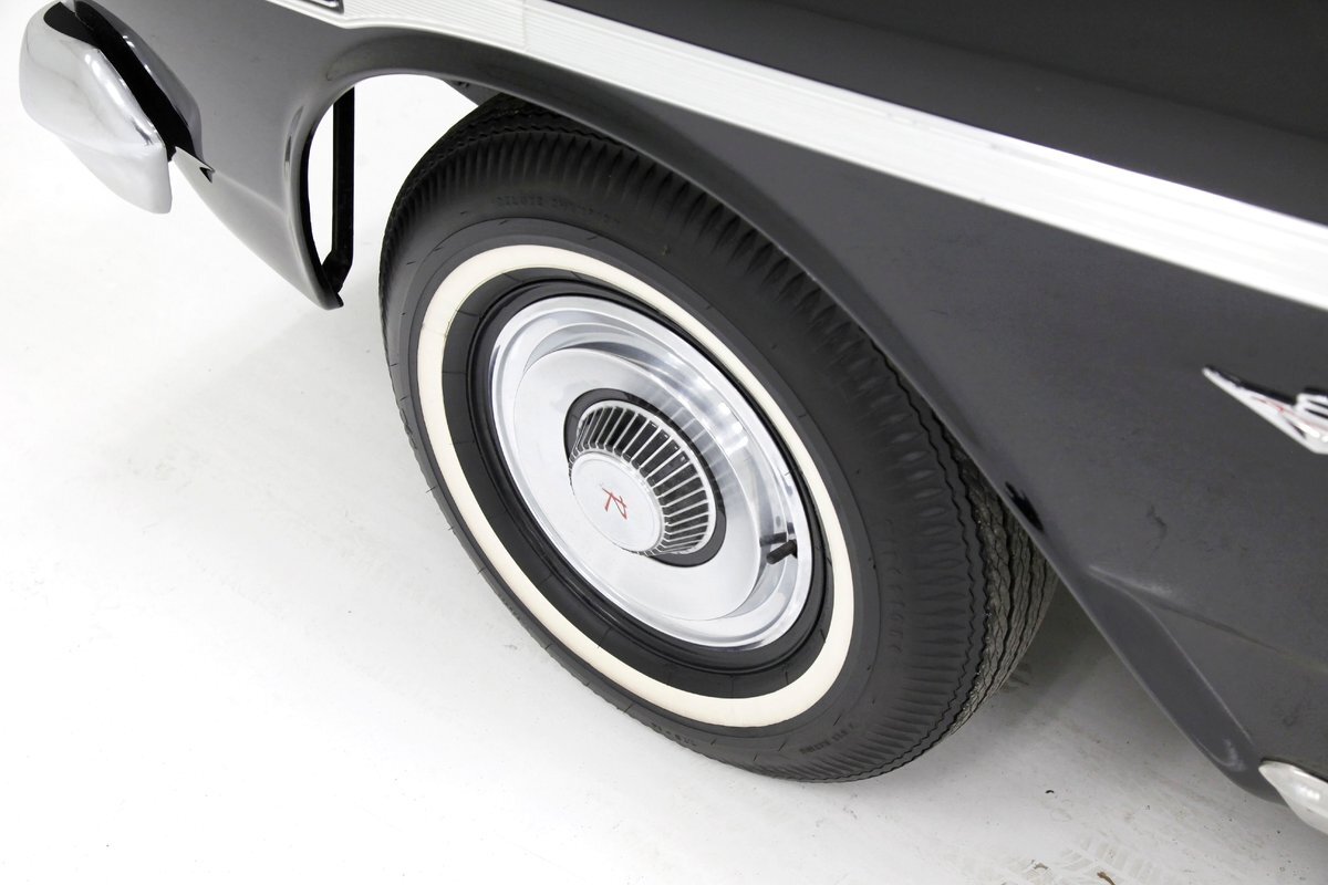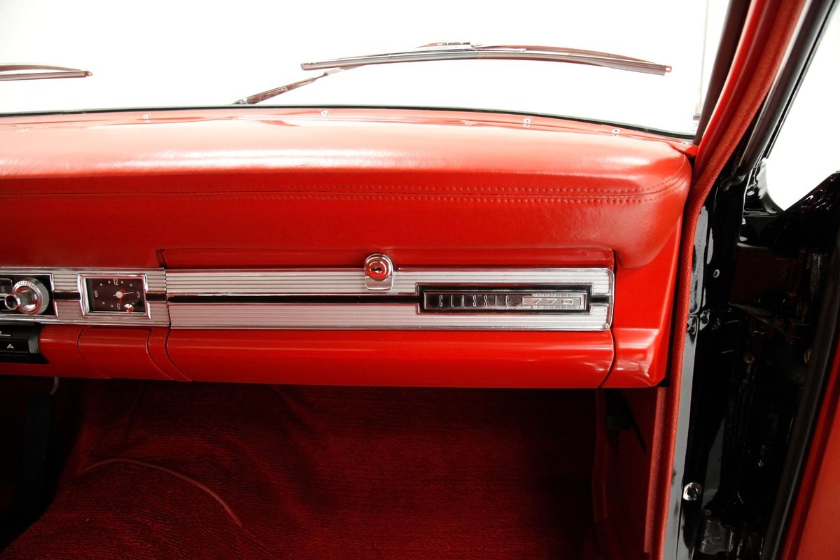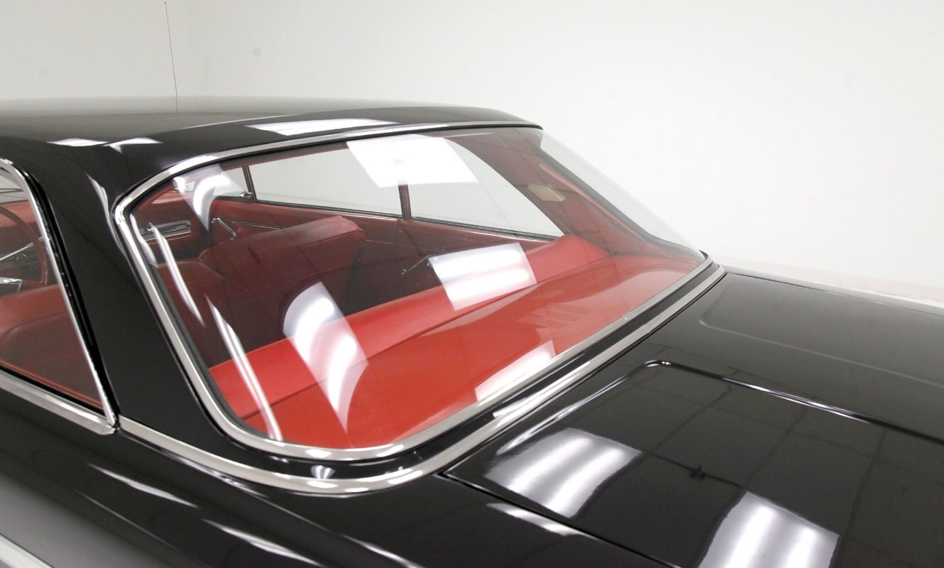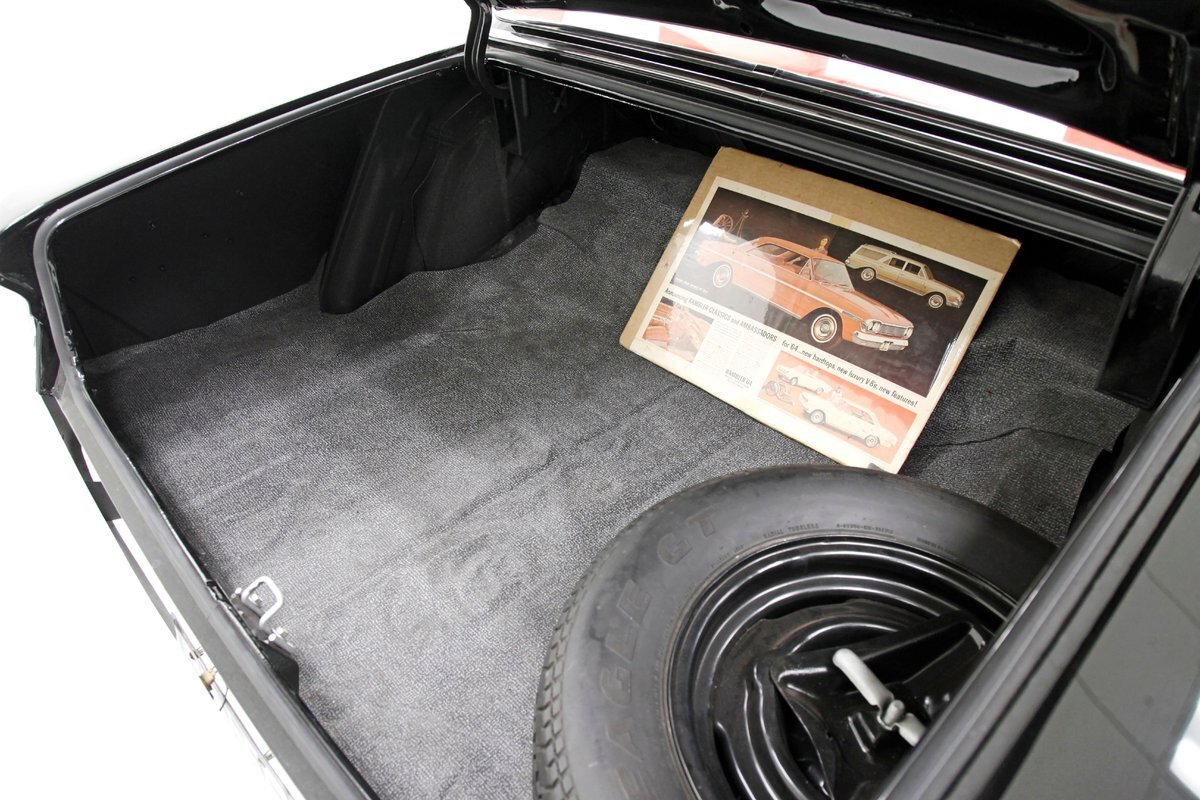 This Classic has been restored and now sports rust free steel, well minded gaps, and all bathed in a respray of glossy black from the deep end of the paint pool. A very simple line with few embellishments, gives this car an almost futuristic aero look. With its horizontal ribbed and divided grille, flanked by a round headlight on either side and a pristine bumper below, it has an air of sophisticated utilitarianism. A ribbed trim spear starts on each front quarter, covering the doors and finishing at the tail with a Classic emblem in your grandmother's script just below. The new for 64 stainless rocker trim connects the wheel houses and on the back the simplicity continues with a pair of elongated oval tail lights and reverse lights in the shiny bumper below. A nicely curved rear window is trimmed by shiny edging and wraps around the C pillar for a real greenhouse effect. Passenger windows have nice trimmings as does the windshield. Nice reverse dish wheel covers with finned centers and a badged italic R in the center are on and wrapped by thin whites on all 4 corners. A few inclusions are noted in the paint, especially on the C pillars and some small hazing spots are seen on the hood.