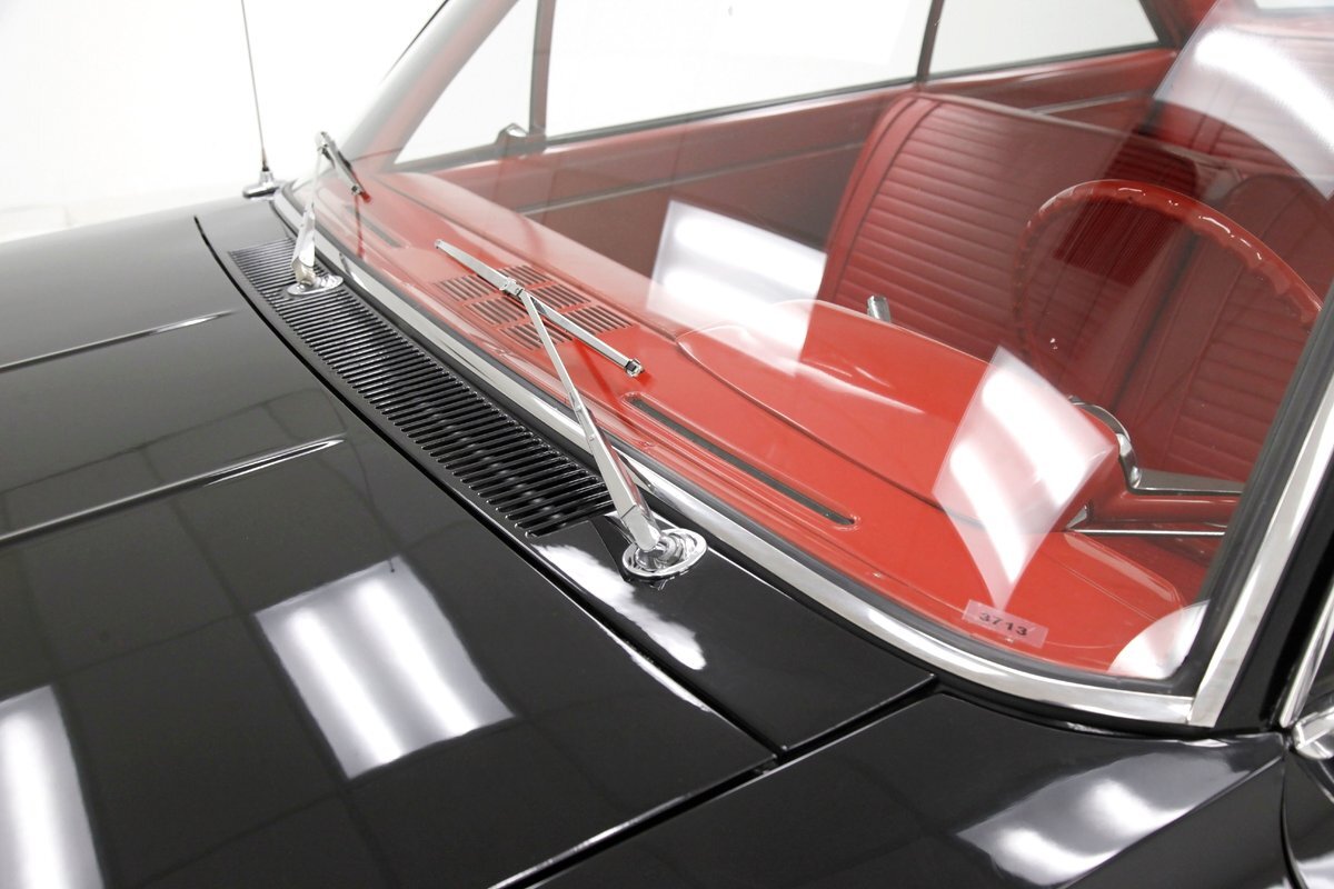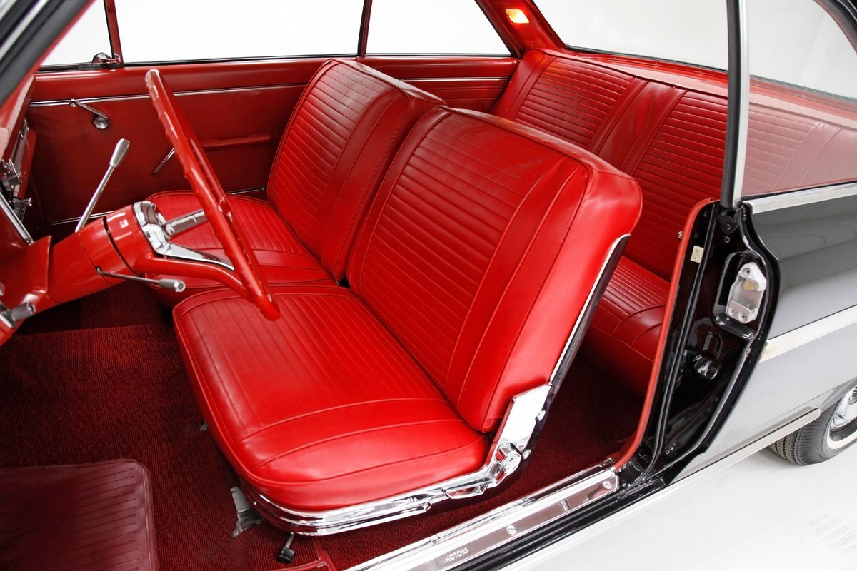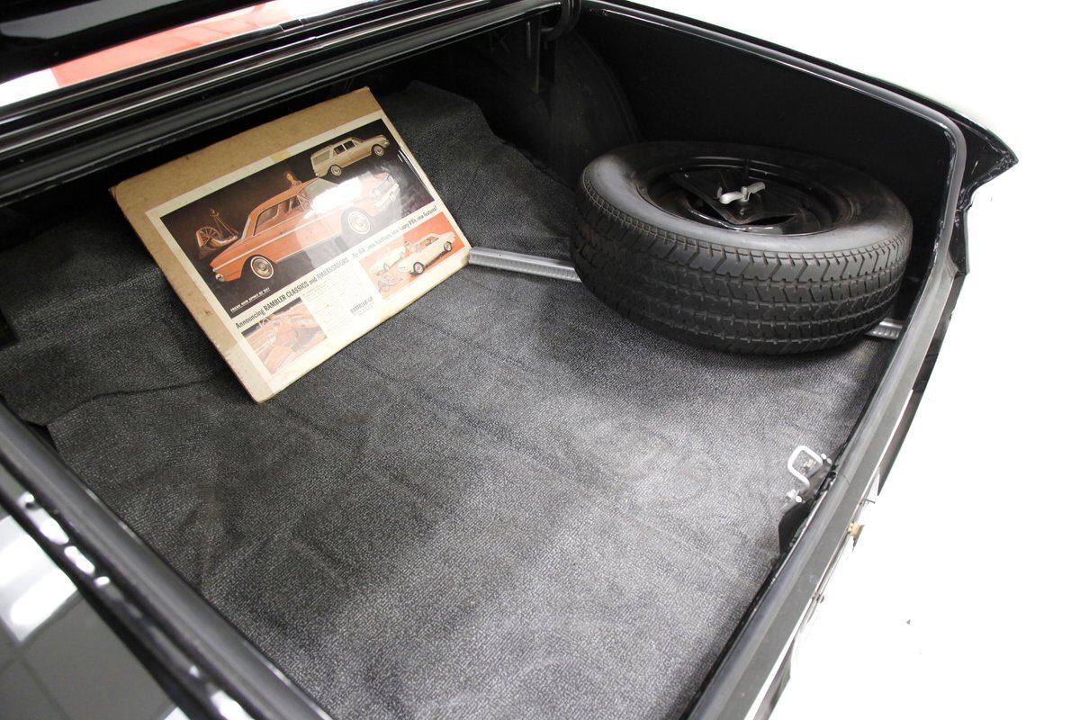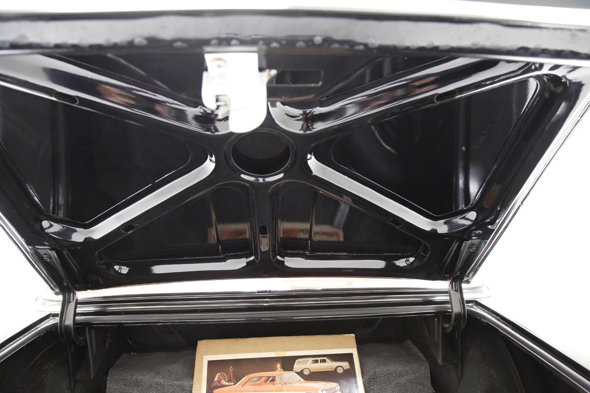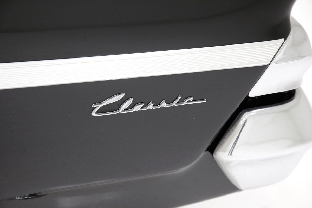 This Classic has been restored and now sports rust free steel, well minded gaps, and all bathed in a respray of glossy black from the deep end of the paint pool. A very simple line with few embellishments, gives this car an almost futuristic aero look. With its horizontal ribbed and divided grille, flanked by a round headlight on either side and a pristine bumper below, it has an air of sophisticated utilitarianism. A ribbed trim spear starts on each front quarter, covering the doors and finishing at the tail with a Classic emblem in your grandmother's script just below. The new for 64 stainless rocker trim connects the wheel houses and on the back the simplicity continues with a pair of elongated oval tail lights and reverse lights in the shiny bumper below. A nicely curved rear window is trimmed by shiny edging and wraps around the C pillar for a real greenhouse effect. Passenger windows have nice trimmings as does the windshield. Nice reverse dish wheel covers with finned centers and a badged italic R in the center are on and wrapped by thin whites on all 4 corners. A few inclusions are noted in the paint, especially on the C pillars and some small hazing spots are seen on the hood.