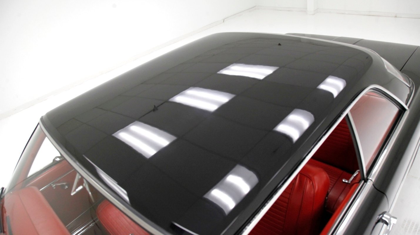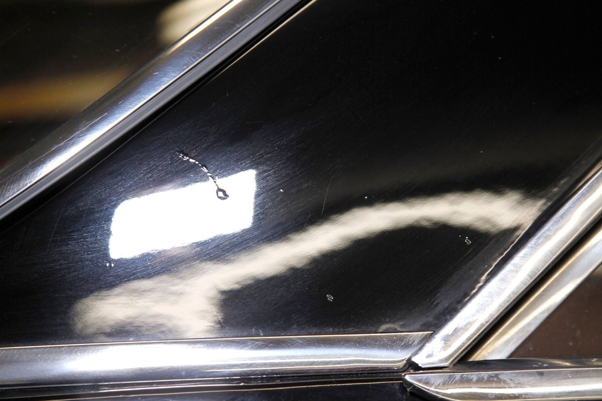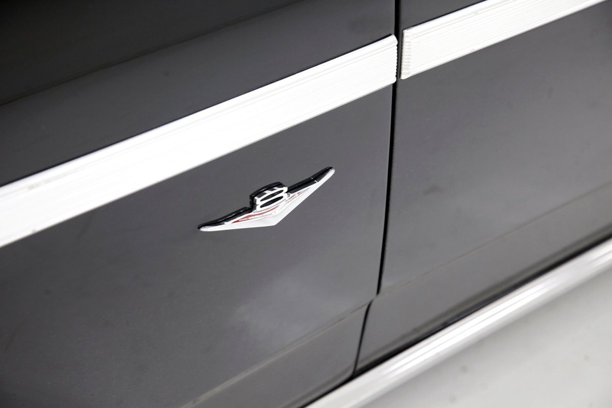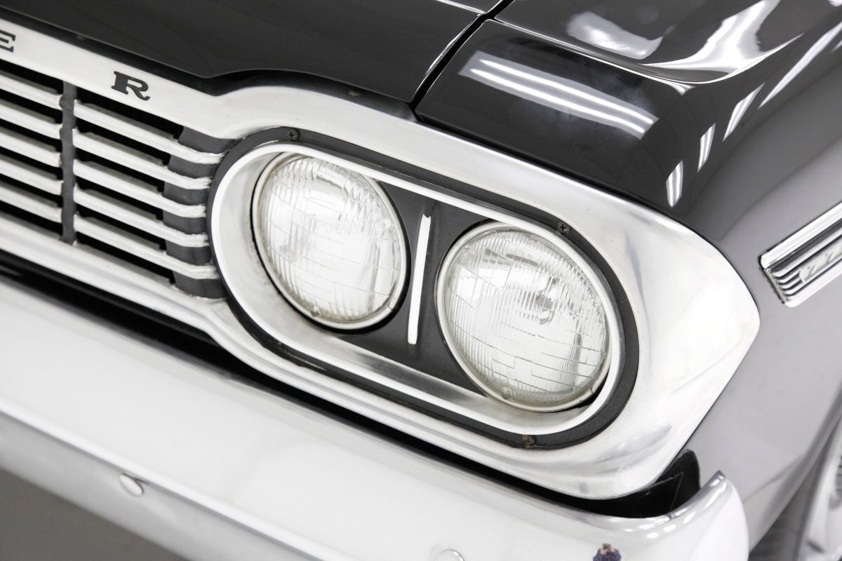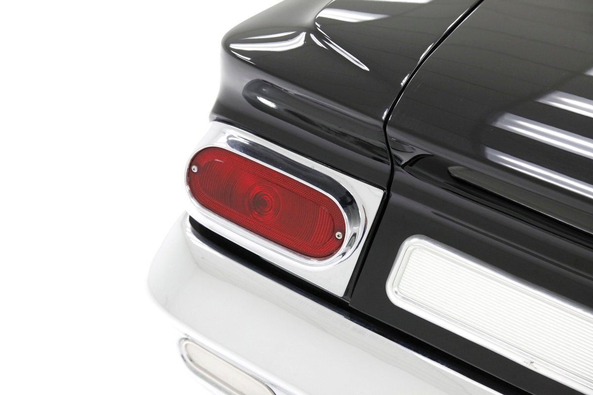 This Classic has been restored and now sports rust free steel, well minded gaps, and all bathed in a respray of glossy black from the deep end of the paint pool. A very simple line with few embellishments, gives this car an almost futuristic aero look. With its horizontal ribbed and divided grille, flanked by a round headlight on either side and a pristine bumper below, it has an air of sophisticated utilitarianism. A ribbed trim spear starts on each front quarter, covering the doors and finishing at the tail with a Classic emblem in your grandmother's script just below. The new for 64 stainless rocker trim connects the wheel houses and on the back the simplicity continues with a pair of elongated oval tail lights and reverse lights in the shiny bumper below. A nicely curved rear window is trimmed by shiny edging and wraps around the C pillar for a real greenhouse effect. Passenger windows have nice trimmings as does the windshield. Nice reverse dish wheel covers with finned centers and a badged italic R in the center are on and wrapped by thin whites on all 4 corners. A few inclusions are noted in the paint, especially on the C pillars and some small hazing spots are seen on the hood.