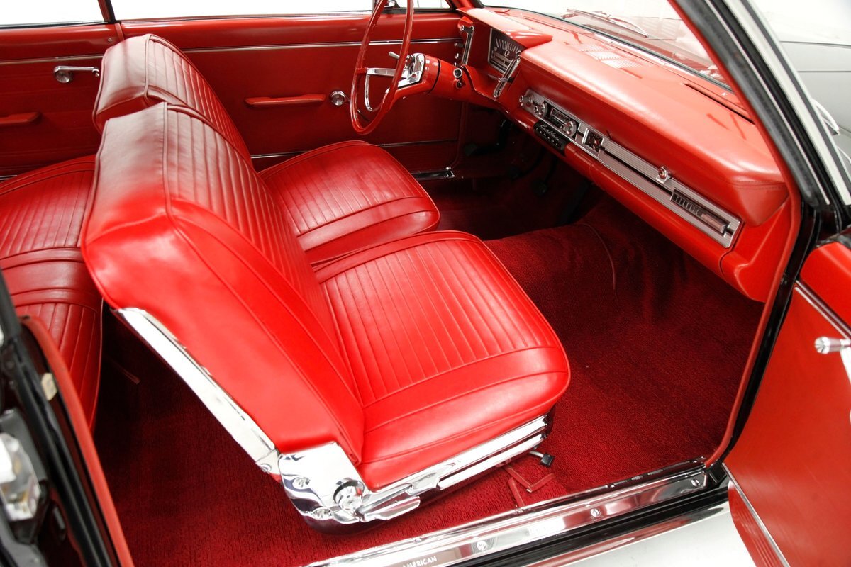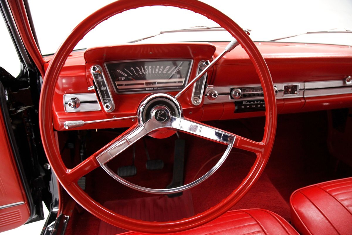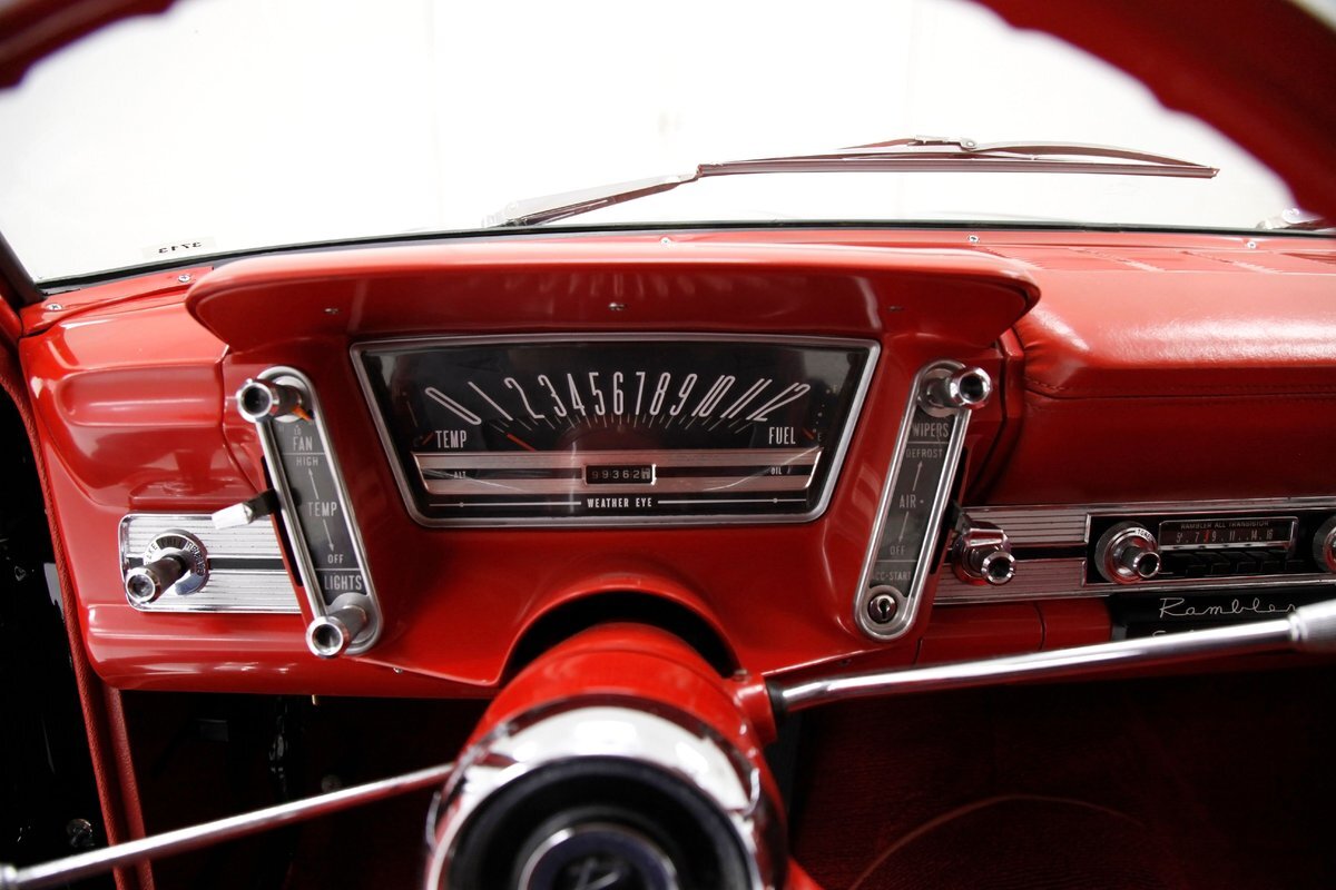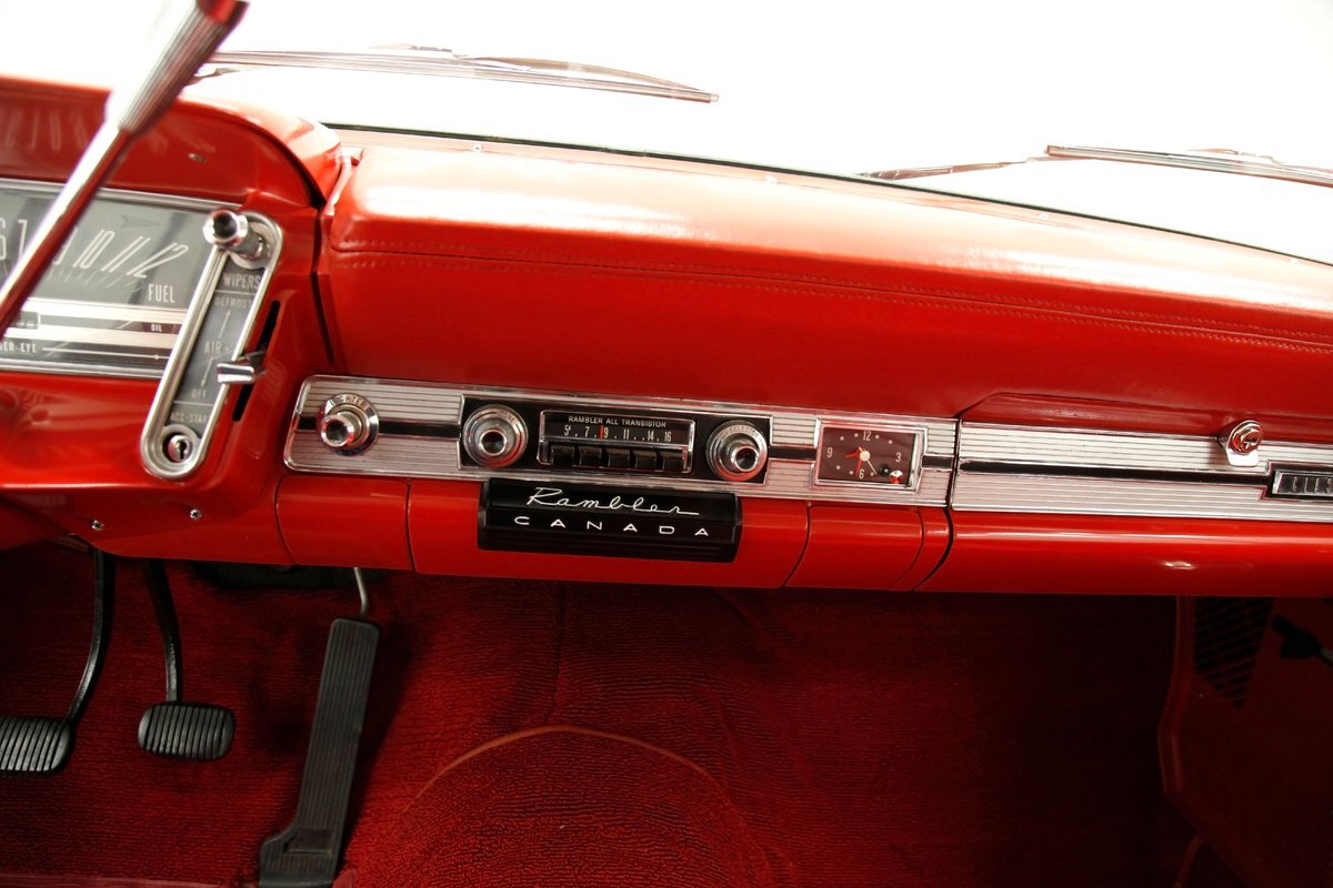 As we swing the doors fully open, we see horizontal and vertical textures that dance together with chrome spears, all produced in vinyl and covering the door panels. Oversized bucket seats with red horizontal tuck and roll stitched vinyl make up the seat inserts which are bordered by piping in red and smooth red vinyl bolsters all clean and pristine. This pattern holds true for the rear bench, and these are floating in a sea of deep red carpeting very clean too! The dash brings back great memories as the 1963 version of this car was this writer's college car courtesy my grandmother who had put only 21,000 miles on my car prior to me taking it over in 1978. That car was a real hit, and this one is even nicer, so catch the wind to get over here. I digress, though, and for the dash an elongated aluminum rectangle has a fanned-out speedometer in the middle flanked on the sides by the heater and wiper controls, all hiding under a red steel eyebrow. The factory radio resides front and center in more ribbed aluminum and just below is a Rambler Canada badge to denote this car's assembly lineage. A note to the trunk which is lined with like new vinyl and contains the spare and original jack and stand.