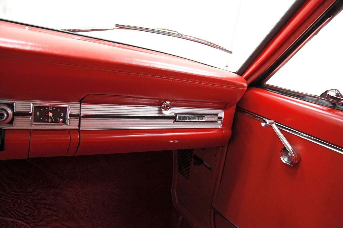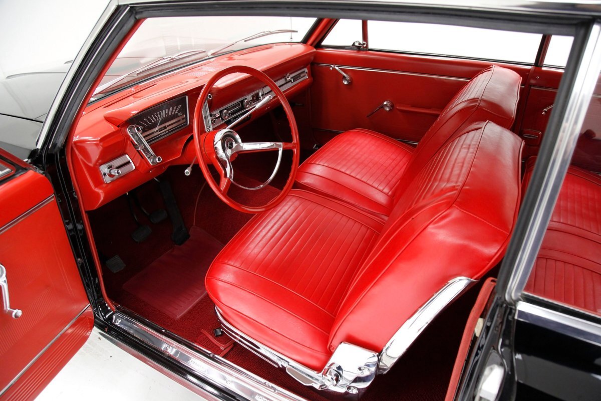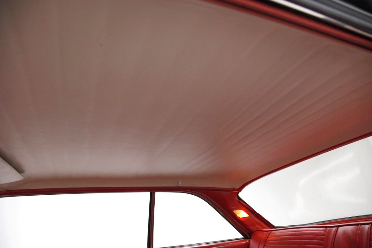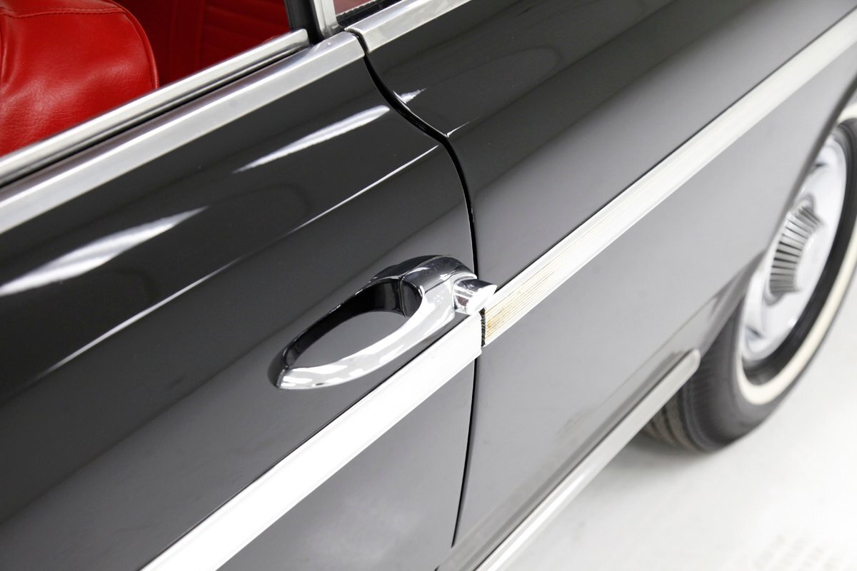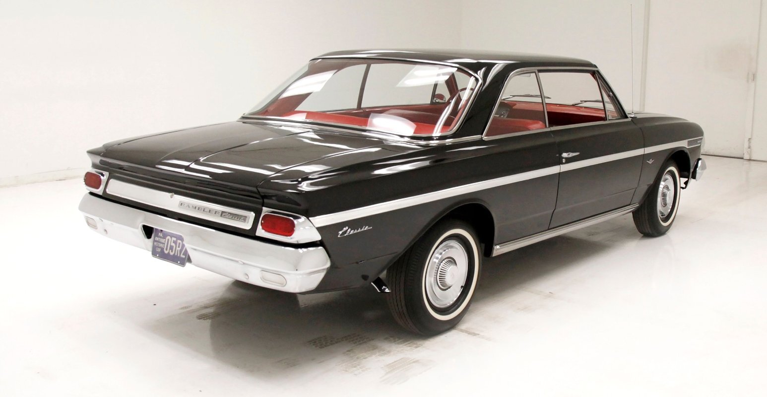 As we swing the doors fully open, we see horizontal and vertical textures that dance together with chrome spears, all produced in vinyl and covering the door panels. Oversized bucket seats with red horizontal tuck and roll stitched vinyl make up the seat inserts which are bordered by piping in red and smooth red vinyl bolsters all clean and pristine. This pattern holds true for the rear bench, and these are floating in a sea of deep red carpeting very clean too! The dash brings back great memories as the 1963 version of this car was this writer's college car courtesy my grandmother who had put only 21,000 miles on my car prior to me taking it over in 1978. That car was a real hit, and this one is even nicer, so catch the wind to get over here. I digress, though, and for the dash an elongated aluminum rectangle has a fanned-out speedometer in the middle flanked on the sides by the heater and wiper controls, all hiding under a red steel eyebrow. The factory radio resides front and center in more ribbed aluminum and just below is a Rambler Canada badge to denote this car's assembly lineage. A note to the trunk which is lined with like new vinyl and contains the spare and original jack and stand.