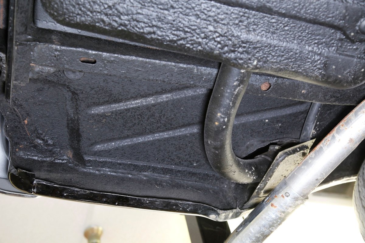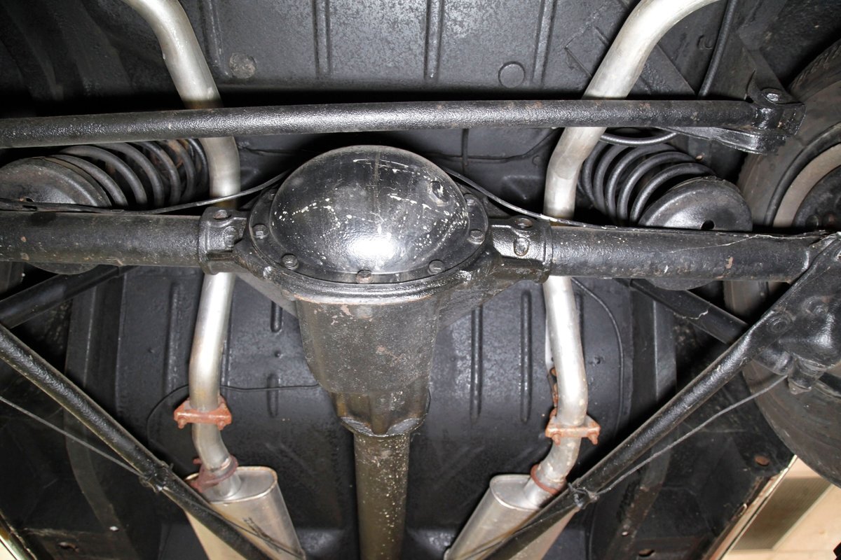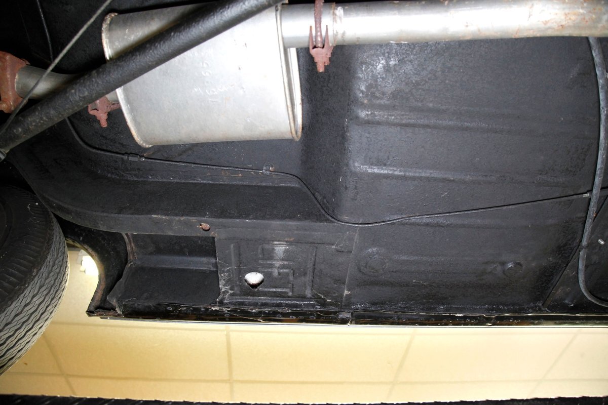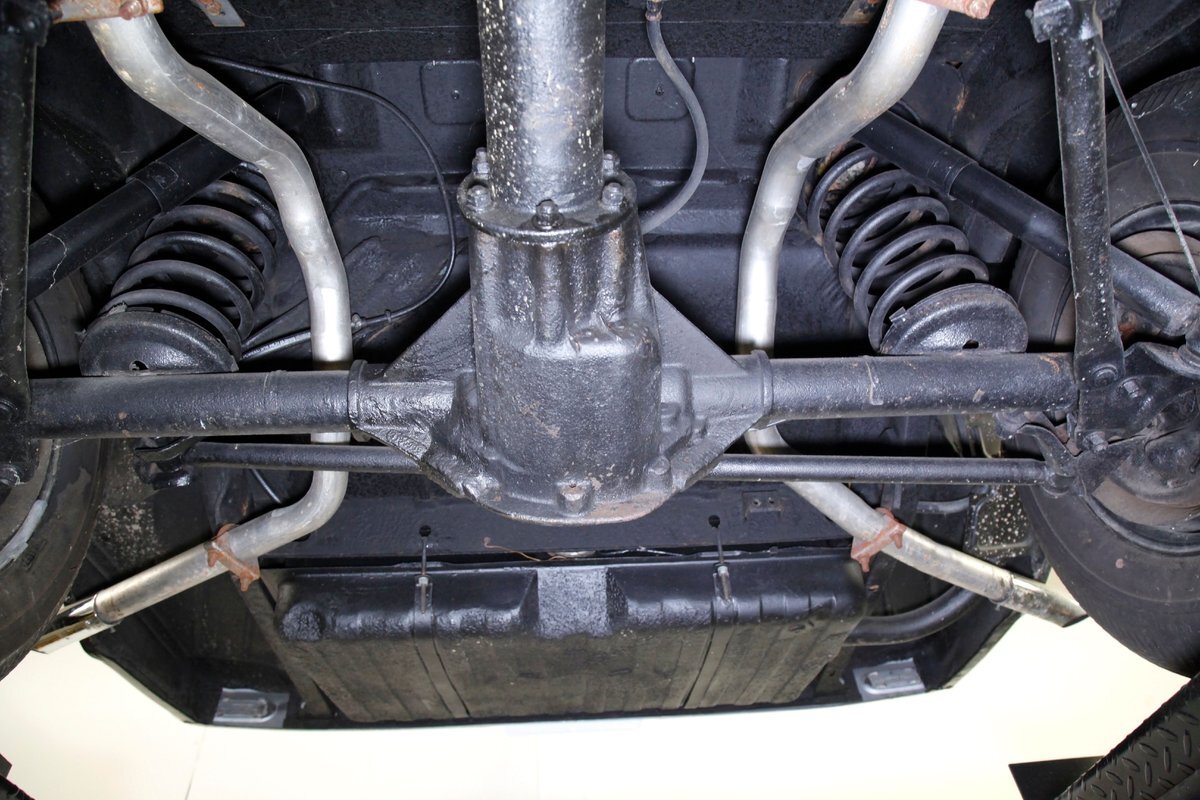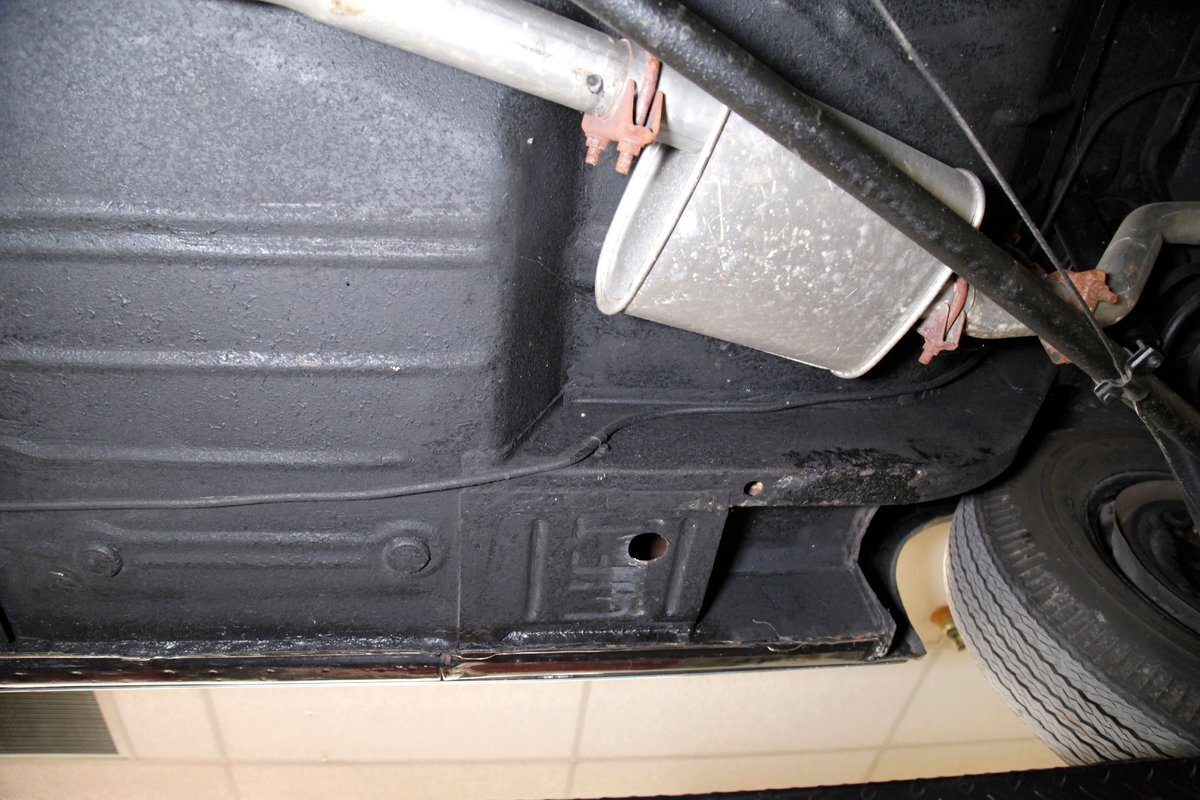 Up in the Classic Auto Mall air atop the lift, we can peruse the undercarriage, which has some patina, strong steel and is an early version of unibody construction. Structurally sound, no rust, with drum brakes all around, and the typical independent coil spring suspension upfront, and a swing arm with coil spring designation on the rear. Dual exhaust is on with Turbo style mufflers and looking good.